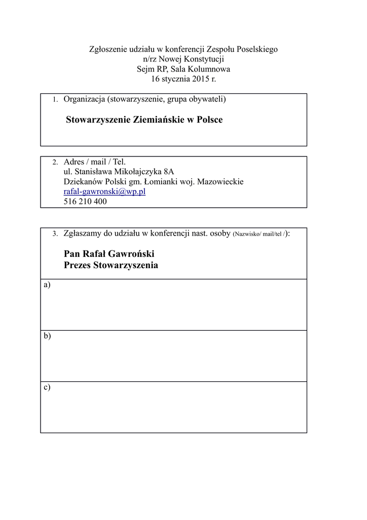 Zgłoszenie udziału w konferencji Zespołu Poselskiego n/rz Nowej Konstytucji Sejm RP, Sala Kolumnowa 16 stycznia 2015 r. 1. Organizacja (stowarzyszenie, grupa obywateli) Stowarzyszenie Ziemiańskie w Polsce 2. Adres / mail / Tel. ul. Stanisława Mikołajczyka 8A Dziekanów Polski gm. Łomianki woj. Mazowieckie [email protected] 516 210 400 3. Zgłaszamy do udziału w konferencji nast. osoby (Nazwisko/ mail/tel /): Pan Rafał Gawroński Prezes Stowarzyszenia a) b) c) d)