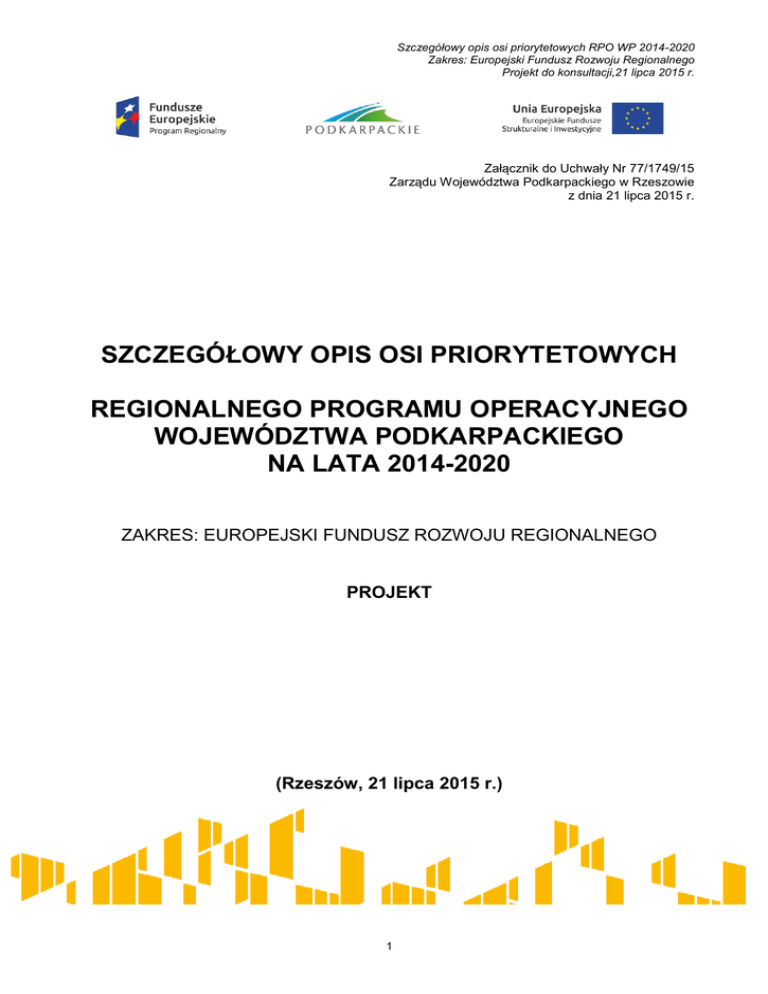 Szczegółowy opis osi priorytetowych RPO WP 2014-2020 Zakres: Europejski Fundusz Rozwoju Regionalnego Projekt do konsultacji,21 lipca 2015 r. Załącznik do Uchwały Nr 77/1749/15 Zarządu Województwa Podkarpackiego w Rzeszowie z dnia 21 lipca 2015 r. SZCZEGÓŁOWY OPIS OSI PRIORYTETOWYCH REGIONALNEGO PROGRAMU OPERACYJNEGO WOJEWÓDZTWA PODKARPACKIEGO NA LATA 2014-2020 ZAKRES: EUROPEJSKI FUNDUSZ ROZWOJU REGIONALNEGO PROJEKT (Rzeszów, 21 lipca 2015 r.) 1 Szczegółowy opis osi priorytetowych RPO WP 2014-2020 Zakres: Europejski Fundusz Rozwoju Regionalnego Projekt do konsultacji,21 lipca 2015 r. Spis treści I. OGÓLNY OPIS REGIONALNEGO PROGRAMU OPERACYJNEGO WOJEWÓDZTWA PODKARPACKIEGO NA LATA 2014-2020 ORAZ GŁÓWNYCH WARUNKÓW REALIZACJI...... 4 II. OPIS POSZCZEGÓLNYCH OSI PRIORYTETOWYCH RPO WP 2014-2020 ORAZ POSZCZEGÓLNYCH DZIAŁAŃ/ PODDZIAŁAŃ ........................................................................ 23 OŚ PRIORYTETOWA I. KONKURENCYJNA I INNOWACYJNA GOSPODARKA .................. 23 DZIAŁANIE 1.1 WSPARCIE INFRASTRUKTURY B+R JEDNOSTEK NAUKOWYCH ........ 24 DZIAŁANIE 1.2 BADANIA PRZEMYSŁOWE, PRACE ROZWOJOWE ORAZ ICH WDROŻENIA ...................................................................................................................... 31 DZIAŁANIE 1.3 PROMOWANIE PRZEDSIĘBIORCZOŚCI ................................................. 45 DZIAŁANIE 1.4 WSPARCIE MŚP ....................................................................................... 59 OŚ PRIORYTETOWA II. CYFROWE PODKARPACKIE ......................................................... 68 DZIAŁANIE 2.1 PODNIESIENIE EFEKTYWNOSCI I DOSTĘPNOŚCI E-USŁUG ............... 69 OŚ PRIORYTETOWA III. CZYSTA ENERGIA ........................................................................ 75 DZIAŁANIE 3.1 ROZWÓJ OZE ........................................................................................... 76 DZIAŁANIE 3.2 MODERNIZACJA ENERGETYCZNA BUDYNKÓW ................................... 84 DZIAŁANIE 3.3. POPRAWA JAKOŚCI POWIETRZA ......................................................... 93 OŚ PRIORYTETOWA IV. OCHRONA ŚRODOWISKA NATURALNEGO I DZIEDZICTWA KULTUROWEGO ................................................................................................................. 108 DZIAŁANIE 4.1 ZAPOBIEGANIE I ZWALCZANIE ZAGROŻEŃ ........................................ 109 DZIAŁANIE 4.2 GOSPODARKA ODPADAMI .................................................................... 117 DZIAŁANIE 4.3 GOSPODARKA WODNO-ŚCIEKOWA .................................................... 125 DZIAŁANIE 4.4 KULTURA ................................................................................................ 133 DZIAŁANIE 4.5 RÓŻNORODNOŚĆ BIOLOGICZNA ......................................................... 140 OŚ PRIORYTETOWA V. INFRASTRUKTURA KOMUNIKACYJNA ...................................... 148 DZIAŁANIE 5.1 INFRASTRUKTURA DROGOWA ............................................................ 149 DZIAŁANIE 5.2 INFRASTRUKTURA TERMINALI PRZEŁADUNKOWYCH ...................... 157 DZIAŁANIE 5.3 INFRASTRUKTURA KOLEJOWA ............................................................ 161 DZIAŁANIE 5.4 NISKOEMISYJNY TRANSPORT MIEJSKI .............................................. 166 OŚ PRIORYTETOWA VI. SPÓJNOŚĆ PRZESTRZENNA I SPOŁECZNA ........................... 174 DZIAŁANIE 6.1. ROZWÓJ POTENCJAŁU ENDOGENICZNEGO REGIONU .................... 175 DZIAŁANIE 6.2. INFRASTRUKTURA OCHRONY ZDROWIA I POMOCY SPOŁECZNEJ 181 DZIAŁANIE 6.3. REWITALIZACJA PRZESTRZENI REGIONALNEJ ................................ 194 DZIAŁANIE 6.4. INFRASTRUKTURA EDUKACYJNA ....................................................... 204 OŚ PRIORYTETOWA VII. REGIONALNY RYNEK PRACY .................................................. 217 OŚ PRIORYTETOWA VIII. INTEGRACJA SPOŁECZNA ..................................................... 217 2 Szczegółowy opis osi priorytetowych RPO WP 2014-2020 Zakres: Europejski Fundusz Rozwoju Regionalnego Projekt do konsultacji,21 lipca 2015 r. OŚ PRIORYTETOWA IX. JAKOŚĆ EDUKACJI I KOMPETENCJI W REGIONIE ................. 217 OŚ PRIORYTETOWA X POMOC TECHNICZNA ................................................................. 217 III. INDYKATYWNY PLAN FINANSOWY (WYDATKI KWALIFIKOWALNE W EUR)................. 218 IV. WYMIAR TERYTORIALNY PROWADZONEJ INTERWENCJI ........................................... 220 V. WYKAZ NAJWAŻNIEJSZYCH DOKUMENTÓW SŁUŻĄCYCH REALIZACJI RPO WP 20142020 ......................................................................................................................................... 231 VI. ZAŁĄCZNIKI ....................................................................................................................... 237 ZAŁĄCZNIK 1. Tabela transpozycji PI na działania/poddziałania w poszczególnych osiach priorytetowych ................................................................................................................... 238 ZAŁĄCZNIK 2. Tabela wskaźników rezultatu bezpośredniego i produktu dla działań i poddziałań ....................................................................................................................... 241 ZAŁĄCZNIK 3. Kryteria wyboru projektów dla poszczególnych osi priorytetowych, działań i poddziałań ....................................................................................................................... 251 ZAŁĄCZNIK 4. Ramowy Plan Działań w części dotyczącej kryteriów wyboru projektów ... 251 ZAŁĄCZNIK 5. Wykaz projektów zidentyfikowanych w ramach trybu pozakonkursowego . 251 SŁOWNIK TERMINOLOGICZNY ............................................................................................. 252 WYKAZ SKRÓTÓW ................................................................................................................. 277 3 Szczegółowy