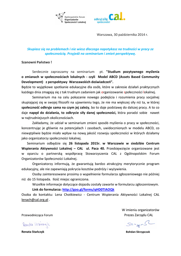 Warszawa, 30 października 2014 r. Skupiasz się na problemach i nie wiesz dlaczego napotykasz na trudności w pracy ze społecznością. Przyjedź na seminarium i zmień perspektywę. Szanowni Państwo ! Serdecznie zapraszamy na seminarium pt. "Studium pozytywnego myślenia o zmianach w społecznościach lokalnych - czyli Model ABCD (Assets Based Community Development) z perspektywy Warszawskich doświadczeń”. Będzie to wyjątkowe spotkanie edukacyjne dla osób, które w zakresie działań praktycznych każdego dnia zmagają się z tak trudnym zadaniem jak organizowanie społeczności lokalnej. Seminarium ma na celu pokazanie nowego podejścia i rozumienia pracy socjalnej skupiającej się w swojej filozofii na ujawnieniu tego, że nie ma większej siły niż ta, w której społeczność odkryje sama na czym jej zależy, bo to daje podstawę do dalszej pracy. A to co daje napęd do działania, to odkrycie siły danej społeczności, która poradzi sobie nawet w najtrudniejszych okolicznościach. Zakładamy, że udział w seminarium zmieni sposób myślenia o pracy w społeczności, koncentrując je głównie na potencjałach i zasobach, uwidocznionych w modelu ABCD, co niewątpliwie będzie miało wpływ na nową jakość rozwoju społeczności w których działamy jako organizatorzy społeczności lokalnej. Seminarium odbędzie się 26 listopada 2015r. w Warszawie w siedzibie Centrum Wspierania Aktywności Lokalnej – CAL ul. Paca 40. Przedsięwzięcie organizowane jest w oparciu o partnerską współpracę Stowarzyszenia CAL z Ogólnopolskim Forum Organizatorów Społeczności Lokalnej. Organizatorzy informują, że gwarantują bardzo atrakcyjny merytorycznie program edukacyjny, ale nie zapewniają pokrycia kosztów podróży i wyżywienia. Osoby zainteresowane prosimy o wypełnienie formularza zgłoszeniowego nie później niż do 15 listopada. Ilość miejsc ograniczona. Wszelkie informacje dotyczące dojazdu zostały zawarte w formularzu zgłoszeniowym. Link do formularza: http://goo.gl/forms/qHD0TIAOQk Osoba do kontaktu: Lena Chotkiewicz - Centrum Wspierania Aktywności Lokalnej CAL [email protected] . Przewodnicząca Forum Renata Stańczyk W imieniu organizatorów Prezes Zarządu CAL Bohdan Skrzypczak Program Seminarium 26 listopad 2015 Warszawa 11:00 – 11:15 Powitanie uczestników – Renata Stańczyk, Agata Gajda 11.15 – 11.50 Wykład eksperta „Model ABCD (Assets Based Community Development) w pigułce” – Paweł Jordan 11.50- 13.00 Model ABCD w praktyce – prezentacje: Praca ze społecznością w oparciu o zasoby, doświadczenia Ośrodka Pomocy Społecznej Dzielnicy Targówek m.st. Warszawy – organizator społeczności lokalnej Izabela Kurach Centrum Paca - miejsce rozwoju potencjału społeczności lokalnej Warszawa - Grochów – koordynator Agata Gajda Stowarzyszenie CAL. 13.00 -13.30 Przerwa. 13.30–15.00 Praca w grupach warsztatowych. Szukamy ABCD na własnym podwórku. Zajęcia prowadzić będą członkowie Zarządu OFOSL. 15.00-15.30 Prezentacja wniosków z zajęć warsztatowych. 15.30-16.00 Podsumowanie i zakończenie seminarium. – Paweł Jordan, Renata Stańczyk