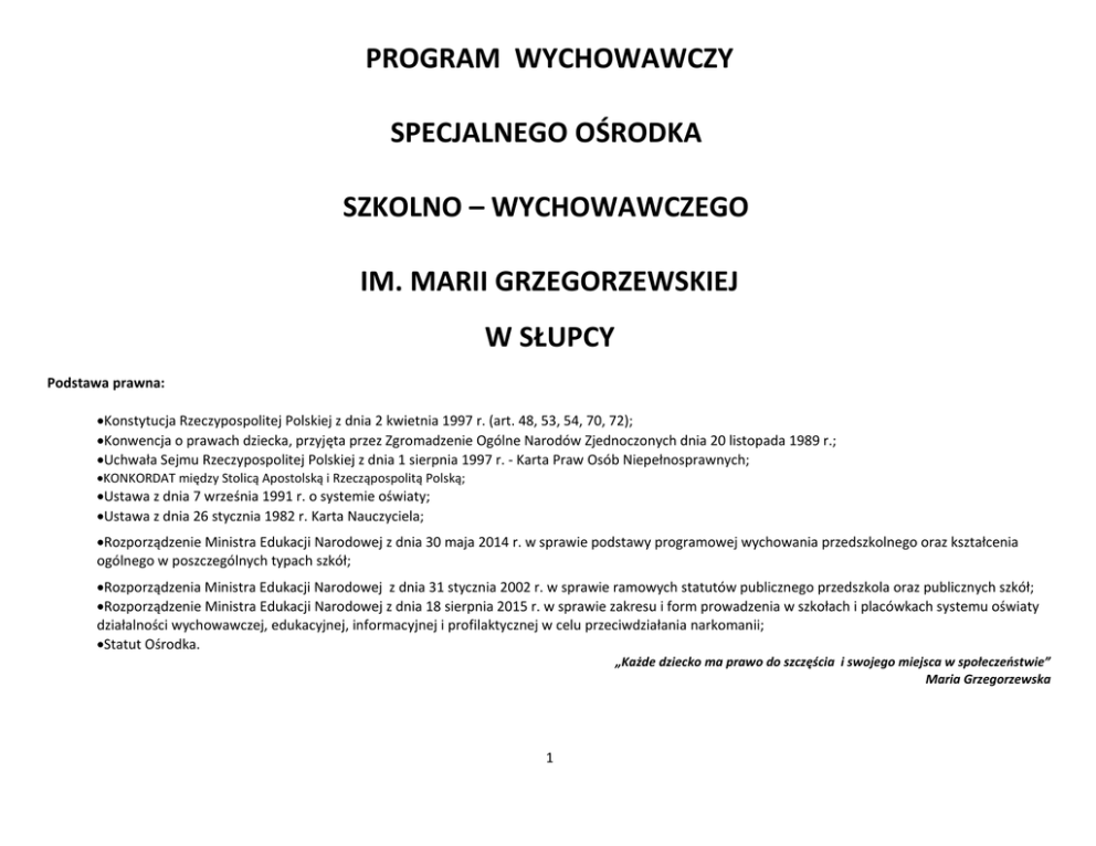 PROGRAM WYCHOWAWCZY SPECJALNEGO OŚRODKA SZKOLNO – WYCHOWAWCZEGO IM. MARII GRZEGORZEWSKIEJ W SŁUPCY Podstawa prawna: Konstytucja Rzeczypospolitej Polskiej z dnia 2 kwietnia 1997 r. (art. 48, 53, 54, 70, 72); Konwencja o prawach dziecka, przyjęta przez Zgromadzenie Ogólne Narodów Zjednoczonych dnia 20 listopada 1989 r.; Uchwała Sejmu Rzeczypospolitej Polskiej z dnia 1 sierpnia 1997 r. - Karta Praw Osób Niepełnosprawnych; KONKORDAT między Stolicą Apostolską i Rzecząpospolitą Polską; Ustawa z dnia 7 września 1991 r. o systemie oświaty; Ustawa z dnia 26 stycznia 1982 r. Karta Nauczyciela; Rozporządzenie Ministra Edukacji Narodowej z dnia 30 maja 2014 r. w sprawie podstawy programowej wychowania przedszkolnego oraz kształcenia ogólnego w poszczególnych typach szkół; Rozporządzenia Ministra Edukacji Narodowej z dnia 31 stycznia 2002 r. w sprawie ramowych statutów publicznego przedszkola oraz publicznych szkół; Rozporządzenie Ministra Edukacji Narodowej z dnia 18 sierpnia 2015 r. w sprawie zakresu i form prowadzenia w szkołach i placówkach systemu oświaty działalności wychowawczej, edukacyjnej, informacyjnej i profilaktycznej w celu przeciwdziałania narkomanii; Statut Ośrodka. „Każde dziecko ma prawo do szczęścia i swojego miejsca w społeczeństwie” Maria Grzegorzewska 1 WSTĘP Specjalny Ośrodek Szkolno – Wychowawczy im. M. Grzegorzewskiej w Słupcy jest placówką, która zapewnia całodobową opiekę i wszechstronny rozwój wychowanków o specjalnych potrzebach edukacyjnych. Dziecko stanowi centrum rozwoju, nauczyciel- wychowawca jest towarzyszem i organizatorem sytuacji wychowawczej wspieraj ąc rozwój dziecka, a jego relacja z dzieckiem oparta jest na przyjaźni i wzajemnym zaufaniu. Odpowiedzialność za ostateczne ukształtowanie młodego człowieka spoczywa nie tylko na nauczycielach, wychowawcach ale również na rodzicach i społeczności lokalnej. Wychowawcza rola pedagogów i pozostałych pracowników powinna rozprzestrzeniać się na wszystkie aspekty funkcjonowania dziecka w naszej placówce. Powinna być oparta o współpracę z rodzicami i opiekunami wychowanków. MISJA (wg koncepcji pracy placówki): Misją ośrodka jest kształcenie, wychowanie, jak najlepsze przygotowanie do życia dzieci i młodzieży niepełnosprawnych intelektualnie, na miarę ich możliwości, na wszystkich etapach edukacyjnych. WIZJA (wg koncepcji pracy placówki): Ośrodek – to placówka nowoczesna, specjalistyczna, bezpieczna dla dziecka, otwarta na potrzeby środowiska lokalnego, odważnie podejmująca wyzwania edukacji i zmierzająca w kierunku podwyższania efektywności działań edukacyjnych, wychowawczych, terapeutycznych Zadaniem ośrodka jest: stwarzać takie warunki, w których dziecko będzie czuło się bezpiecznie i swobodnie; za pomocą przyjętych metod i środków czuwać nad właściwym kierunkiem jego rozwoju, umożliwiając kształtowanie pożądanych postaw moralnych, zdrowotnych, zapoznawanie się z dorobkiem kultury i tradycji, rozwijanie sprawności społecznych i umysłowych. ZAŁOŻENIA PROGRAMU WYCHOWAWCZEGO Program wychowawczy obejmuje wszystkie treści i działania o charakterze wychowawczym na każdym obszarze działalności edukacyjnej placówki (szkoły, grupy wychowawczej: internat, świetlica szkolna). Program wychowawczy jest spójny z programem profilaktyki i podstawą programową wychowania przedszkolnego, kształcenia ogólnego dla wszystkich szkół wchodzących w skład naszego ośrodka . Cele i zadania programu wychowawczego Celem wychowania jest wspomaganie rozwoju i kształtowanie oczekiwanych społecznie postaw. Cele pracy wychowawczej wynikają z naszej tradycji kulturowej i norm ogólnoludzkich. Zadaniem naczelnym pracy wychowawczej jest wprowadzenie dziecka w ten świat i tradycje oraz prawa rządzące społeczeństwem, aby przez to rozbudzić w dziecku pragnienie osiągniecia pełni człowieczeństwa, pragnienie do rozwijania się we wszystkich wymiarach życia: fizycznym, moralnym, duchowym, intelektualnym, społecznym - na miarę jego indywidualnych możliwości. 2 Sfery działań wychowawczych Działalność wychowawcza placówki polega na kształtowaniu właściwych postaw, zachowań w zakresie promocji zdrowia oraz wspomagania ucznia i wychowanka w jego rozwoju ukierunkowanym na osiąganie pełnej dojrzałości w sferach: FIZYCZNEJ – zdobywanie przez uczniów i wychowanków wiedzy i umiejętności pozwalających na prowadzenie zdrowego stylu życia i podejmowanie zachowań prozdrowotnych; PSYCHICZNEJ – budowanie równowagi i harmonii psychicznej, ukształtowanie postaw sprzyjających wzmacnianiu zdrowia własnego i innych ludzi, kształtowanie środowiska sprzyjającego rozwojowi zdrowia, osiągnięcia właściwego stosunku do świata, poczucia siły, chęci do życia i witalności; SPOŁECZNEJ – kształtowanie postawy otwartości w życiu społecznym, opartej na umiejętności samodzielnej analizy wzorów i norm społecznych oraz ćwiczeniu umiejętności wypełniania ról społecznych; AKSJOLOGICZNEJ – zdobywanie konstruktywnego i stabilnego systemu wartości, w tym docenienie znaczenia zdrowia oraz poczucia sensu istnienia. Obszary działalności wychowawczej w placówce Współpraca z rodzicami/ opiekunami uczniów/wychowanków w celu budowania postawy prozdrowotnej i zdrowego stylu życia; Kształtowanie hierarchii systemu wartości, w którym zdrowie należy do jednych z najważniejszych wartości w życiu; Wzmacnianie wśród uczniów i wychowanków więzi ze szkołą/ internatem oraz społecznością lokalną; Kształtowanie przyjaznego klimatu w szkole, placówce, budowanie prawidłowych relacji rówieśniczych oraz relacji uczniów i nauczycieli, wychowanków i wychowawców, a także nauczycieli, wychowawców i rodziców lub opiekunów, w tym wzmacnianie więzi z rówieśnikami oraz nauczycielami i wychowawcami; Doskonalenie umiejętności nauczycieli i wychowawców w zakresie budowania 