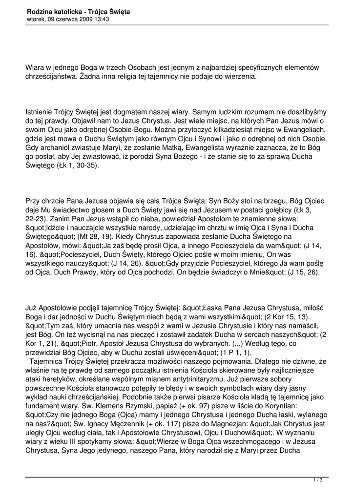 Rodzina katolicka - Trójca Święta wtorek, 09 czerwca 2009 13:43 Wiara w jednego Boga w trzech Osobach jest jednym z najbardziej specyficznych elementów chrześcijaństwa. Żadna inna religia tej tajemnicy nie podaje do wierzenia. Istnienie Trójcy Świętej jest dogmatem naszej wiary. Samym ludzkim rozumem nie doszlibyśmy do tej prawdy. Objawił nam to Jezus Chrystus. Jest wiele miejsc, na których Pan Jezus mówi o swoim Ojcu jako odrębnej Osobie-Bogu. Można przytoczyć kilkadziesiąt miejsc w Ewangeliach, gdzie jest mowa o Duchu Świętym jako równym Ojcu i Synowi i jako o odrębnej od nich Osobie. Gdy archanioł zwiastuje Maryi, że zostanie Matką, Ewangelista wyraźnie zaznacza, że to Bóg go posłał, aby Jej zwiastować, iż porodzi Syna Bożego - i że stanie się to za sprawą Ducha Świętego (Łk 1, 30-35). Przy chrzcie Pana Jezusa objawia się cała Trójca Święta: Syn Boży stoi na brzegu, Bóg Ojciec daje Mu świadectwo głosem a Duch Święty jawi się nad Jezusem w postaci gołębicy (Łk 3, 22-23). Zanim Pan Jezus wstąpił do nieba, powiedział Apostołom te znamienne słowa: "Idźcie i nauczajcie wszystkie narody, udzielając im chrztu w imię Ojca i Syna i Ducha Świętego" (Mt 28, 19). Kiedy Chrystus zapowiada zesłanie Ducha Świętego na Apostołów, mówi: "Ja zaś będę prosił Ojca, a innego Pocieszyciela da wam" (J 14, 16). "Pocieszyciel, Duch Święty, którego Ojciec pośle w moim imieniu, On was wszystkiego nauczy" (J 14, 26). "Gdy przyjdzie Pocieszyciel, którego Ja wam poślę od Ojca, Duch Prawdy, który od Ojca pochodzi, On będzie świadczył o Mnie" (J 15, 26). Już Apostołowie podjęli tajemnicę Trójcy Świętej: "Łaska Pana Jezusa Chrystusa, miłość Boga i dar jedności w Duchu Świętym niech będą z wami wszystkimi" (2 Kor 15, 13). "Tym zaś, który umacnia nas wespół z wami w Jezusie Chrystusie i który nas namaścił, jest Bóg. On też wycisnął na nas pieczęć i zostawił zadatek Ducha w sercach naszych" (2 Kor 1, 21). "Piotr, Apostoł Jezusa Chrystusa do wybranych. (...) Według tego, co przewidział Bóg Ojciec, aby w Duchu zostali uświęceni" (1 P 1, 1). Tajemnica Trójcy Świętej przekracza możliwości naszego pojmowania. Dlatego nie dziwne, że właśnie na tę prawdę od samego początku istnienia Kościoła skierowane były najliczniejsze ataki heretyków, określane wspólnym mianem antytrinitaryzmu. Już pierwsze sobory powszechne Kościoła stanowczo potępiły te błędy i w swoich symbolach wiary dały jasny wykład nauki chrześcijańskiej. Podobnie także pierwsi pisarze Kościoła kładą tę tajemnicę jako fundament wiary. Św. Klemens Rzymski, papież (+ ok. 97) pisze w liście do Koryntian: "Czy nie jednego Boga (Ojca) mamy i jednego Chrystusa i jednego Ducha łaski, wylanego na nas?" Św. Ignacy Męczennik (+ ok. 117) pisze do Magnezjan: "Jak Chrystus jest uległy Ojcu według ciała, tak i Apostołowie Chrystusowi, Ojcu i Duchowi". W wyznaniu wiary z wieku III spotykamy słowa: "Wierzę w Boga Ojca wszechmogącego i w Jezusa Chrystusa, Syna Jego jedynego, naszego Pana, który narodził się z Maryi przez Ducha 1/3 Rodzina katolicka - Trójca Święta wtorek, 09 czerwca 2009 13:43 Świętego". W tym samym czasie św. Dionizjusz z Aleksandrii (+ 265) pisze wprost o istnieniu w jednym Bogu Trójcy. Wyznanie wiary, które nam przekazał pierwszy powszechny sobór w Nicei w roku 325, nie tylko odróżnia odrębność osób w Bogu, ale z całą mocą podkreśla również ich jedność w naturze. Jeszcze szerzej tę prawdę rozwinęły sobory: Konstantynopolitański I (381), Efeski (431) i Chalcedoński (451). Na temat tajemnicy Trójcy Przenajświętszej napisali całe traktaty: św. Atanazy (+ 373), św. Grzegorz z Nazjanzu (+ 390), św. Cyryl Aleksandryjski (+ 444) i św. Augustyn (+ 430). Wykazywali oni, (a także wielu innych po nich) nie tylko istnienie tej prawdy, ale usiłowali określić także jej naturę, oczywiście w granicach dostępnych dla rozumu. Prawda o tajemnicy Trójcy Przenajświętszej jest dla nas o tyle istotna, że przedstawia Pana Boga, jakim jest sam w sobie. Pan Bóg jest jeden w swojej naturze, ale w trzech osobach. Osoby Boskie różnią się między sobą rzeczywiście tak, że jedna osoba nie jest osobą drugą. Nie różnią się jednak naturą ani też przymiotami, ani też działaniem, które jest wspólne. Mają wspólną naturę Bożą, wszystkie przymioty i działania Boże. Osoby różnią się między sobą jedynie pochodzeniem: Bóg Ojciec nie pochodzi od nikogo, Syn Boży pochodzi przez odwieczne i duchowe zrodzenie od Ojca, Duch Święty pochodzi przez wspólne tchnienie miłości Ojca i Syna. Pierwszą osobę wyróżnia ojcostwo, drugą osobę - synostwo, a trzecią pochodzenie od Ojca i Syna. Tyle zdołała określić teologia katolicka na podstawie tekstów Pisma świętego i pism Ojców Kościoła. Odrębny obchód ku czci Trójcy Świętej powstał w liturgii stosunkowo późno, bo dopiero w wieku XI. W roku 1334 papież Jan XXI rozszerzył ją na cały Kościół. Św. Rupert, opat z Ottobeuren (+ ok. 1180), zna to święto i tak tłumaczy, dlaczego zostało ono umieszczone w najbliższą niedzielę po Zesłaniu Ducha Świętego: "Albowiem wkrótce po Zstąpieniu Ducha Świętego prawda Chrystusowa i chrzest przez Niego nakazany w imię Ojca i Syna i Ducha Świętego były udzielane po całym świecie. Tak przeto uroczystość dzisiejsza jest najpiękniejszym zamknięciem cyklu zbawienia". W Polsce z tym dniem kończy się również czas Spowiedzi i Komunii świętej wielkanocnej. Dla pogłębienia wśród wiernych nabożeństwa do Najświętszej Trójcy Kościół w swoich modlitwach liturgicznych dodaje: "Chwała Ojcu i Synowi i Duchowi Świętemu". Kościół we wszystkich swoich modlitwach wzywa Boga w trzech Osobach: każdą modlitwę liturgiczną kończy wezwaniem Trójcy Najświętszej. Modlitwę "Chwała Ojcu i Synowi, i Duchowi Świętemu" miał j
