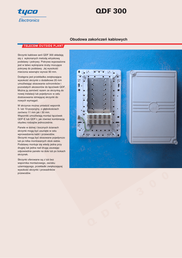 QDF 300 Obudowa zakoƒczeƒ kablowych Skrzynki kablowe serii QDF 300 sk∏adajà si´ z wykonanych metodà wtryskowà podstawy i pokrywy. Pokrywa wyposa˝ona jest w ∏atwo wykr´cane Êruby mocujàce pokryw´ do podstawy. Jej wysokoÊç mierzona wewnàtrz wynosi 90 mm. Dost´pna jest przek∏adka zwi´kszajàca wysokoÊç skrzynki o dodatkowe 20 mm umo˝liwiajàc stosowanie ochronników i pozosta∏ych akcesoriów do ∏àczówek QDF. Mo˝na jà zamówiç razem ze skrzynkà do nowej instalacji lub pojedynczo w celu dostosowania istniejàcej skrzynki do nowych wymagaƒ. W skrzynce mo˝na umieÊciç wspornik 5- lub 10-pozycyjny, o g∏´bokoÊciach zarówno 11 mm jak i 30 mm. Wsporniki umo˝liwiajà monta˝ ∏àczówek QDF-E lub QDF-I, jak równie˝ kombinacj´ obydwu rodzajów jednoczeÊnie. Panele w dolnej i bocznych Êcianach skrzynki mogà byç usuni´te w celu wprowadzenia kabli i przewodów. Skrzynki mogà byç stosowane pojedynczo lub po kilka montowanych obok siebie. Podstawy montuje si´ wtedy jedna przy drugiej lub jedna nad drugà usuwajàc odpowiednie panele na dole lub po bokach skrzynek. Skrzynki oferowane sà z lub bez wspornika monta˝owego, zacisku uziemiajàcego, przek∏adki zwi´kszajàcej wysokoÊç skrzynki i prowadników przewodów. 3 Q D F 0 0 QDF 300 Zamawianie i wymiary skrzynek. Opis Wymiary zewn´trzne Symbol Numer PCN Pusta skrzynka Skrzynka plus przek∏adka Skrzynka plus 10-pozycyjny wspornik, g∏´bokoÊç 30mm Skrzynka plus 10-pozycyjny wspornik, g∏´bokoÊç 30 mm plus przek∏adka 320 x 210 x 110 mm 320 x 210 x 140 mm 320 x 210 x 120 mm QDF-300 QDF-300S QDF-301A 622259-000 744615-000 410712-000 320 x 210 x 140 mm QDF-301SA 059615-000 Akcesoria dla skrzynek QDF-300/301 (wymiary w mm) 47 6 1 2 3 20 d∏ugoÊç g∏´bokoÊç 320 210 22,5 5 Opis Symbol Numer PCN 1. 2. 3. 4. 5. 6. QDF-BCA-01 QDF-BCA-02 QDF-BCA-03 QDF-BCA-04 QDF-BCA-07 460473-000 951787-000 102441-000 981391-000 599060-000 QDF-11-05A QDF-11-10A QDF-30-05A QDF-30-10A 931746-000 394700-000 631870-000 999504-000 Zestaw zacisków uziemiajàcych Prowadniki przewodów (10 szt./opak.) 4 uchwyty do mocowania kabli, 2 Êruby (do mocowania skrzynek do siebie) Opaska kablowa zaciskowa (50 szt./opak.) Przek∏adka dystansowa Wsporniki: IloÊç ∏àczówek G∏´bokoÊç (mm) 5 10 5 10 11 11 30 30 Tyco, Raychem i QDF sà znakami handlowymi Tyco International. Pokazane tu w celach ilustracyjnych informacje, rysunki i schematy sà wed∏ug nas wiarygodne. Jednak˝e firma Tyco Electronics nie gwarantuje ich dok∏adnoÊci i kompletnoÊci oraz nie bierze na siebie odpowiedzialnoÊci zwiàzanej z ich u˝yciem. Zobowiàzania firmy Tyco Electronics mogà byç jedynie takie, jakie zosta∏y wyspecyfikowane w ”Standard Terms and Conditions of Sale” firmy Tyco Electronics dla niniejszego wyrobu i w ˝adnym przypadku firma Tyco Electronics nie b´dzie odpowiedzialna za jakiekolwiek przypadkowe, bezpoÊrednie lub wynikowe uszkodzenia powsta∏e w nast´pstwie sprzeda˝y, odsprzeda˝y, u˝ycia lub nieprawid∏owego u˝ycia tego wyrobu. U˝ytkownicy wyrobów firmy Tyco Electronics powinni sami dokonaç oszacowania w celu okreÊlenia przydatnoÊci ka˝dego takiego wyrobu do konkretnego zastosowania. Tyco Electronics Raychem NV Raychem Polska Sp. z o.o. Telecom Outside Plant Diestsesteenweg 692 3010 Kessel-Lo, Belgium Tel.: 32-16-351 011 Fax: 32-16-351 697 www.tycoelectronics.com Ul. Post´pu 2 02-676 Warszawa Tel.: 48-22- 549 07 20 Fax: 48-22- 549 07 21 [email protected] TC 608/M/DS/PO/1 03/00
