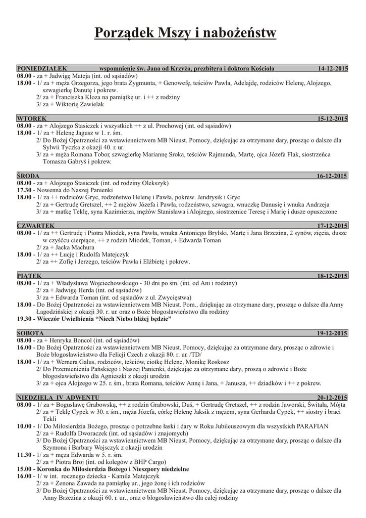 Porz¹dek Mszy i nabo¿eñstw PONIEDZIA£EK wspomnienie œw. Jana od Krzy¿a, prezbitera i doktora Koœcio³a 14-12-2015 08.00 - za + Jadwigê Mateja (int. od s¹siadów) 18.00 - 1/ za + mê¿a Grzegorza, jego brata Zygmunta, + Genowefê, teœciów Paw³a, Adelajdê, rodziców Helenê, Alojzego, szwagierkê Danutê i pokrew. 2/ za + Franciszka Kloza na pami¹tkê ur. i ++ z rodziny 3/ za + Wiktoriê Zawielak WTOREK 15-12-2015 08.00 - za + Alojzego Stasiczek i wszystkich ++ z ul. Prochowej (int. od s¹siadów) 18.00 - 1/ za + Helenê Jagusz w 1. r. œm. 2/ Do Bo¿ej Opatrznoœci za wstawiennictwem MB Nieust. Pomocy, dziêkuj¹c za otrzymane dary, prosz¹c o dalsze dla Sylwii Tyczka z okazji 40. r. ur. 3/ za + mê¿a Romana Tobor, szwagierkê Mariannê Sroka, teœciów Rajmunda, Martê, ojca Józefa Flak, siostrzeñca Tomasza Gabryœ i pokrew. ŒRODA 16-12-2015 08.00 - za + Alojzego Stasiczek (int. od rodziny Olekszyk) 17.30 - Nowenna do Naszej Panienki 18.00 - 1/ za ++ rodziców Gryc, rodzeñstwo Helenê i Paw³a, pokrew. Jendrysik i Gryc 2/ za + Gertrudê Gretszel, ++ 2 mê¿ów Józefa i Paw³a, rodzeñstwo, szwagra, wnuczkê Danusiê i wnuka Andrzeja 3/ za + matkê Teklê, syna Kazimierza, mê¿ów Stanis³awa i Alojzego, siostrzenice Teresê i Mariê i dusze opuszczone CZWARTEK 17-12-2015 08.00 - 1/ za ++ Gertrudê i Piotra Miodek, syna Paw³a, wnuka Antoniego Brylski, Martê i Jana Brzezina, 2 synów, ziêcia, dusze w czyœæcu cierpi¹ce, ++ z rodzin Miodek, Toman, + Edwarda Toman 2/ za + Jacka Machura 18.00 - 1/ za ++ £ucjê i Rudolfa Matejczyk 2/ za ++ Zofiê i Jerzego, teœciów Paw³a i El¿bietê i pokrew. PI¥TEK 18-12-2015 08.00 - 1/ za + W³adys³awa Wojciechowskiego - 30 dni po œm. (int. od Ani i rodziny) 2/ za + Jadwigê Herda (int. od s¹siadów) 3/ za + Edwarda Toman (int. od s¹siadów z ul. Zwyciêstwa) 18.00 - Do Bo¿ej Opatrznoœci za wstawiennictwem MB Nieust. Pom., dziêkuj¹c za otrzymane dary, prosz¹c o dalsze dla Anny £agodziñskiej z okazji 30. r. ur. oraz o Bo¿e b³ogos³awieñstwo dla rodziny 19.30 - Wieczór Uwielbienia “Niech Niebo bli¿ej bêdzie” SOBOTA 19-12-2015 08.00 - za + Henryka Boncol (int. od s¹siadów) 16.00 - Do Bo¿ej Opatrznoœci za wstawiennictwem MB Nieust. Pomocy, dziêkuj¹c za otrzymane dary, prosz¹c o zdrowie i Bo¿e b³ogos³awieñstwo dla Felicji Czech z okazji 80. r. ur. /TD/ 18.00 - 1/ za + Wernera Galus, rodziców, teœciów, ciotkê Helenê, Monikê Roskosz 2/ Do Przemienienia Pañskiego i Naszej Panienki, dziêkuj¹c za otrzymane dary, prosz¹ o zdrowie i Bo¿e b³ogos³awieñstwo dla Agnieszki z okazji urodzin 3/ za + ojca Alojzego w 25. r. œm., brata Romana, teœciów Annê i Jana, + Janusza, ++ dziadków i ++ z pokrew. NIEDZIELA IV ADWENTU 20-12-2015 08.00 - 1/ za + Bogus³awê Grabowsk¹, ++ z rodzin Grabowski, Duœ, + Gertrudê Gretszel, ++ z rodzin Jaworski, Œwita³a, Mójta 2/ za + Teklê Cypek w 30. r. œm., mê¿a Józefa, córkê Helenê Jaksik z mê¿em, syna Gerharda Cypek, ++ siostry i braci Tekli 10.00 - 1/ Do Mi³osierdzia Bo¿ego, prosz¹c o potrzebne ³aski i dary w Roku Jubileuszowym dla wszystkich PARAFIAN 2/ za + Rudolfa Dworaczek (int. od s¹siadów i znajomych) 3/ Do Bo¿ej Opatrznoœci za wstawiennictwem MB Nieust. Pomocy, dziêkuj¹c za otrzymane dary, prosz¹c o dalsze dla Szymona i Barbary Wojsczyk z okazji urodzin 11.30 - 1/ za + mê¿a Edwarda w 5. r. œm. 2/ za + Piotra Broj (int. od kolegów z BHP Cargo) 15.00 - Koronka do Mi³osierdzia Bo¿ego i Nieszpory niedzielne 16.00 - 1/ w int. rocznego dziecka - Kamila Matejczyk 2/ za + Zenona Zawada na pami¹tkê ur., jego ¿onê i ich rodziców 3/ Do Bo¿ej Opatrznoœci za wstawiennictwem MB Nieust. Pomocy, dziêkuj¹c za otrzymane dary, prosz¹c o dalsze dla Anny Brzezina z okazji 60. r. ur., oraz o b³ogos³awieñstwo dla ca³ej rodziny Niedziela III Adwentu - “GAUDETE” - 13-12-2015 08.00 - 1/ za + mê¿a Szczepana Drzyzga i matkê £ucjê na pami¹tkê urodzin 2/ za + mê¿a Eugeniusza 10.00 - 1/ Do Bo¿ej Opatrznoœci za wstawiennictwem MB Nieust. Pomocy, dziêkuj¹c za otrzymane dary, prosz¹c o dalsze dla Mariana Stempor z okazji 60. r. ur. /TD/ 2/ Do Bo¿ej Opatrznoœci za wstawiennictwem MB Nieust. Pomocy, dziêkuj¹c za otrzymane dary, prosz¹c o zdrowie i Bo¿e b³ogos³awieñstwo dla mê¿a Alfreda z okazji 76. r. ur. 11.30 - 1/ za ++ rodziców Alicjê i Jerzego Szubiñski, ++ z pokrew. Szubiñski i Bodora 2/ za + Mariana Warchulskiego (int. od s¹siadów) 15.00 - Nieszpory niedzielne 16.00 - Do Bo¿ej Opatrznoœci za wstawiennictwem MB Nieust. Pomocy, dziêkuj¹c za otrzymane dary, prosz¹c o Bo¿e b³ogos³awieñstwo i Dary Ducha Œwiêtego dla Mateusza Wieczorek z okazji 18. r. ur. OG£OSZENIA DUSZPASTERSKIE 1/ Dziœ na 15.00 zapraszamy na koronkê do Mi³osierdzia Bo¿ego i nieszpory niedzielne. 2/ Dziœ na pocz¹tku Mszy œw. o godz. 10.00 w naszym koœciele, który decyzj¹ ks. biskupa Jan Kopca, jest jednym z koœcio³ów jubileuszowych, nast¹pi uroczyste otwarcie Roku Mi³osierdzia. Przechodz¹c drzwiami œwiêtymi - “bram¹ mi³osierdzia”, mo¿emy uzyskaæ odpust zupe³ny, po spe³nieniu warunków. Zapraszamy wszystkich parafian, poczty sztandarowe, orkiestrê. Program obchodów Roku Mi³osierdzia: codzienna Koronka do Mi³osierdzia Bo¿ego (o godz. 15.00 w koœciele), codzienna adoracja Najœw. Sakramentu w dni powszednie od 15.00 do 18.00, okazja do sakramentu pokuty w dni powszednie od 15.00 do 18.00, Uwielbienie Mi³osierdzia Bo¿ego (pierwsze spotkanie - 18.12 g. 19.30), koncerty zespo³ów: Lumen, Moniki Kuszyñskiej, Mieczys³awa Szczeœniaka, Natalii Niemen. 3/ Dzisiejsza kolekta przeznaczona jest na potrzeby naszej parafii. 4/ W trwaj¹cym Roku Mi³osierdzia zapraszamy codziennie na Koronkê i adoracje Najœw. Sakramentu (od 15.00 do 18.00) oraz skorzystania z sakramentu pokuty. 5/ W tym tygodniu przypadaj¹ Kwartalne Dni Modlitw o ¿ycie chrzeœcijañskie rodzin. 6/ Wszystkie dzieci, m³odzie¿ i doros³ych