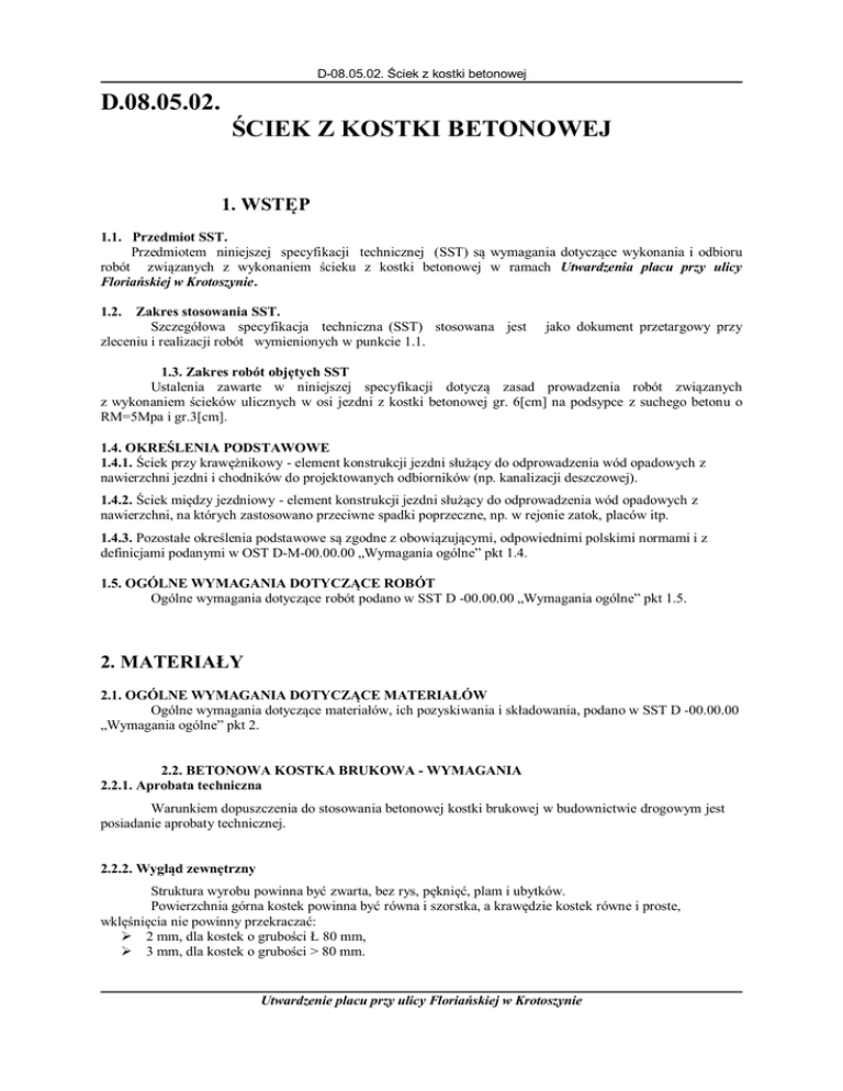D-08.05.02. Ściek z kostki betonowej D.08.05.02. ŚCIEK Z KOSTKI BETONOWEJ 1. WSTĘP 1.1. Przedmiot SST. Przedmiotem niniejszej specyfikacji technicznej (SST) są wymagania dotyczące wykonania i odbioru robót związanych z wykonaniem ścieku z kostki betonowej w ramach Utwardzenia placu przy ulicy Floriańskiej w Krotoszynie. 1.2. Zakres stosowania SST. Szczegółowa specyfikacja techniczna (SST) stosowana jest zleceniu i realizacji robót wymienionych w punkcie 1.1. jako dokument przetargowy przy 1.3. Zakres robót objętych SST Ustalenia zawarte w niniejszej specyfikacji dotyczą zasad prowadzenia robót związanych z wykonaniem ścieków ulicznych w osi jezdni z kostki betonowej gr. 6[cm] na podsypce z suchego betonu o RM=5Mpa i gr.3[cm]. 1.4. OKREŚLENIA PODSTAWOWE 1.4.1. Ściek przy krawężnikowy - element konstrukcji jezdni służący do odprowadzenia wód opadowych z nawierzchni jezdni i chodników do projektowanych odbiorników (np. kanalizacji deszczowej). 1.4.2. Ściek między jezdniowy - element konstrukcji jezdni służący do odprowadzenia wód opadowych z nawierzchni, na których zastosowano przeciwne spadki poprzeczne, np. w rejonie zatok, placów itp. 1.4.3. Pozostałe określenia podstawowe są zgodne z obowiązującymi, odpowiednimi polskimi normami i z definicjami podanymi w OST D-M-00.00.00 „Wymagania ogólne” pkt 1.4. 1.5. OGÓLNE WYMAGANIA DOTYCZĄCE ROBÓT Ogólne wymagania dotyczące robót podano w SST D -00.00.00 „Wymagania ogólne” pkt 1.5. 2. MATERIAŁY 2.1. OGÓLNE WYMAGANIA DOTYCZĄCE MATERIAŁÓW Ogólne wymagania dotyczące materiałów, ich pozyskiwania i składowania, podano w SST D -00.00.00 „Wymagania ogólne” pkt 2. 2.2. BETONOWA KOSTKA BRUKOWA - WYMAGANIA 2.2.1. Aprobata techniczna Warunkiem dopuszczenia do stosowania betonowej kostki brukowej w budownictwie drogowym jest posiadanie aprobaty technicznej. 2.2.2. Wygląd zewnętrzny Struktura wyrobu powinna być zwarta, bez rys, pęknięć, plam i ubytków. Powierzchnia górna kostek powinna być równa i szorstka, a krawędzie kostek równe i proste, wklęśnięcia nie powinny przekraczać: 2 mm, dla kostek o grubości Ł 80 mm, 3 mm, dla kostek o grubości > 80 mm. Utwardzenie placu przy ulicy Floriańskiej w Krotoszynie D-08.05.02. Ściek z kostki betonowej 2.2.3. Kształt, wymiary i kolor kostki brukowej W kraju produkowane są kostki o dwóch standardowych wymiarach grubości: 60 mm, z zastosowaniem do nawierzchni nie przeznaczonych do ruchu samochodowego, 80 mm, do nawierzchni dla ruchu samochodowego. Tolerancje wymiarowe wynoszą: na długości ± 3 mm, na szerokości ± 3 mm, na grubości ± 5 mm. Kolory kostek produkowanych aktualnie w kraju to: szary, ceglany, klinkierowy, grafitowy i brązowy. 2.2.4. Wytrzymałość na ściskanie Wytrzymałość na ściskanie po 28 dniach (średnio z 6-ciu kostek) nie powinna być mniejsza niż 60 MPa. Dopuszczalna najniższa wytrzymałość pojedynczej kostki nie powinna być mniejsza niż 50 MPa (w ocenie statystycznej z co najmniej 10 kostek). 2.2.5. Nasiąkliwość Nasiąkliwość kostek betonowych powinna odpowiadać wymaganiom normy PN-B-06250 [2] i wynosić nie więcej niż 5%. 2.2.6. Odporność na działanie mrozu Odporność kostek betonowych na działanie mrozu powinna być badana zgodnie z wymaganiami PN-B06250 [2]. Odporność na działanie mrozu po 50 cyklach zamrażania i odmrażania próbek jest wystarczająca, jeżeli: próbka nie wykazuje pęknięć, strata masy nie przekracza 5%, obniżenie wytrzymałości na ściskanie w stosunku do wytrzymałości próbek nie zamrażanych nie jest większe niż 20%. 2.2.7. Ścieralność Ścieralność kostek betonowych określona na tarczy Boehmego wg PN-B-04111 [1] powinna wynosić nie więcej niż 4 mm. 3. SPRZĘT 3.1. OGÓLNE WYMAGANIA DOTYCZĄCE SPRZĘTU Ogólne wymagania dotyczące sprzętu podano w SST D -00.00.00 „Wymagania ogólne” pkt 3. 3.2. SPRZĘT DO WYKONANIA ŚCIEKU Roboty można wykonywać ręcznie z zastosowaniem następującego sprzętu: betoniarek do wytwarzania betonu i zapraw, ubijaków ręcznych i mechanicznych do ubijania kostki. 4. TRANSPORT 4.1. OGÓLNE WYMAGANIA DOTYCZĄCE TRANSPORTU Ogólne wymagania dotyczące transportu podano w SST D -00.00.00 „Wymagania ogólne” pkt 4. Utwardzenie placu przy ulicy Floriańskiej w Krotoszynie D-08.05.02. Ściek z kostki betonowej 4.2. TRANSPORT MATERIAŁÓW Wymagania dotyczące transportu krawężników, składników betonu i piasku na podsypkę podano w OST D-08.01.01 „Krawężniki betonowe”, a transportu kostki w OST D-05.03.01 „Nawierzchnia z kostki kamiennej”. 5. WYKONANIE ROBÓT 5.1. OGÓLNE ZASADY WYKONANIA ROBÓT Ogólne zasady wykonania robót podano w SST D -00.00.00 „Wymagania ogólne” pkt 5. 5.2. ROBOTY PRZYGOTOWAWCZE Przed przystąpieniem do wykonania ścieku należy wytyczyć linię krawężnika i oś ścieku zgodnie z dokumentacją projektową. Dla ścieku umieszczonego między jezdniami (nawierzchniami) oś ścieku stanowi oś koryta pod ławę. 5.3. WYKONANIE WYKOPU, ŁAWY I USTAWIENIE KRAWĘŻNIKÓW Wykonanie wykopu pod ławę, ławy betonowej dla ścieku przy krawężnikowego i między jezdniowego oraz ustawienie krawężników na ławach powinno być zgodne z dokumentacją projektową oraz postanowieniami OST D-08.01.01 „Krawężniki betonowe”. 5.4. WYKONANIE ŚCIEKU Z KOSTKI KAMIENNEJ Ogólne wymagania dotyczące układania kostki kamiennej podano w OST D-05.03.01 „Nawierzchnia z kostki kamiennej”. Rodzaj i wymiary ścieku powinny być zgodne z dokumentacją projektową. Jeżeli dokumentacja projektowa nie stanowi inaczej, to najczęściej stosuje się ścieki przy krawężnikowe i między jezdniowe z 2 rzędów kostki kamiennej nieregularnej lub rzędowej, obniżonych w stosunku do krawędzi nawierzchni o 1 do 2 [cm]. Na ławie betonowej należy wykonać podsypkę cementowo-piaskową o grubości zgodnej z dokumentacją projektową i wymaganiami podanymi w OST D-05.03.01 „Nawi
