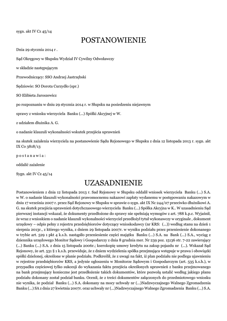 sygn. akt IV Cz 45/14 POSTANOWIENIE Dnia 29 stycznia 2014 r . Sąd Okręgowy w Słupsku Wydział IV Cywilny Odwoławczy w składzie następującym Przewodniczący: SSO Andrzej Jastrzębski Sędziowie: SO Dorota Curzydło (spr.) SO Elżbieta Jaroszewicz po rozpoznaniu w dniu 29 stycznia 2014 r. w Słupsku na posiedzeniu niejawnym sprawy z wniosku wierzyciela Banku (...) Spółki Akcyjnej w W. z udziałem dłużnika A. G. o nadanie klauzuli wykonalności wskutek przejścia uprawnień na skutek zażalenia wierzyciela na postanowienie Sądu Rejonowego w Słupsku z dnia 12 listopada 2013 r. sygn. akt IX Co 3818/13 postanawia: oddalić zażalenie Sygn. akt IV Cz 45/14 UZASADNIENIE Postanowieniem z dnia 12 listopada 2013 r. Sad Rejonowy w Słupsku oddalił wniosek wierzyciela Banku (...) S.A. w W. o nadanie klauzuli wykonalności prawomocnemu nakazowi zapłaty wydanemu w postępowaniu nakazowym w dniu 17 września 2007 r. przez Sąd Rejonowy w Słupsku w sprawie o sygn. akt IX Nc 244/07 przeciwko dłużnikowi A. G. na skutek przejścia uprawnień dotychczasowego wierzyciela Banku (...) Spółka Akcyjna w K.. W uzasadnieniu Sąd pierwszej instancji wskazał, że dokumenty przedłożone do sprawy nie spełniają wymogów z art. 788 k.p.c. Wyjaśnił, że wraz z wnioskiem o nadanie klauzuli wykonalności wierzyciel przedłożył tytuł wykonawczy w oryginale , dokument urzędowy – odpis pełny z rejestru przedsiębiorców dotyczący wnioskodawcy (nr KRS: (...)) według stanu na dzień 1 sierpnia 2013r., z którego wynika, z dniem 29 listopada 2007r. w wyniku podziału przez przeniesienie dokonanego w trybie art. 529 1 pkt 4 k.s.h. nastąpiło przeniesienie części majątku Banku (...) S.A. na Bank (...) S.A., wyciąg z dziennika urzędowego Monitor Sądowy i Gospodarczy z dnia 8 grudnia mer. Nr 239 poz. 15136 str. 7-22 zawierający (...) Banku (...) S.A. z dnia 15 listopada 2006r.; kserokopię umowy kredytu na zakup pojazdu nr (...). Wskazał Sąd Rejonowy, że art. 531 § 1 k.s.h. przewiduje, że z dniem wydzielenia spółka przejmująca wstępuje w prawa i obowiązki spółki dzielonej, określone w planie podziału. Podkreślił, że z uwagi na fakt, iż plan podziału nie podlega ujawnieniu w rejestrze przedsiębiorców KRS, a jedynie ogłoszeniu w Monitorze Sądowym i Gospodarczym (art. 535 k.s.h.), w przypadku częściowej tylko sukcesji do wykazania faktu przejścia określonych uprawnień z banku przejmowanego na bank przejmujący konieczne jest przedłożenie takich dokumentów, które pozwolą ustalić według jakiego planu podziału dokonany został podział banku. Ocenił, że z treści dokumentów załączonych do przedmiotowego wniosku nie wynika, że podział Banku (...) S.A. dokonany na mocy uchwały nr (...)Nadzwyczajnego Walnego Zgromadzenia Banku (...) SA z dnia 27 kwietnia 2007r. oraz uchwały nr (...)Nadzwyczajnego Walnego Zgromadzenia Banku (...) S.A. z dnia 27 kwietnia 2007r. został przeprowadzony zgodnie z planem podziału Banku (...) SA z dnia 15 listopada 2006r. ogłoszonym w (...) poz.(...)podkreślając, że uchwały te nie zostały przedłożone. Z postanowieniem nie zgodził się wierzyciel, który zaskarżył postanowienie w całości. Zarzucił, ze w jego ocenie przedstawione dokumenty w sposób wystarczający dokumentują przejście uprawnień. Zarzucił, że dołączony do wniosku plan podziału jest dokumentem wystarczającym i nie istnieje potrzeba przedstawiana uchwał z dnia 27 kwietnia 2007 r., które jedynie zawierały oświadczenie o przyjęciu i zatwierdzeniu planu podziału, którego treść wynika ze złożonego przez wierzyciela Monitora Sadowego. W konkluzji wniósł o zmian postanowienia i nadanie klauzuli wykonalności zgodnie z wnioskiem oraz o zsądzenie kosztów postępowania. Sąd Okręgowy zważył co następuje: Zażalenie nie zasługiwało na uwzględnienie W pierwszej kolejności należz podkreślić, że postępowanie o nadanie klauzuli wykonalności ma charakter formalnoprawny. Kognicja sądu jest w nim ograniczona do zbadania wymogów formalnych przedstawionego przez wierzyciela tytułu egzekucyjnego. Sąd nie bada zasadności treści tytułu egzekucyjnego (vide: postanowienie Sądu Najwyższego z dnia 5 września 1967 r., I CZ 20/67, OSPiKA 1968, nr 5 poz. 90), bada natomiast, czy przedstawiony mu dokument nadaje się do wykonania w drodze egzekucji. Zasada powyższa rozciąga się na sytuacje, gdy nastąpiło przejście uprawnienia lub obowiązku na inną osobę. Istotnym jest, że w postępowaniu prowadzonym w trybie art. 788 k.p.c. sąd bada tylko, czy nabywca jest nabywcą prawnym i czy nabycie nastąpiło już po powstaniu tytułu wykonawczego, czy też w toku sprawy, przed jego wydaniem. Przywołany powyżej przepis art. 788 § 1 k.p.c. stanowi, że jeżeli uprawnienie lub obowiązek po powstaniu tytułu egzekucyjnego lub w toku sprawy przed wydaniem tytułu przeszły na inną osobę, sąd nada klauzulę wykonalności na rzecz lub przeciwko tej osobie, gdy przejście to będzie wykazane dokumentem urzędowym lub prywatnym z podpisem urzędowo poświadczonym. Przepis ten ma zastosowanie, jak była o tym mowa powyżej, gdy przejście uprawnienia lub obowiązku nastąpiło po wydaniu tytułu egzekucyjnego (por. wyrok Sądu Najwyższego z dnia 8 kwietnia 1963 r., III CR 48/63, OSNCP 1964, nr 2, poz. 41).Przesłanką zatem uzyskania klauzuli wykonalności jest wykazanie przez wierzyciela przejścia praw lub obowiązków za pomocą dokumentu urzędowego lub prywatnego z podpisem urzędowo poświadczonym. Wystarczy, że osnowa dokumentu tylko stwierdza fakt przejścia praw lub obowiązków. Sąd ocenia ten dokument pod względem formalnym (np. czy dokument spełnia kryteria wymagane od dokumentu urzędowego), nie może zaś merytorycznie badać, czy do przejścia praw lub obowiązków rzeczywiście doszło. Toteż i w niniejszym postępowaniu wpadkowym Sąd Rejonowy ograniczył się do formalnej analizy dokumentów załączonych do wni