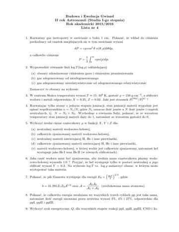 Budowa i Ewolucja Gwiazd II rok Astronomii (Studia I-go stopnia) Rok akademicki 2015/2016 Lista nr 4 1. Rozważmy gaz izotropowy w sześcianie o boku 1 cm. Pokazać, że wklad do ciśnienia pochodzacy od czastek znajdujacych sie, w tym sześcianie wynosi , , , dP = vp cos2 θ n(θ, p)dθdp, a calkowite ciśnienie P = 1 3 Z ∞ vpn(p)dp. 0 2. Wyprowadzić równanie linii log T (log %) oddzielajacej: , (a) obszary zdominowany ciśnieniem gazu i ciśnieniem promieniowania (b) gaz zdegenerowany od niezdegenerowanego (c) gaz zdegenerowany nierelatywistycznie od zdegenerowanego relatywistycznie Zaznaczyć te obszary na wykresie. 3. W centrum Slońca temperatura wynosi T ≈ 15 · 106 K, gestość % = 150 g·cm−3 , a obfitości , (deg) (g) wodoru i metali odpowiednio X = 0.35, Z = 0.02. Jaki jest stosunek Pe /Pe ? 4. Rozważajac , tylko atomy o jednym stopniu jonizacji, stan jonizacji materii wygodnie jest opisać wspólczynnikim α = N1 /N , gdzie N1 oznacza ilość jonów a N ilość jonów i czastek , neutralnych, tj. N = N1 + N0 . Wychodzac , z równania Sahy, pokazać, że ze wzrostem temperatury stan jonizacji materii daży do 1, natomiast ze wzrostem gestości do 0. , , 5. Wyliczyć średni cieżar czateczkowy µ w funkcji X, Y i Z dla: , , (a) neutralnej materii wodorowo-helowej, (b) calkowicie zjonizowanej materii wodorowo-helowej, (c) neutralnej materii zawierajacej H, He i inne pierwiastki, , (d) calkowicie zjonizowanej materii zawierajacej H, He i inne pierwiastki, , (e) materii wodorowo-helowej, w której wodór jest calkowicie zjonizowany, natomiast hel wystepuje jako He I oraz He II (w równych obfitościach). , 6. Jaka cześć wodoru musi być zjonizowana, aby średnia masa czasteczkowa plazmy wodo, , rowo-helowej wynosila 1.0 ? Przyjać, że hel wystepuje tylko w postaci neutralnej a jego , , obfitość wynosi Y = 0.3. Na wykresie log T vs. log % zaznaczyć obszar, w którym może wystepować taka materia. , 7. Pokazać, że pik Gamowa wystepuje dla energii E0 = , b = 31.291Z1 Z2 A1/2 oraz A = bkT 2 2/3 , gdzie A1 A2 (zredukowana masa atomowa). A1 + A2 8. Pokazać, że calkowita energia uwalniana we wszystkich trzech cyklach pp jest taka sama, natomiast ilość energii unoszona przez neutrina wynosi 2%, 4% i 27%, odpowiednio dla ppI, ppII i ppIII. 9. Wyliczyć zysk energetyczny, Q, dla wszystkich etapów reakcji ppI, ppII, ppIII, CNO i 3α. 10. Pokazać, że dla T = 15 · 106 wykladnik, n, w wyrażeniu na tempo reakcji ppI, 2 n ppI = ppI 0 X %T , wynosi okolo 4. 11. Pokazać, że dla T = 15 · 106 wykladnik, n, w wyrażeniu na tempo reakcji CNO, CNO = CNO XZCN %T n , wynosi okolo 20. 0 12. Dlaczego tempo reakcji pp jest proporcjonalne do %, a tempo reakcji 3α do %2 ? 13. Zakladajac , odpowiednie wartości temperatur centralnych, oszacować minimalne masy gwiazd, we wnetrzach których moga, zachodzić poszczególne przemiany jadrowe: ppI, ppII, ppIII, , , CNO, 3α, ,,palenie wegla”, ,,palenie tlenu”, ,,palenie krzemu”. , Jadwiga Daszyńska-Daszkiewicz