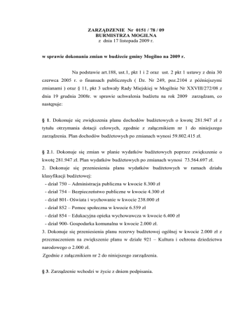 ZARZĄDZENIE Nr 0151 / 78 / 09 BURMISTRZA MOGILNA z dnia 17 listopada 2009 r. w sprawie dokonania zmian w budżecie gminy Mogilno na 2009 r. Na podstawie art.188, ust.1, pkt 1 i 2 oraz ust. 2 pkt 1 ustawy z dnia 30 czerwca 2005 r. o finansach publicznych ( Dz. Nr 249, poz.2104 z późniejszymi zmianami ) oraz § 11, pkt 3 uchwały Rady Miejskiej w Mogilnie Nr XXVIII/272/08 z dnia 19 grudnia 2008r. w sprawie uchwalenia budżetu na rok 2009 zarządzam, co następuje: § 1. Dokonuje się zwiększenia planu dochodów budżetowych o kwotę 281.947 zł z tytułu otrzymania dotacji celowych, zgodnie z załącznikiem nr 1 do niniejszego zarządzenia. Plan dochodów budżetowych po zmianach wynosi 59.802.415 zł. § 2.1. Dokonuje się zmian w planie wydatków budżetowych poprzez zwiększenie o kwotę 281.947 zł. Plan wydatków budżetowych po zmianach wynosi 73.564.697 zł. 2. Dokonuje się przeniesienia planu wydatków budżetowych w ramach działu klasyfikacji budżetowej: - dział 750 – Administracja publiczna w kwocie 8.300 zł - dział 754 – Bezpieczeństwo publiczne w kwocie 4.300 zł - dział 801- Oświata i wychowanie w kwocie 238.000 zł - dział 852 – Pomoc społeczna w kwocie 6.559 zł - dział 854 – Edukacyjna opieka wychowawcza w kwocie 6.400 zł - dział 900- Gospodarka komunalna w kwocie 2.000 zł. 3. Dokonuje się przeniesienia planu rezerwy budżetowej ogólnej w kwocie 2.000 zł z przeznaczeniem na zwiększenie planu w dziale 921 – Kultura i ochrona dziedzictwa narodowego o 2.000 zł. Zgodnie z załącznikiem nr 2 do niniejszego zarządzenia. § 3. Zarządzenie wchodzi w życie z dniem podpisania. UZASADNIENIE DO ZARZĄDZENIA Nr 0151 / 78 / 09 BURMISTRZA MOGILNA z dnia 17 listopada 2009 r. w sprawie dokonania zmian w budżecie gminy Mogilno na 2009 r. Zwiększa się budżet gminy Mogilno o 281.947 zł po stronie dochodów i wydatków w na podstawie otrzymanych decyzji z Kujawsko-Pomorskiego Urzędu Wojewódzkiego: 1. Decyzja Wojewody Kujawsko-Pomorskiego z dnia 12.11.2009r. nr WFB.I.3011-68/09 zwiększenie dotacji celowej na zadania zlecone w dziale 851 rozdział 85195 o kwotę 160 zł z przeznaczeniem na sfinansowanie poniesionych kosztów wydawania przez gminę decyzji w sprawach świadczeniobiorców innych niż ubezpieczeni spełniający kryterium dochodowe. 2. Decyzja Wojewody Kujawsko-Pomorskiego z dnia 13.11.2009r. nr WFB.I.3011-69/09 zwiększenie dotacji celowej na zadania zlecone w dziale 852 rozdział 85212 o kwotę 281.616 zł z przeznaczeniem na wypłatę świadczeń rodzinnych, świadczeń z funduszu alimentacyjnego, składek na ubezpieczenia emerytalne i rentowe z ubezpieczenia społecznego oraz kosztów utrzymania związanych z realizacja tych zadań oraz w rozdziale 85214 o kwotę 171 zł z przeznaczeniem na zasiłki i pomoc w naturze. Dokonuje się przeniesienia planu wydatków budżetowych w ramach jednego działu klasyfikacji budżetowej: 1. w dziale 852 – Pomoc społeczna w kwocie 6.559 zł pomiędzy rozdziałami tego działu, z uwagi na wystąpienie wydatków na badania lekarskie pracowników, umieszczenie jednej osoby w Domu Pomocy Społecznej, zwiększenie uprawnionych do otrzymania dodatków mieszkaniowych. 2. w zadaniach oświaty tj. w dziale 801 i w dziale 854 w kwocie ogółem 244.400 zł na podstawie analizy wykonania planu wydatków budżetowych. Zaoszczędzone środki w płacach i pochodnych od płac przeznacza się na zakupy materiałów i wyposażenia placówek oświatowych. 3. w działach: 750, 754 i 900 dokonuje się przeniesień w kwocie 14.600 zł na podstawie analizy wykonania planu wydatków budżetowych. Rezerwę budżetową ogólną z działu 758, rozdział 75818 w kwocie 2.000 zł przenosi się do: 1. działu 921, rozdział 92109 na zwiększenie planu o 2.000 zł z przeznaczeniem na zakup energii – świetlice wiejskie.