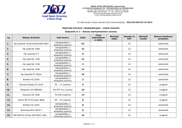 ZESPÓŁ OPIEKI ZDROWOTNEJ w Busku Zdroju ul. Bohaterów Warszawy 67, 28 – 100 Busko Zdrój, woj. Świętokrzyskie tel. centr. (041)-378-24-01, tel./fax (041) 378-24-01 wew. 244 REGON 000311467 NIP 655 – 16 – 62 – 705 Nr rej. PZOZ20 Strona internetowa;www.zoz.busko.com.pl e-mail: [email protected] Nr referencyjny nadany sprawie przez Zamawiającego: ZOZ/DO/OM/ZP/15/2014 Materiały biurowe i eksploatacyjne - wykaz tonerów Załącznik nr 1 - Arkusz asortymentowo cenowy Lp. Nazwa drukarki 1. Hp LaserJet 1010/1018/1020/3052 2. Hp LaserJet 1006 3. Hp LaserJet 6 P 4. Hp LaserJet 1320 5. Hp LaserJet 1150 6. Hp LaserJet 1200 7. Hp LaserJet M 1522n 8. Brother HL 5240 9. Kyocera Ecosys Fs 1010 10. Kod tonera kompatybilny z drukarką (czarny) kompatybilny z drukarką (czarny) kompatybilny z drukarką (czarny) kompatybilny z drukarką (czarny) kompatybilny z drukarką (czarny) kompatybilny z drukarką (czarny) kompatybilny z drukarką (czarny) kompatybilny z drukarką (czarny) Ilość Cena jednostkow a netto Wartość netto Stawka % VAT Wartość brutto Nazwa handlowa produktu 62 23 zamiennik 15 23 zamiennik 8 23 zamiennik 12 23 zamiennik 4 23 zamiennik 13 23 zamiennik 10 23 zamiennik 3 23 zamiennik TK – 17 (czarny) 6 23 oryginał Panasonic KX-MB2061 KX-FAT 411 (czrny) 10 23 oryginał 11. Kyocera SS 1900 TK-50H (czarny) 12 23 oryginał 12. Canon MF 5770 Laser Base EP – 27 (czarny) 8 23 oryginał 13. Brother HL 2035 8 23 zamiennik 14. Samsung SCX 4623 F 8 23 zamiennik 10 23 oryginał 15. OKI B431d (Toner OKI B431 10k) kompatybilny z drukarką (czarny) kompatybilny z drukarką (czarny) kompatybilny z drukarką (czarny) Strona 1 z 3 ZESPÓŁ OPIEKI ZDROWOTNEJ w Busku Zdroju ul. Bohaterów Warszawy 67, 28 – 100 Busko Zdrój, woj. Świętokrzyskie tel. centr. (041)-378-24-01, tel./fax (041) 378-24-01 wew. 244 REGON 000311467 NIP 655 – 16 – 62 – 705 Nr rej. PZOZ20 Strona internetowa;www.zoz.busko.com.pl e-mail: [email protected] Nr referencyjny nadany sprawie przez Zamawiającego: ZOZ/DO/OM/ZP/15/2014 16. Kyocera FS-2020D (toner TK-340) 17. Hp laser Jet P1102 18. Samsung SCX4300 19. HP Laser Jet 3005dn 20. HP Laser Jet M401 dn 21. Samsung CLP-320 ASAP 22. HP LaserJet m 1212nf mfp 23. Brother DCP7060D (toner Brother C-TN 2220) 24. Canon PIXMA JP 4850 25. Lexmark M310dn 26. HP Laser Jet P1606DN 27. HP Laser Jet P1005 28. HP Laseer Jet M1132 MFP 29. HP Laser Jet M1536 dnf MFP 30. Epson Stylus SX 235W Cyan 31. Epson Stylus SX 235W Magenta 32. Epson Stylus SX 235W Yellow 33. Epson Stylus SX 235W Black 34. Samsung CLP 320 –CLT-K 4072S 35. Samsung CLP 320 – CLT-Y 4072S kompatybilny z drukarką (czarny) kompatybilny z drukarką (czarny) kompatybilny z drukarką (czarny) kompatybilny z drukarką (czarny) kompatybilny z drukarką (czarny) kompatybilny z drukarką (kolor) kompatybilny z drukarką (czarny) kompatybilny z drukarką (czarny) kompatybilny z drukarką (kolor) kompatybilny z drukarką(czarny) kompatybilny z drukarką(czarny) kompatybilny z drukarką(czarny) kompatybilny z drukarką(czarny) kompatybilny z drukarką(czarny) kompatybilny z drukarką(kolor) kompatybilny z drukarką(kolor) kompatybilny z drukarką(kolor) kompatybilny z drukarką(kolor) kompatybilny z drukarką(czarny) kompatybilny z drukarką(kolor) 12 23 oryginał 12 23 zamiennik 6 23 zamiennik 6 23 zamiennik 40 23 oryginał 8 23 zamiennik 16 23 zamiennik 12 23 zamiennik 12 kompletów 23 zamiennik 40 23 zamiennik 12 23 zamiennik 15 23 zamiennik 12 23 zamiennik 9 23 zamiennik 10 23 zamiennik 10 23 zamiennik 10 23 zamiennik 20 23 zamiennik 15 23 10 23 Strona 2 z 3 ZESPÓŁ OPIEKI ZDROWOTNEJ w Busku Zdroju ul. Bohaterów Warszawy 67, 28 – 100 Busko Zdrój, woj. Świętokrzyskie tel. centr. (041)-378-24-01, tel./fax (041) 378-24-01 wew. 244 REGON 000311467 NIP 655 – 16 – 62 – 705 Nr rej. PZOZ20 Strona internetowa;www.zoz.busko.com.pl e-mail: [email protected] Nr referencyjny nadany sprawie przez Zamawiającego: ZOZ/DO/OM/ZP/15/2014 36. Samsung CLP 320-CLT-M 4072S - 37. Samsung CLP 320-CLT-C 4072S 38. Samsung CLP 365 – CLT-C 406S 39. Samsung CLP 365 – CLT-M 406S 40. Samsung CLP 365 – CLT-Y 406S 41. Samsung CLP 365 – CLT-K 406S kompatybilny z drukarką(kolor) kompatybilny z drukarką(kolor) kompatybilny z drukarką(kolor) kompatybilny z drukarką(kolor) kompatybilny z drukarką(kolor) kompatybilny z drukarką(czarny) 15 23 10 23 10 23 15 23 10 23 15 23 Razem brutto 1. Zamawiający wymaga aby dla pozycji od 1 do 8 oraz 12, 13, 16, 17 ,18, 20, 21, 22, 23, 25, 26, 27, 28, 29 toner był refabrykowany tzn. wszystkie podzespoły odpowiadające za jakość druku tj. bęben światło czuły, listwa zgarniająca, plomba powinny być wymienione na nowe. 2. Zamawiający wymaga aby dla pozycji 9, 10, 11, 12, 15, 20 toner był oryginalny. 3. Zamawiający wymaga aby dla pozycji od 1 do 19 oraz 21, 22, 23, 25, 26, 27, 28, 29 materiały eksploatacyjne – tonery były w kolorach czarny. 4. Zamawiający wymaga aby dla pozycji 24 materiały eksploatacyjne – tonery były w kolorach: czarny PGI 525 PG GK, żółty CLI 526 Y, amarantowy CLI 526 M, błękitny CLI 526 C, czarny mały BK CLI 526. 5. Zamawiający wymaga aby dla pozycji 20 materiały eksploatacyjne – tonery były w kolorach: czarny, żółty, amarantowy, błękitny. 6. Zamawiający wymaga aby dla pozycji 20 wydajność tonera wynosiła nie mniej niż 6900 stron model CF280X. Powyższa informacja powinna znajdować się na opakowaniu tonera. 7. Wydajność przy średnim pokryciu 5 % nie mniej jak 2000 stron (dot. pozycji od 1 do 8 oraz 12, 13, 16, 17, 18, 20, 21, 22, 23,24,25,26,27,28,29). ................................................................ Imię, nazwisko i podpis osoby lub osób figurujących w rejestrach uprawnionych do zaciągania zobowiązań w imieniu Wykonawcy lub we właściwym umocowaniu Strona 3 z 3