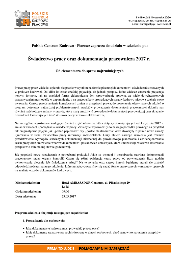 Polskie Centrum Kadrowo - Płacowe zaprasza do udziału w szkoleniu pt.: Świadectwo pracy oraz dokumentacja pracownicza 2017 r. Od elementarza do spraw najtrudniejszych Prawo pracy przez wiele lat opierało się przede wszystkim na formie pisemnej dokumentów i oświadczeń stosowanych w praktyce kadrowej. Od kilku lat coraz częściej pojawiają się jednak przepisy, które większe znaczenie przyznają nowym formom, jak na przykład forma elektroniczna. Ich wprowadzenie sprawia, że wiele dotychczasowych przyzwyczajeń musi odejść w zapomnienie, a na pracowników prowadzących sprawy kadrowo-płacowe czekają nowe wyzwania. Oprócz przedstawienia konsekwencji zmian w przepisach prawa, do poszerzenia oferty naszych szkoleń o program dotyczący najbardziej problematycznych aspektów prowadzenia dokumentacji pracowniczej skłoniły nas również nadchodzące zmiany w prawie, które mają umożliwić prowadzenie dokumentacji pracowniczej oraz składanie oświadczeń kształtujących treść stosunku pracy w formie elektronicznej. Na szczególne wyróżnienie zasługuje również część szkolenia, która dotyczy obowiązujących od 1 stycznia 2017 r. zmian w zasadach sporządzania świadectw pracy. Zmiany te wprowadziły do naszego porządku prawnego na przykład tak enigmatyczne pojęcia jak „postać papierowa” czy „postać elektroniczna” oraz stworzyły zupełnie nowe zasady ujmowania w treści świadectwa pracy informacji rodzicielskich. Duży atutem naszego szkolenia jest również przedstawienie wymogów stawianych dokumentacji niezbędnej do prawidłowego planowania i ewidencjonowania czasu pracy oraz omówienie wzorów dokumentów i postanowień umownych, które umożliwiają właściwe stosowanie przepisów o minimalnej stawce godzinowej. Jak pogodzić nowe rozwiązania z potrzebami praktyki? Jakie są wymogi i oczekiwania stawiane dokumentacji pracowniczej przez organy kontroli? Czym się różni ewidencja czasu pracy od potwierdzenia liczy godzin wykonywania zlecenia lub świadczenia usługi? Na te pytania oraz szereg innych będziemy starali się znaleźć odpowiedź podczas naszego szkolenia, któremu zdecydowaliśmy się nadać formę praktycznych warsztatów opartych na analizie wzorów dokumentów kadrowych. Miejsce szkolenia: Hotel AMBASADOR Centrum, al. Piłsudskiego 29 Łódź Godzina szkolenia: 09:00 Data szkolenia: 23.03.2017 Program szkolenia obejmuje następujące zagadnienia: 1. Prowadzenie akt osobowych: Jaką dokumentację kadrową musi prowadzić pracodawca? Jakie dokumenty są zazwyczaj archiwizowane w aktach osobowych, choć stanowi to naruszenie przepisów prawa? W jaki sposób należy zarchiwizować dokumenty, które pracownik przedstawi z opóźnieniem? Jakie są zasady zgodnej z prawem ingerencji w dokumenty zgromadzone w aktach osobowych? Czy oświadczenia złożone w postaci elektronicznej podlegają archiwizacji w aktach osobowych? Kto ponosi odpowiedzialność za nieprawidłowe prowadzenie dokumentacji pracowniczej? 2. Nawiązanie stosunku pracy: Jakie są konsekwencje stosowania nieprawidłowych kwestionariuszy osobowych? W jakich sytuacjach można odstąpić od aktualizacji informacji o dodatkowych warunkach zatrudnienia? Instrukcja prawidłowego sporządzenia umowy o pracę w oparciu o wzór umowy o pracę; Czy w umowie o pracę zawartej w celu zastępstwa należy wskazane dane osoby zastępowanej oraz rodzaj usprawiedliwionej nieobecności? W jaki sposób powinno się określać wyłącznie umowy o pracę na czas określony spod ustawowych limitów? Czy przekształcenie umowy na czas określony w umowę na czas nieokreślony należy potwierdzić w formie pisemnej? Potwierdzenie przedłużenia umowy o pracę do dnia porodu. 3. Ustanie oraz zmiana stosunku pracy: Jakie elementy należy uwzględnić w porozumieniu o zmianie treści/rozwiązaniu umowy o pracę? Oświadczenie o wypowiedzeniu umowy o pracę a oświadczenie o rozwiązaniu umowy o pracę bez zachowania okresu wypowiedzenia; W jaki sposób pozyskiwać informację, która organizacja związkowa reprezentuje pracownika, jeśli w zakładzie działa więcej niż jedna organizacja związkowa? Jakie informacje należy zawrzeć w poleceniu, mocą którego następuje zwolnienie pracownika z obowiązku świadczenia pracy? Jak powinno być sformułowane porozumienie stron o zwolnieniu z obowiązku świadczenia pracy? Jakie informacje należy zawrzeć w poleceniu wykorzystania urlopu wypoczynkowego w okresie wypowiedzenia? Jakie elementy powinno zawierać porozumienie o przeniesieniu prawa do urlopu wypoczynkowego na kolejny stosunek pracy? 4. Sporządzenie świadectwa pracy od 1 stycznia 2017 r. W jakich sytuacjach należy wydać świadectwo pracy w nowym stanie prawnym? Jak pogodzić nowe zasady wydawania świadectw pracy z dotychczasowymi regułami? W jakich sytuacjach konieczne jest wydanie świadectwa pracy do 30 czerwca 2017 r.? Co oznacza postać papierowa lub elektroniczna wniosku o wydanie świadectwa pracy? Jaki poprawnie liczyć terminy związane z powstaniem obowiązku wydania świadectwa pracy? W jakich sytuacjach pracodawca musi wydać świadectwa pracy w dniu rozwiązania stosunku pracy a w ciągu 7 dni od dnia ustania stosunku pracy? Czy świadectwo pracy można wydać za pośrednictwem firmy kurierskiej? Jakie konsekwencje niesie nadanie charakteru pomocniczego wzorowi świadectwa pracy? Czy świadectwo pracy może zostać sporządzone w sposób zupełnie odmienny od wzoru stanowiącego załącznik do rozporządzenia? Jakie dokumenty związane z wydaniem świadectwa pracy mogą być sporządzone w postaci papierowej lub elektronicznej, a jakie wymagają zastosowania formy pisemnej? Czy pracownik może SMS-em bądź za pomocą poczty elektronicznej żądać sprostowania świadectwa pracy? W jakich sytuacjach i w jaki sposób należy wskazać w świadectwie pracy podstawę prawną rozwiązania stosunku pracy (np. art. 52 Kodeksu pracy)? W jakich sytuacjach należy w świadect