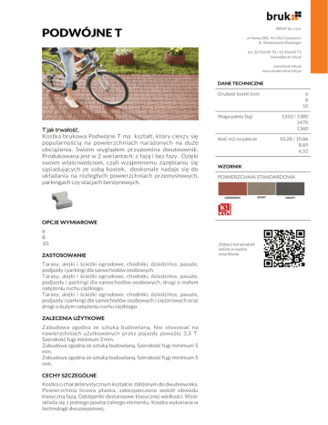 PODWÓJNE T BRUK Sp. z o.o. ul. Nowa 28G, 44-352 Czyzowice (k. Wodzislawia Slaskiego) tel. 32 456 09 70 / 32 456 09 71 [email protected] www.bruk.info.pl www.modernline.info.pl DANE TECHNICZNE Grubość kostki (cm) Waga palety [kg] T jak trwałość. Kostka brukowa Podwójne T ma kształt, który cieszy się popularnością na powierzchniach narażonych na duże obciążenia. Swoim wyglądem przypomina dwuteownik. Produkowana jest w 2 wariantach: z fazą i bez fazy. Dzięki swoim właściwościom, czyli wzajemnemu zazębianiu się sąsiadujących ze sobą kostek, doskonale nadaje się do układania na rozległych powierzchniach przemysłowych, parkingach czy stacjach benzynowych. Tarasy, alejki i ścieżki ogrodowe, chodniki, dziedzińce, pasaże, podjazdy i parkingi dla samochodów osobowych. Tarasy, alejki i ścieżki ogrodowe, chodniki, dziedzińce, pasaże, podjazdy i parkingi dla samochodów osobowych, drogi o małym natężeniu ruchu ciężkiego. Tarasy, alejki i ścieżki ogrodowe, chodniki, dziedzińce, pasaże, podjazdy i parkingi dla samochodów osobowych i ciężarowych oraz drogi o dużym natężeniu ruchu ciężkiego. ZALECENIA UŻYTKOWE Zabudowa zgodna ze sztuką budowlaną. Nie stosować na nawierzchniach użytkowanych przez pojazdy powyżej 3,5 T. Szerokość fugi minimum 3 mm. Zabudowa zgodna ze sztuką budowlaną. Szerokość fugi minimum 5 mm. Zabudowa zgodna ze sztuką budowlaną. Szerokość fugi minimum 5 mm. CECHY SZCZEGÓLNE Kostka o charakterystycznym kształcie zbliżonym do dwuteownika. Powierzchnia licowa płaska, zabezpieczona wokół obwodu klasyczną fazą. Odstępniki dystansowe klasycznej wielkości. Wzór składa się z jednego powtarzalnego elementu. Kostka wykonana w technologii dwuzasypowej. 10,28 / 10,86 8,69 6,52 WZORNIK POWIERZCHNIA STANDARDOWA OPCJE WYMIAROWE ZASTOSOWANIE 1310 / 1380 1470 1360 Ilość m2 na palecie CZERWONY 6 8 10 6 8 10 Zobacz ten produkt online w swoim smartfonie SZARY GRAFIT Kostka o charakterystycznym kształcie zbliżonym do dwuteownika. Powierzchnia licowa płaska, zabezpieczona wokół obwodu klasyczną fazą. Dostępna również wersja bez fazy. Odstępniki dystansowe klasycznej wielkości. Wzór składa się z jednego powtarzalnego elementu. Kostka wykonana w technologii dwuzasypowej. Kostka o charakterystycznym kształcie zbliżonym do dwuteownika. Powierzchnia licowa płaska, zabezpieczona wokół obwodu klasyczną fazą. Dostępna również wersja bez fazy. Odstępniki dystansowe klasycznej wielkości. Wzór składa się z jednego powtarzalnego elementu. Kostka wykonana w technologii dwuzasypowej.