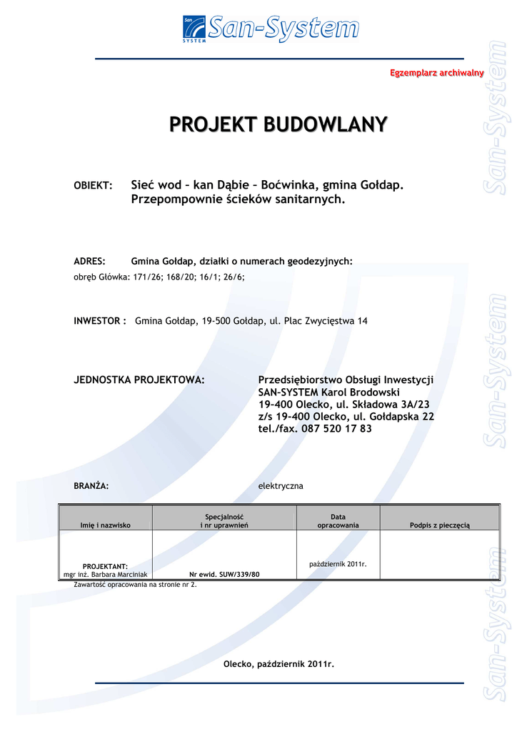 EEggzzeem mppllaarrzz aarrcchhiiw waallnnyy PROJEKT BUDOWLANY OBIEKT: Sieć wod – kan Dąbie – Boćwinka, gmina Gołdap. Przepompownie ścieków sanitarnych. ADRES: Gmina Gołdap, działki o numerach geodezyjnych: obręb Główka: 171/26; 168/20; 16/1; 26/6; INWESTOR : Gmina Gołdap, 19-500 Gołdap, ul. Plac Zwycięstwa 14 JEDNOSTKA PROJEKTOWA: Przedsiębiorstwo Obsługi Inwestycji SAN–SYSTEM Karol Brodowski 19–400 Olecko, ul. Składowa 3A/23 z/s 19-400 Olecko, ul. Gołdapska 22 tel./fax. 087 520 17 83 BRANśA: elektryczna Imię i nazwisko Specjalność i nr uprawnień PROJEKTANT: mgr inŜ. Barbara Marciniak Nr ewid. SUW/339/80 Zawartość opracowania na stronie nr 2. Data opracowania październik 2011r. Olecko, październik 2011r. Podpis z pieczęcią ZAWARTOŚĆ OPRACOWANIA Sieć wod-kan Dąbie – Boćwinka, gmina Gołdap. Przepompownie ścieków sanitarnych. BranŜa elektryczna. Spis treści: A. 1. 2. 2.1. 2.2. 3. 3.1. 3.2. 3.3. 4. Opis techniczny ............................................................................................. 3 Podstawa opracowania...................................................................................... 3 Przedmiot, zakres i cel opracowania..................................................................... 3 Dane i załoŜenia ogólne .................................................................................... 3 Zestawienie podstawowych danych ...................................................................... 3 Opis wykonania projektowanej instalacji ............................................................... 3 Za licznikowe linie kablowe................................................................................ 3 Szafki sterownicze pompowni ............................................................................. 3 Wymagane pomiary i badania ............................................................................. 4 Obliczenia ..................................................................................................... 4 B. Rysunki techniczne 1. Projektowana lokalizacja złączy kablowych i szaf sterowniczych przepompowni sieciowych i przydomowych – rys E1. C. Inne załączniki 1. Warunki przyłączenia urządzeń elektrycznych do sieci elektroenergetycznej 4 kpl. kopii. – 2. Kopia uprawnień projektanta. 3. Kopia przynaleŜności do IZB-y. D. Dokumentacja związana 1. Projekt budowlany „Sieć wod-kan Dąbie – Boćwinka, gmina Gołdap. BranŜa sanitarna”. 2. Projekt budowlany „Sieć wod-kan Dąbie – Boćwinka, gmina Gołdap. Przepompownie ścieków sanitarnych. BranŜa sanitarna”. 2 Przedsiębiorstwo Obsługi Inwestycji San—System Karol Brodowski – www. san—system.com.pl OPIS TECHNICZNY Sieć wod-kan Dąbie – Boćwinka, gmina Gołdap. Przepompownie ścieków sanitarnych. BranŜa elektryczna. A. Opis techniczny 1. Podstawa opracowania Projekty zagospodarowania terenu i technologii pompowni. Ustalenia z inwestorem. Warunki przyłączenia urządzeń elektrycznych do sieci elektroenergetycznej wydane przez PGE Dystrybucja Białystok, Zakład Sieci Ełk. Obowiązujące normy i przepisy budowy linii kablowych. 2. Przedmiot, zakres i cel opracowania Przedmiotem opracowania jest projekt linii kablowych za licznikowych zasilających przepompownie ścieków SP1 – SP3 i PD1 sieci kanalizacji sanitarnej Dąbie-Bocwinka, Gmina Gołdap. 2.1. 2.2. Dane i załoŜenia ogólne KaŜda pompownia dostarczana jest łącznie z rozdzielnią zasilania i sterowania elektrycznego pomp. Przyłącze i szafki złączowe z pomiarem zapewnia PGE Dystrybucja Białystok zgodnie z umowami przyłączenia. Szafki złączowo-pomiarowe zlokalizowane są przy ogrodzeniach przepompowni SP1-SP2 i przy pompowniach SP3 i PD1. Od szafek złączowo –pomiarowych do szafek sterowniczych przepompowni projektowane są linie kablowe. Układ zasilania TN-C-S, Un-230/400V, podział PEN na PE i N w złączu kablowo-pomiarowym. Uziom punktu podziału wykonuje odbiorca energii. Zestawienie podstawowych danych Oznaczenie pompowni Warunki przyłączenia Moc zapotrzebowana [kW] SP1 SP2 SP3 PD1 ZS4-8/994/2011 ZS4-8/996/2011 ZS4-8/995/2011 ZS4-8/993/2011 16 16 10 6 In[A] zabezpieczenia przed licznikowego 25 25 16 10 Dobrany kabel od licznika do szafy rozdzielczej pompowni YKY 5x6mm2 YKY 5x6mm2 YKY 5x6mm2 YKY 5x4mm2 Długość linii kablowej [m] 10 10 10 10 3. Opis wykonania projektowanej instalacji 3.1. Za licznikowe linie kablowe Linie kablowe na odcinku złącze – szafka sterownicza przepompowni naleŜy układać w gruncie zachowując wymagane odległości od rurociągów kanalizacyjnych. Przy złączach i rozdzielnicach pozostawić zapas kabli ok. 1m. Kabel w ziemi naleŜy ułoŜyć na głębokości dostosowanej do fundamentów złącz i szafek sterowniczych, lecz nie płycej jak 0,7m . Na całej długości kable osłonić rurą ochronną AROT DVD 50 w kolorze niebieskim. zastosować podsypkę piaskową po 10cm pod i nad kablem. Wykop przysypać gruntem do wys. 25cm i następnie rozłoŜyć folię w kolorze niebieskim. Wykop uzupełnić gruntem i wyrównać teren. Do uziemienia szyny PE szafek sterowniczych przepompowni wykonać uziom pionowy stosując pręty uziemiające fi 16 mm ocynkowane. Połączenia między prętami wyk. z bednarki ocynkowane gr. 4 mm. Liczba prętów - aŜ do uzyskania rezystancji uziomu 10Ω. Połączenie z PE przez zacisk kontrolny. Z uziomem połączyć szynę PEN w złączu pomiarowym energetyki. 3.2. Szafki sterownicze pompowni Są urządzeniami dostarczanymi i montowanym zgodnie z projektem technologicznym przepompowni. Linie zasilające i sterownicze od szafek do urządzeń pompowni realizowane są w oparciu o projekt technologii. 3 Przedsiębiorstwo Obsługi Inwestycji San—System Karol Brodowski – www. san—system.com.pl OPIS TECHNICZNY Sieć wod-kan Dąbie – Boćwinka, gmina Gołdap. Przepompownie ścieków sanitarnych. BranŜa elektryczna. 3.3. Wymagane pomiary i badania Po zakoń