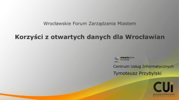 Wrocławskie Forum Zarządzania Miastem Korzyści z otwartych danych dla Wrocławian Centrum Usług Informatycznych Tymoteusz Przybylski Korzyści z otwartych danych dla Wrocławian 1.Otwarte dane we Wrocławiu i innych miastach 2.Korzyści: - społeczeństwo - gospodarka - wydajność 3.Plany na przyszłość Otwarte dane we Wrocławiu i innych miastach Korzyści: Żródło: https://www.europeandataportal.eu/pl/using-data/benefits-of-open-data Korzyści: SPOŁECZEŃSTWO -Zwiększenie przejrzystości i odpowiedzialności. - Zwiększenie uczestnictwa. Korzyści: GOSPODARKA - Budowanie nowych modeli biznesowych. - Tworzenie innowacyjnych usług. Korzyści: WYDAJNOŚĆ - Poprawa jakości usług. - Podnoszenie efektywności usług publicznych. Plany na przyszłość: 1. Budowa nowego portalu. 2. Budowa modelu danych. 3. Budowa ekstraktorów i API w nowych systemach informatycznych. Dziękuję za uwagę!