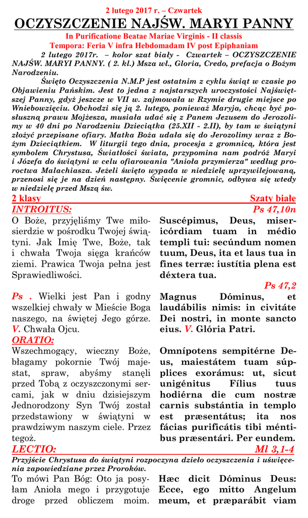 2 lutego 2017 r. – Czwartek OCZYSZCZENIE NAJŚW. MARYI PANNY In Purificatione Beatae Mariae Virginis - II classis Tempora: Feria V infra Hebdomadam IV post Epiphaniam 2 lutego 2017r. – kolor szat biały - Czwartek – OCZYSZCZENIE NAJŚW. MARYI PANNY. ( 2. kl.) Msza wł., Gloria, Credo, prefacja o Bożym Narodzeniu. Święto Oczyszczenia N.M.P jest ostatnim z cyklu świąt w czasie po Objawieniu Pańskim. Jest to jedna z najstarszych uroczystości Najświętszej Panny, gdyż jeszcze w VII w. zajmowała w Rzymie drugie miejsce po Wniebowzięciu. Obchodzi się ją 2. lutego, ponieważ Maryja, chcąc być posłuszną prawu Mojżesza, musiała udać się z Panem Jezusem do Jerozolimy w 40 dni po Narodzeniu Dzieciątka (25.XII - 2.II), by tam w świątyni złożyć przepisane ofiary. Matka Boża udała się do Jerozolimy wraz z Bożym Dzieciątkiem. W liturgii tego dnia, procesja z gromnicą, która jest symbolem Chrystusa, Światłości świata, przypomina nam podróż Maryi i Józefa do świątyni w celu ofiarowania "Anioła przymierza" według proroctwa Malachiasza. Jeżeli święto wypada w niedzielę uprzywilejowaną, przenosi się je na dzień następny. Święcenie gromnic, odbywa się wtedy w niedzielę przed Mszą św. 2 klasy INTROITUS: O Boże, przyjęliśmy Twe miłosierdzie w pośrodku Twojej świątyni. Jak Imię Twe, Boże, tak i chwała Twoja sięga krańców ziemi. Prawica Twoja pełna jest Sprawiedliwości. Szaty białe Ps 47,10n Suscépimus, Deus, misericórdiam tuam in médio templi tui: secúndum nomen tuum, Deus, ita et laus tua in fines terræ: iustítia plena est déxtera tua. Ps 47,2 Ps . Wielki jest Pan i godny Magnus Dóminus, et wszelkiej chwały w Mieście Boga laudábilis nimis: in civitáte naszego, na świętej Jego górze. Dei nostri, in monte sancto V. Chwała Ojcu. eius. V. Glória Patri. ORATIO: Wszechmogący, wieczny Boże, Omnípotens sempitérne Debłagamy pokornie Twój maje- us, maiestátem tuam súpstat, spraw, abyśmy stanęli plices exorámus: ut, sicut przed Tobą z oczyszczonymi ser- unigénitus Fílius tuus cami, jak w dniu dzisiejszym hodiérna die cum nostræ Jednorodzony Syn Twój został carnis substántia in templo przedstawiony w świątyni w est præsentátus; ita nos prawdziwym naszym ciele. Przez fácias purificátis tibi méntitegoż. bus præsentári. Per eundem. LECTIO: Ml 3,1-4 Przyjście Chrystusa do świątyni rozpoczyna dzieło oczyszczenia i uświęcenia zapowiedziane przez Proroków. To mówi Pan Bóg: Oto ja posy- Hæc dicit Dóminus Deus: łam Anioła mego i przygotuje Ecce, ego mitto Angelum droge przed obliczem moim. meum, et præparábit viam A przyjdzie natychmiast do swojej świątyni Władca, którego wy szukacie i Anioł Przymierza, którego wy pragniecie. Oto przybywa – mówi Pan Zastępów; i któż zdoła myślą objąć dzień przyjścia Jego, i któż się ostoi na Jego widok. On bowiem jest jako ogień, co topi, i jako ziele farbiarzy. I usiądzie topiąc i oczyszczając srebro; i oczyści synów Lewi, i przecedzi ich niby złoto i srebro, a będą Panu składać ofiary według sprawiedliwości. I będzie się podobać Panu ofiara Judy i Jeruzalem jako za dawnych dni i jako za lat dawno minionych: mówi Pan Wszechmogący. ante fáciem meam. Et statim véniet ad templum suum Dominátor, quem vos quaeritis, et Angelus testaménti, quem vos vultis. Ecce, venit, dicit Dóminus exercítuum: et quis póterit cogitáre diem advéntus eius, et quis stabit ad vidéndum eum? Ipse enim quasi ignis conflans et quasi herba fullónum: et sedébit conflans et emúndans argéntum, et purgábit fílios Levi et colábit eos quasi aurum et quasi argéntum: et erunt Dómino offeréntes sacrifícia in iustítia. Et placébit Dómino sacrifícium Iuda et Ierúsalem, sicut dies sæculi et sicut anni antíqui: dicit Dóminus omnípotens. Ps 47,10.11.9 Suscépimus, Deus, misericórdiam tuam in médio templi tui: secúndum nomen tuum, Deus, ita et laus tua in fines terræ. V. Sicut audívimus, ita et vídimus in civitáte Dei nostri, in monte sancto eius. GRADUALE: O Boże, przyjęliśmy Twe miłosierdzie w pośrodku Twojej świątyni. Jak Imię Twe, Boże, tak i chwała Twoja sięga krańców ziemi. V. Jakośmy słyszeli, tak ujrzeliśmy w mieście Boga naszego, na górze Jego świętej. ALLELÚIA: Alleluja, alleluja. V. Starzec Allelúia, allelúia. V. Senex niósł dziecię, lecz dziecię star- Púerum portábat: Puer cem rządziło. Alleluja. autem senem regébat. Allelúia. EVANGELIUM: Onego czasu: Gdy się wypełniły dni oczyszczenia Maryi według Prawa Mojżeszowego, przynieśli Jezusa do Jeruzalem, aby stawić Go przed Panem, jako napisano jest w prawie Pańskim: Każdy chłopiec pierworodny będzie poświęcony Panu, oraz, by złożyć ofiarę według tego, co powie- Łk 2,22-32 In illo témpore: Postquam impleti sunt dies purgatiónis Maríæ, secúndum legem Moysi, tulérunt Iesum in Ierúsalem, ut sísterent eum Dómino, sicut scriptum est in lege Dómini: Quia omne masculínum adapériens vulvam sanctum Dómino dziano w prawie Pańskim, parę synogarlic albo dwa gołąbki. A oto był w Jerozolimie człowiek imieniem Symeon, a ten był sprawiedliwym i bojącym się Boga, i wyczekiwał pociechy Izraela, a Duch Święty był w nim. I otrzymał był zapowiedź od Ducha Świętego, że nie umrze, dopóki by pierwej nie oglądał Chrystusa Pańskiego. A wiedziony natchnieniem, przybył do świątyni. I gdy wnosili Dzieciątko Jezus rodzice Jego, aby ze względu na Nie wypełnić przepis prawa, on wziął je na ręce swoje i wielbił Boga, mówiąc: «Teraz, o Panie, według Twego słowa, uwalniasz sługę Twego w pokoju, bo moje oczy ujrzały Twoje zbawienie, któreś zgotował dla wszystkich narodów: Światło na objawienie dla pogan i chwałę ludu Twego, Izraela». vocábitur. Et ut darent hóstiam, secúndum quod dictum est in lege Dómini, par túrturum aut duos pullos columbárum. Et ecce, homo erat in Ierúsalem, cui 