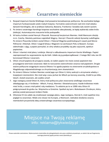 Cesarstwo niemieckie 1. Rozpad imperium Karola Wielkiego miał poważne konsekwencje polityczne. Na wschodzie byłego imperium funkcjonowało wiele małych księstw. Formalnie zwierzchnośd nad nimi miał władca dynastii Karolingów, ale w praktyce Saksonia, Bawaria, Frankonia i Szwabia żyły swoim życiem. 2. Po śmierci ostatniego Karolinga księstwa wschodnie zdecydowały, że będą wybierały sobie króla (elekcja). Automatycznie znaczenie króla podupadło. 3. W koocu królem został Henryk I Ptasznik. Rozszerzył terytorium Niemiec. Hołd Niemcom złożyły m.in. Czechy. Niestety paostwo najeżdżali Węgrzy. Henryk I Ptasznik założył dynastię Ludofingów. Po śmierci Ptasznika królem został Otton I. Pokonał Węgrów podchodzących nawet pod Morze Północne i Atlantyk. Otton I wygrał bitwę z Węgrami na Lechowym Polu w Bawarii. Europa odetchnęła z ulgą, a papież pomyślał, że silny władca przydałby się jako sojusznik, opiekun papiestwa. 4. Otton I również miał plany i ambicje. Marzył o odbudowaniu imperium Karola Wielkiego. Papież zaproponował mu wyprawienie się do Italii. Udało się ją podporządkowad. 2 lutego 962 roku Jan XII koronował Ottona I cesarzem. 5. Otton zmusił papieża do przyjęcia zasady, że żaden papież nie może zostad papieżem bez przysięgania wierności cesarzowi. Było to narzucenie zwierzchności cesarza nad papieżem. Drugie ważne polityczne osiągnięcie cesarza Ottona I to zgoda papieża na utworzenie arcybiskupstwa w Magdeburgu odpowiedzialnego za chrystianizację ziem słowiaoskich. 6. Po śmierci Ottona I królem Niemiec został jego syn Otton II, który walczył o utrzymanie władzy z książętami niemieckimi. Nie miał więc czasu jechad do Włoch po koronę cesarską. Zrobił to po kilku latach. Został cesarzem, ale szybko umarł. 7. Jego następcą został Otton III, który miał polityczny plan stworzenia wielkiego cesarstwa składającego się z 4 królestw - Włoch, Francji, Niemiec i Słowiaoszczyzny. Każde królestwo miało mied króla, a cesarz miał pełnid rolę mediatora. To właśnie po to w 1000 roku Otton III pielgrzymował do grobu św. Wojciecha w Gnieźnie. Spotkał się tam z Bolesławem Chrobrym, który później został pierwszym królem Polski. 8. Ottonowi III nie udało się zrealizowad swojego planu. Jego następca, Henryk II, miał zupełnie inny pogląd na cesarstwo. Miało ono służyd nie Europie, a Niemcom. Jednakże działania cesarzy niemieckich przywróciły ideę uniwersalnego cesarstwa europejskiego. Prawa autorskie zastrzeżone. Wykorzystanie materiałów do jakiegokolwiek celu poza użytkiem prywatnym, w całości lub we fragmencie, wymaga pisemnej zgody portalu www.lykwiedzy.pl