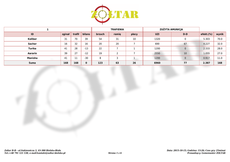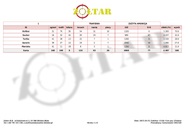 1 TRAFIENIA ZUŻYTA AMUNICJA ID zginał trafił bilans brzuch ramię plecy UZI D-D efekt.(%) wynik Koliber 31 70 39 54 31 10 1320 0 5.303 70.0 Sacher 16 32 16 20 20 7 690 67 4.227 32.0 Turika 41 28 -13 22 7 1 1200 0 2.333 28.0 Aararin 39 27 -12 19 2 7 2550 10 1.055 27.0 Manisha 41 11 -30 8 3 1 1200 0 0.917 11.0 Suma 168 168 0 123 63 26 6960 77 2.387 168 Zoltar B-B - ul.Sukiennicza 3, 43-300 Bielsko-Biała Tel.:+48 791 121 530, e-mail:[email protected] Strona 1 z 6 Data: 2015-10-15; Godzina: 13:26; Czas gry: 25minut Prowadzący: Gamemaster ZOLTAR Czarodziejskie Zołzy TRAFIENIA ZUŻYTA AMUNICJA ID zginał trafił bilans brzuch ramię plecy UZI D-D Shg efekt.(%) wynik Koliber 3 14 11 9 2 4 660 0 0 2.121 14.0 Manisha 8 11 3 6 4 1 1200 0 0 0.917 11.0 Turika 7 7 0 4 3 1 660 1 0 1.059 7.0 Suma 18 32 14 19 9 6 2520 1 0 1.269 32 Szwagry TRAFIENIA ZUŻYTA AMUNICJA ID zginał trafił bilans brzuch ramię plecy UZI D-D Shg efekt.(%) wynik Aakarin 17 10 -7 7 2 2 1110 16 0 0.888 10.0 Sacher 15 8 -7 6 1 1 1260 2 7 0.630 8.0 Suma 32 18 -14 13 3 3 2370 18 7 0.752 18 Zoltar B-B - ul.Sukiennicza 3, 43-300 Bielsko-Biała Tel.:+48 791 121 530, e-mail:[email protected] Czarodziejskie Zołzy Szwagry 32 18 Strona 2 z 6 Data: 2015-10-15; Godzina: 14:07; Czas gry: 19minut Prowadzący: Gamemaster ZOLTAR 1 TRAFIENIA ZUŻYTA AMUNICJA ID zginał trafił bilans brzuch ramię plecy UZI D-D efekt.(%) wynik Koliber 43 42 -1 28 16 8 1410 3 2.972 42.0 Marisha 29 36 7 23 12 3 2700 0 1.333 36.0 Sacher 16 31 15 23 17 7 60 98 19.620 31.0 Aakarin 31 22 -9 18 9 4 180 81 8.429 22.0 Turika 34 22 -12 16 4 4 1140 0 1.930 22.0 Suma 153 153 0 108 58 26 5490 182 2.697 153 Zoltar B-B - ul.Sukiennicza 3, 43-300 Bielsko-Biała Tel.:+48 791 121 530, e-mail:[email protected] Strona 3 z 6 Data: 2015-10-15; Godzina: 14:44; Czas gry: 25minut Prowadzący: Gamemaster ZOLTAR Drużyny Miejsce Zoltar B-B - ul.Sukiennicza 3, 43-300 Bielsko-Biała Tel.:+48 791 121 530, e-mail:[email protected] Rozgrywki Nazwa 1 2 3 Suma Czarodziejskie Zołzy - 32 - 32 Szwagry - 18 - 18 Strona 4 z 6 Data: 2015-10-15 Prowadzący: Gamemaster ZOLTAR Zestawienie wg wyniku Miejsce TRAFIENIA ZUŻYTA AMUNICJA ID zginał trafił bilans brzuch ramię plecy UZI D-D Shg efekt.(%) wynik Koliber 62.36 104.34 41.98 75.07 39.71 18.61 2878.74 2.40 0.00 3.621 104.34 Marisha 69.60 86.40 16.80 55.20 28.80 7.20 6480.00 0.00 0.00 1.333 86.40 Aararin 93.60 64.80 -28.80 45.60 4.80 16.80 6120.00 24.00 0.00 1.055 64.80 4 Sacher 41.39 58.82 17.43 40.72 30.65 12.25 1926.32 134.11 7.37 2.845 58.82 5 Turika 67.37 47.37 -20.00 34.61 11.96 5.05 2566.74 1.05 0.00 1.845 47.37 6 Aakarin 64.04 42.19 -21.85 32.65 13.96 7.96 1968.63 122.46 0.00 2.018 42.19 7 Manisha 61.83 30.57 -31.26 19.07 9.92 2.78 3334.74 0.00 0.00 0.917 30.57 Zestawienie wg bilansu Miejsce TRAFIENIA ZUŻYTA AMUNICJA ID zginał trafił bilans brzuch ramię plecy UZI D-D Shg efekt.(%) wynik Koliber 62.36 104.34 41.98 75.07 39.71 18.61 2878.74 2.40 0.00 3.621 104.34 Sacher 41.39 58.82 17.43 40.72 30.65 12.25 1926.32 134.11 7.37 2.845 58.82 Marisha 69.60 86.40 16.80 55.20 28.80 7.20 6480.00 0.00 0.00 1.333 86.40 4 Turika 67.37 47.37 -20.00 34.61 11.96 5.05 2566.74 1.05 0.00 1.845 47.37 5 Aakarin 64.04 42.19 -21.85 32.65 13.96 7.96 1968.63 122.46 0.00 2.018 42.19 6 Aararin 93.60 64.80 -28.80 45.60 4.80 16.80 6120.00 24.00 0.00 1.055 64.80 7 Manisha 61.83 30.57 -31.26 19.07 9.92 2.78 3334.74 0.00 0.00 0.917 30.57 Zoltar B-B - ul.Sukiennicza 3, 43-300 Bielsko-Biała Tel.:+48 791 121 530, e-mail:[email protected] Strona 5 z 6 Data: 2015-10-15 Prowadzący: Gamemaster ZOLTAR Zestawienie wg efektywności Miejsce TRAFIENIA ZUŻYTA AMUNICJA ID zginał trafił bilans brzuch ramię plecy UZI D-D Shg efekt.(%) wynik Koliber 62.36 104.34 41.98 75.07 39.71 18.61 2878.74 2.40 0.00 3.621 104.34 Sacher 41.39 58.82 17.43 40.72 30.65 12.25 1926.32 134.11 7.37 2.845 58.82 Aakarin 64.04 42.19 -21.85 32.65 13.96 7.96 1968.63 122.46 0.00 2.018 42.19 4 Turika 67.37 47.37 -20.00 34.61 11.96 5.05 2566.74 1.05 0.00 1.845 47.37 5 Marisha 69.60 86.40 16.80 55.20 28.80 7.20 6480.00 0.00 0.00 1.333 86.40 6 Aararin 93.60 64.80 -28.80 45.60 4.80 16.80 6120.00 24.00 0.00 1.055 64.80 7 Manisha 61.83 30.57 -31.26 19.07 9.92 2.78 3334.74 0.00 0.00 0.917 30.57 Zoltar B-B - ul.Sukiennicza 3, 43-300 Bielsko-Biała Tel.:+48 791 121 530, e-mail:[email protected] Strona 6 z 6 Data: 2015-10-15 Prowadzący: Gamemaster ZOLTAR
