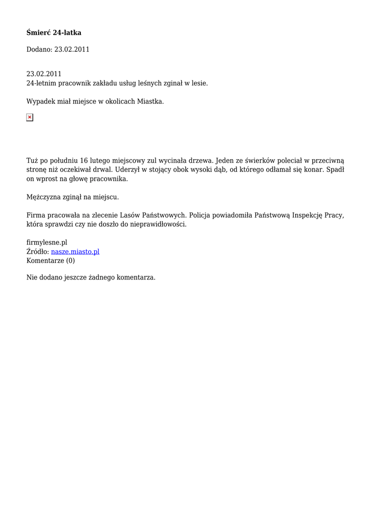 Śmierć 24-latka Dodano: 23.02.2011 23.02.2011 24-letnim pracownik zakładu usług leśnych zginał w lesie. Wypadek miał miejsce w okolicach Miastka. Tuż po południu 16 lutego miejscowy zul wycinała drzewa. Jeden ze świerków poleciał w przeciwną stronę niż oczekiwał drwal. Uderzył w stojący obok wysoki dąb, od którego odłamał się konar. Spadł on wprost na głowę pracownika. Mężczyzna zginął na miejscu. Firma pracowała na zlecenie Lasów Państwowych. Policja powiadomiła Państwową Inspekcję Pracy, która sprawdzi czy nie doszło do nieprawidłowości. firmylesne.pl Źródło: nasze.miasto.pl Komentarze (0) Nie dodano jeszcze żadnego komentarza.