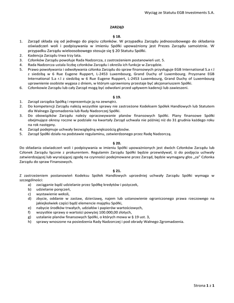 Wyciąg ze Statutu EGB Investments S.A. ZARZĄD 1. 2. 3. 4. 5. 6. 1. 2. 3. 4. 5. § 18. Zarząd składa się od jednego do pięciu członków. W przypadku Zarządu jednoosobowego do składania oświadczeo woli i podpisywania w imieniu Spółki upoważniony jest Prezes Zarządu samoistnie. W przypadku Zarządu wieloosobowego stosuje się § 20 Statutu Spółki. Kadencja Zarządu trwa trzy lata. Członków Zarządu powołuje Rada Nadzorcza, z zastrzeżeniem postanowieo ust. 5. Rada Nadzorcza ustala liczbę członków Zarządu i określa ich funkcje w Zarządzie. Prawo powoływania i odwoływania członka Zarządu do spraw finansowych przysługuje EGB International S.a r.l z siedzibą w 6 Rue Eugene Ruppert, L-2453 Luxembourg, Grand Duchy of Luxembourg. Przyznane EGB International S.a r.l z siedzibą w 6 Rue Eugene Ruppert, L-2453 Luxembourg, Grand Duchy of Luxembourg uprawnienie osobiste wygasa z dniem, w którym uprawniony przestaje byd akcjonariuszem Spółki. Członkowie Zarządu lub cały Zarząd mogą byd odwołani przed upływem kadencji lub zawieszeni. § 19. Zarząd zarządza Spółką i reprezentuje ją na zewnątrz. Do kompetencji Zarządu należą wszystkie sprawy nie zastrzeżone Kodeksem Spółek Handlowych lub Statutem dla Walnego Zgromadzenia lub Rady Nadzorczej Spółki. Do obowiązków Zarządu należy opracowywanie planów finansowych Spółki. Plany finansowe Spółki obejmujące okresy roczne w podziale na kwartały Zarząd uchwala nie później niż do 31 grudnia każdego roku na rok następny. Zarząd podejmuje uchwały bezwzględną większością głosów. Zarząd Spółki działa na podstawie regulaminu, zatwierdzonego przez Radę Nadzorczą. § 20. Do składania oświadczeo woli i podpisywania w imieniu Spółki upoważnionych jest dwóch Członków Zarządu lub Członek Zarządu łącznie z prokurentem. Regulamin Zarządu Spółki będzie przewidywał, iż do podjęcia uchwały zatwierdzającej lub wyrażającej zgodę na czynności podejmowane przez Zarząd, będzie wymagany głos „za” Członka Zarządu do spraw Finansowych. § 21. Z zastrzeżeniem postanowieo Kodeksu Spółek Handlowych uprzedniej uchwały Zarządu Spółki wymaga w szczególności: a) zaciąganie bądź udzielanie przez Spółkę kredytów i pożyczek, b) udzielanie poręczeo, c) wystawienie weksli, d) zbycie, oddanie w zastaw, dzierżawę, najem lub ustanowienie ograniczonego prawa rzeczowego na jakiejkolwiek części bądź elemencie majątku Spółki, e) nabycie środków trwałych, udziałów i papierów wartościowych, f) wszystkie sprawy o wartości powyżej 100.000,00 złotych, g) ustalanie planów finansowych Spółki, o których mowa w § 19 ust. 3, h) sprawy wnoszone na posiedzenia Rady Nadzorczej i pod obrady Walnego Zgromadzenia. Strona 1 z 1