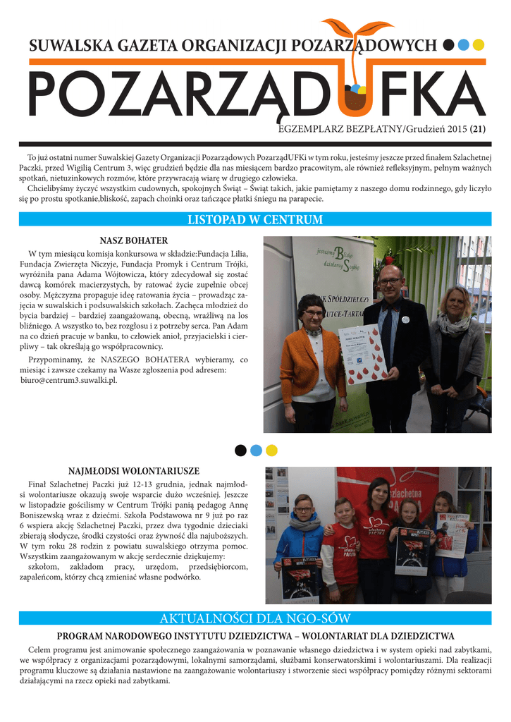 EGZEMPLARZ BEZPŁATNY/Grudzień 2015 (21) To już ostatni numer Suwalskiej Gazety Organizacji Pozarządowych PozarządUFKi w tym roku, jesteśmy jeszcze przed finałem Szlachetnej Paczki, przed Wigilią Centrum 3, więc grudzień będzie dla nas miesiącem bardzo pracowitym, ale również refleksyjnym, pełnym ważnych spotkań, nietuzinkowych rozmów, które przywracają wiarę w drugiego człowieka. Chcielibyśmy życzyć wszystkim cudownych, spokojnych Świąt – Świąt takich, jakie pamiętamy z naszego domu rodzinnego, gdy liczyło się po prostu spotkanie,bliskość, zapach choinki oraz tańczące płatki śniegu na parapecie. LISTOPAD W CENTRUM NASZ BOHATER W tym miesiącu komisja konkursowa w składzie:Fundacja Lilia, Fundacja Zwierzęta Niczyje, Fundacja Promyk i Centrum Trójki, wyróżniła pana Adama Wójtowicza, który zdecydował się zostać dawcą komórek macierzystych, by ratować życie zupełnie obcej osoby. Mężczyzna propaguje ideę ratowania życia – prowadząc zajęcia w suwalskich i podsuwalskich szkołach. Zachęca młodzież do bycia bardziej – bardziej zaangażowaną, obecną, wrażliwą na los bliźniego. A wszystko to, bez rozgłosu i z potrzeby serca. Pan Adam na co dzień pracuje w banku, to człowiek anioł, przyjacielski i cierpliwy – tak określają go współpracownicy. Przypominamy, że NASZEGO BOHATERA wybieramy, co miesiąc i zawsze czekamy na Wasze zgłoszenia pod adresem: [email protected]. NAJMŁODSI WOLONTARIUSZE Finał Szlachetnej Paczki już 12-13 grudnia, jednak najmłodsi wolontariusze okazują swoje wsparcie dużo wcześniej. Jeszcze w listopadzie gościlismy w Centrum Trójki panią pedagog Annę Boniszewską wraz z dziećmi. Szkoła Podstawowa nr 9 już po raz 6 wspiera akcję Szlachetnej Paczki, przez dwa tygodnie dzieciaki zbierają słodycze, środki czystości oraz żywność dla najuboższych. W tym roku 28 rodzin z powiatu suwalskiego otrzyma pomoc. Wszystkim zaangażowanym w akcję serdecznie dziękujemy: szkołom, zakładom pracy, urzędom, przedsiębiorcom, zapaleńcom, którzy chcą zmieniać własne podwórko. AKTUALNOŚCI DLA NGO-SÓW PROGRAM NARODOWEGO INSTYTUTU DZIEDZICTWA – WOLONTARIAT DLA DZIEDZICTWA Celem programu jest animowanie społecznego zaangażowania w poznawanie własnego dziedzictwa i w system opieki nad zabytkami, we współpracy z organizacjami pozarządowymi, lokalnymi samorządami, służbami konserwatorskimi i wolontariuszami. Dla realizacji programu kluczowe są działania nastawione na zaangażowanie wolontariuszy i stworzenie sieci współpracy pomiędzy różnymi sektorami działającymi na rzecz opieki nad zabytkami. RODZAJE KWALIFIKUJĄCYCH SIĘ ZADAŃ 1. W ramach programu można ubiegać się o dofinansowanie organizacji obozów wolontariackich, służących zaangażowaniu społeczności lokalnych w poznawanie i ochronę dziedzictwa kulturowego na terenie Rzeczpospolitej Polskiej. Prace planowane w ramach obozów powinny być realizowane zgodnie z obowiązującymi przepisami w zakresie ochrony i opieki nad zabytkami oraz obejmować mogą: a) działania pomocnicze przy pracach remontowo-konserwatorskich zabytków, b) działania przy inwentaryzowaniu i dokumentowaniu zabytków, c) działania edukacyjne i popularyzujące zabytki i wiedzę na ich temat. 2. Obozy wolontariackie powinny trwać co najmniej 3 dni, a wolontariusze muszą stanowić ponad 50% osób zaangażowanych w realizację zadania. 3. Projekt i jego realizacja powinna być uzgodniona i konsultowana z właściwym terenowo wojewódzkim konserwatorem zabytków. Realizacja zadania odbywa się na terenie Rzeczypospolitej Polskiej w roku 2016. Zadanie może być realizowane od 1 stycznia do 30 listopada 2016 roku. Minimalna kwota wnioskowanego dofinansowania wynosi 10 000 zł. Maksymalna kwota wnioskowanego dofinansowania wynosi 40 000 zł. Wnioskowane dofinansowanie nie może przekraczać 80% budżetu przedstawionego we Wniosku. Dla prawidłowego złożenia wniosku obowiązkowe jest posiadanie konta w Elektronicznym Biurze Obsługi Interesanta (EBOI), dostępnym pod adresem https://esp.mkidn.gov.pl/ Szczegółowe wskazówki na temat założenia konta oraz zasad korzystania z systemu EBOI zawarte są w osobnej instrukcji Krok po kroku. Pierwszy nabór wniosków trwa do 18 grudnia 2015 r., a drugi do 31 marca 2016 r. Więcej informacji: http://wolontariat.nid.pl/page/org/program-dotacyjny GRUDZIEŃ W CENTRUM WIGILIA W CENTRUM TRÓJKI Chcielibyśmy serdecznie zaprosić członków organizacji pozarządowych oraz wolontariuszy na kolację wigilijną, która odbędzie się 15 grudnia o godz.17:00. w Centrum Trójki. To okazja, by spędzić trochę czasu ze sobą, podziękować za miniony rok, zaangażowanie i obecność oraz złożyć najszczersze życzenia. GŁOS ORGANIZACJI ZAPROSZENIE NA DEBATĘ Suwalska Rada Seniorów, Prezydent Miasta Suwałk i Państwowa Wyższa Szkoła Zawodowa im. prof. Edwarda F. Szczepanika w Suwałkach zapraszają na debatę pt. „Aktywność nie idzie na emeryturę. Suwalski samorząd i Suwalska Rada Seniorów wobec problemów starzejącego się społeczeństwa lokalnego”, która odbędzie się w piątek, 11 grudnia 2015 r. w Państwowej Wyższej Szkole Zawodowej w Suwałkach, przy ul. T. Noniewicza 10 (mała aula). Program konferencji: godz. 10.00-10.40 – uroczyste otwarcie godz. 10.40-10.55 – prof. Barbara Imiołczyk, dyrektor Zespołu ds. Równego Traktowania i Ochrony Praw Osób z Niepełnosprawnościami w Biurze Rzecznika Praw Obywatelskich: „Seniorzy u siebie” godz. 10.55-11.10 – dr hab. Ewa Kleszczewska: „Profilaktyka starzenia się. Kierunki geriatrii w woj. podlaskim” godz. 11.10-11.25 – dr Jacek Górnikiewicz: „Dorosłość a dojrzewanie (wciąż) w wieku zaawansowanym” godz. 11.25-11.40 – przerwa godz. 11.40-11.55 – mgr Joanna Kłosowska: „Choroby zwyrodnieniowe stawów” godz. 11.55-12.10 – dr Katarzyna Sztop-Rutkowska: „Aktywność seniorów” godz. 12.10-12.30 –