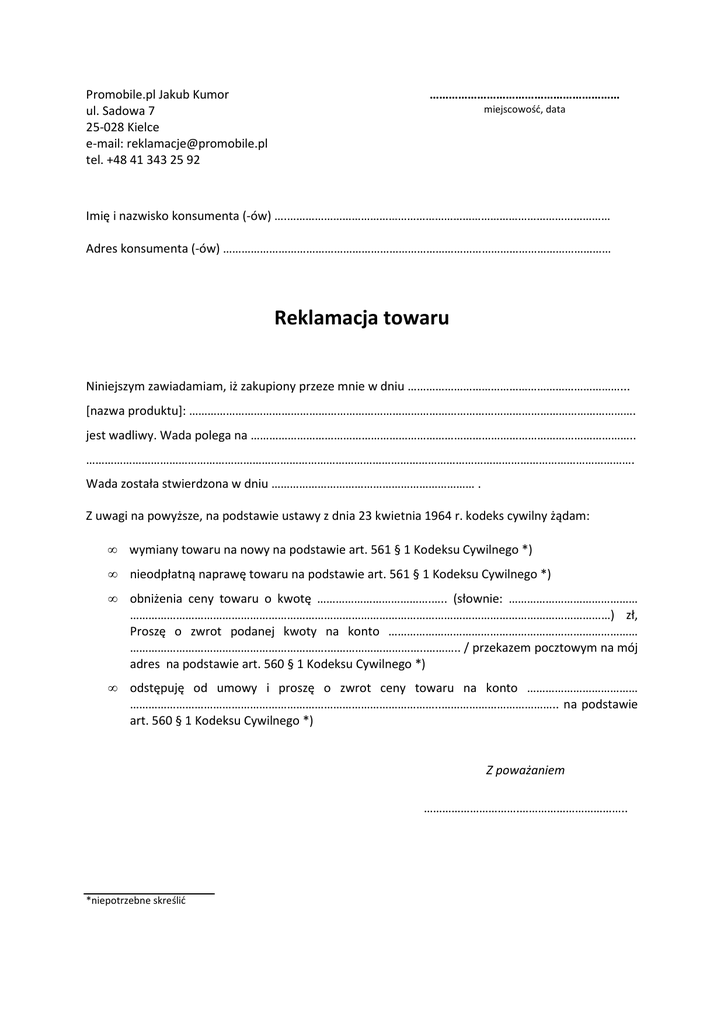 Promobile.pl Jakub Kumor ul. Sadowa 7 25-028 Kielce e-mail: [email protected] tel. +48 41 343 25 92 …………………………………………………… miejscowość, data Imię i nazwisko konsumenta (-ów) ….…………………………………………………………………………………………… Adres konsumenta (-ów) ……………………………………………………………………………………………………………… Reklamacja towaru Niniejszym zawiadamiam, iż zakupiony przeze mnie w dniu ……………………………………………………………... [nazwa produktu]: ………………………………………………………………………………………………………………………………. jest wadliwy. Wada polega na …………………………………………………………………………………………………………….. ……………………………………………………………………………………………………………………………………………………………. Wada została stwierdzona w dniu ………………………………………………………… . Z uwagi na powyższe, na podstawie ustawy z dnia 23 kwietnia 1964 r. kodeks cywilny żądam: • wymiany towaru na nowy na podstawie art. 561 § 1 Kodeksu Cywilnego *) • nieodpłatną naprawę towaru na podstawie art. 561 § 1 Kodeksu Cywilnego *) • obniżenia ceny towaru o kwotę ……………………………….….. (słownie: …………………………………… …………………………………………………………………………………………………………………………………………) zł, Proszę o zwrot podanej kwoty na konto ……………………………………………………………………… ……………………………………………………….…………………………..……….. / przekazem pocztowym na mój adres na podstawie art. 560 § 1 Kodeksu Cywilnego *) • odstępuję od umowy i proszę o zwrot ceny towaru na konto ……………………………… ………………………………………………………………………………………..……………………………….. na podstawie art. 560 § 1 Kodeksu Cywilnego *) Z poważaniem ………………………….…………………………….. *niepotrzebne skreślić