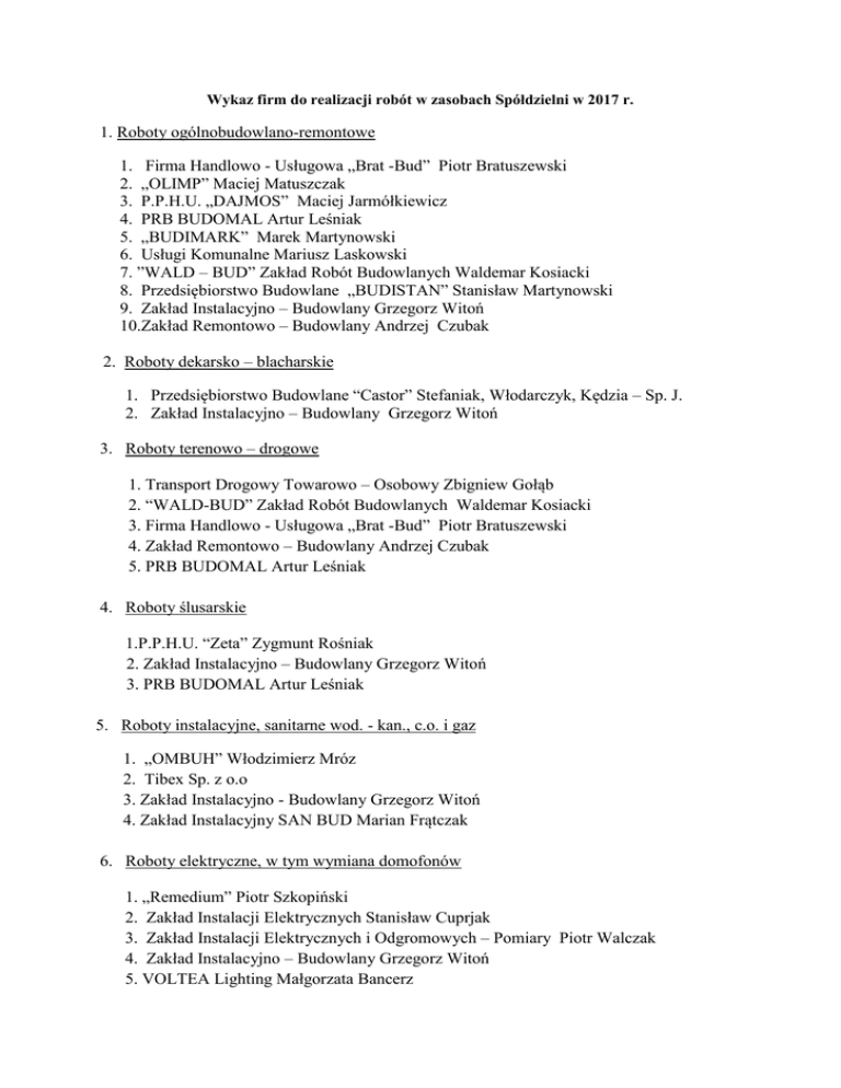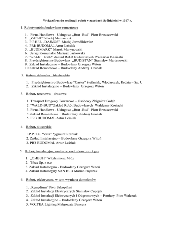 Wykaz firm do realizacji robót w zasobach Spółdzielni w 2017 r. 1. Roboty ogólnobudowlano-remontowe 1. Firma Handlowo - Usługowa „Brat -Bud” Piotr Bratuszewski 2. „OLIMP” Maciej Matuszczak 3. P.P.H.U. „DAJMOS” Maciej Jarmółkiewicz 4. PRB BUDOMAL Artur Leśniak 5. „BUDIMARK” Marek Martynowski 6. Usługi Komunalne Mariusz Laskowski 7. ”WALD – BUD” Zakład Robót Budowlanych Waldemar Kosiacki 8. Przedsiębiorstwo Budowlane „BUDISTAN” Stanisław Martynowski 9. Zakład Instalacyjno – Budowlany Grzegorz Witoń 10.Zakład Remontowo – Budowlany Andrzej Czubak 2. Roboty dekarsko – blacharskie 1. Przedsiębiorstwo Budowlane “Castor” Stefaniak, Włodarczyk, Kędzia – Sp. J. 2. Zakład Instalacyjno – Budowlany Grzegorz Witoń 3. Roboty terenowo – drogowe 1. Transport Drogowy Towarowo – Osobowy Zbigniew Gołąb 2. “WALD-BUD” Zakład Robót Budowlanych Waldemar Kosiacki 3. Firma Handlowo - Usługowa „Brat -Bud” Piotr Bratuszewski 4. Zakład Remontowo – Budowlany Andrzej Czubak 5. PRB BUDOMAL Artur Leśniak 4. Roboty ślusarskie 1.P.P.H.U. “Zeta” Zygmunt Rośniak 2. Zakład Instalacyjno – Budowlany Grzegorz Witoń 3. PRB BUDOMAL Artur Leśniak 5. Roboty instalacyjne, sanitarne wod. - kan., c.o. i gaz 1. „OMBUH” Włodzimierz Mróz 2. Tibex Sp. z o.o 3. Zakład Instalacyjno - Budowlany Grzegorz Witoń 4. Zakład Instalacyjny SAN BUD Marian Frątczak 6. Roboty elektryczne, w tym wymiana domofonów 1. „Remedium” Piotr Szkopiński 2. Zakład Instalacji Elektrycznych Stanisław Cuprjak 3. Zakład Instalacji Elektrycznych i Odgromowych – Pomiary Piotr Walczak 4. Zakład Instalacyjno – Budowlany Grzegorz Witoń 5. VOLTEA Lighting Małgorzata Bancerz B 7. Wykonanie i wymiana okien drewnianych na PCV 1. P.P.H.U. „Petecki” Ignacy Petecki 2. „Studio Okno” sp. z o.o. 8. Wykonanie i wymiana drzwi zewnętrznych i wewnętrznych ASSA ABLOY Mercor Doors Sp. z o.o. 9. Uszczelnienie i malowanie złącz międzypłytowych techniką alpinistyczną ”OLIMP” Maciej Matuszczak 10 . Konserwacja zieleni wysokiej i niskiej (przycinki, wycinki drzew i krzewów, frezowanie pniaków), nasadzenia. 1. KTU – ZIELEŃ sp. z o.o. 2. Usługi Komunalne Mariusz Laskowski 3. Transport Drogowy Towarowo Osobowy Zbigniew Gołąb 4. Zakład Usług Ogrodniczych S & R Pawlak s.c. 11. Usługi dezynsekcji, deratyzacji, dezynfekcji i czyszczenia zsypów. 1. “Be Insekt” Mariola Napieraj Specjalistyczny Zakład Dezynsekcji, Dezynfekcji i Deratyzacji Usługi Porządkowe 2. “Protectum” Krzysztof Wojciechowski 3. WDS Serwis Sebastian Tyślik 12. Udrożnienia instalacji kanalizacji sanitarnej 1. WDS Serwis Sebastian Tyślik 2. Zakład Instalacyjno - Budowlany Grzegorz Witoń 13. Badania termowizyjne P.P.H.U. „DAJMOS” Maciej Jarmółkiewicz