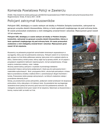Komenda Powiatowa Policji w Zawierciu Źródło: http://zawiercie.slaska.policja.gov.pl/k30/informacje/wiadomosci/72847,Policjant-zatrzymal-klusownikow.html Wygenerowano: Środa, 8 marca 2017, 16:48 Policjant zatrzymał kłusowników Policjant CBŚ, działający w czasie wolnym od służby w Polskim Związku Łowieckim, zatrzymał na gorącym uczynku dwóch kłusowników, którzy w lesie upolowali znajdującego się pod ochroną łosia. W czasie przeszukań znaleziono u nich nielegalny arsenał broni i amunicji. Mężczyznom grozi nawet 10 lat więzienia. Policjant CBŚ, działający w czasie wolnym od służby w Polskim Związku Łowieckim, zatrzymał na gorącym uczynku dwóch kłusowników, którzy w lesie upolowali znajdującego się pod ochroną łosia. W czasie przeszukań znaleziono u nich nielegalny arsenał broni i amunicji. Mężczyznom grozi nawet 10 lat więzienia. Kłusownicy na polowanie przyjechali samochodem terenowym wyposażonym w wyciągarkę, którą użyli do podnoszenia zwierzyny. Policjant zastał ich w momencie, gdy wiszące na linie blisko półtonowe zwierzę, było przez nich w połowie odarte ze skóry. Zawierciańscy stróże prawa, którzy zajęli się tą sprawą ustalili, że ich pojazd z przypiętymi angielskimi tablicami rejestracyjnymi, nie był zarejestrowany. W jego wnętrzu znaleziono siekiery, noże i naboje. Wczoraj zawierciańscy policjanci z wydziału kryminalnego dokładnie przeszukali miejsce zatrzymania podejrzanych. Użyto psa do wykrywania broni i materiałów wybuchowych. Broń, przysypana liśćmi, ukryta była pod jednym z drzew. Była to przerobiona strzelba o kalibrze 8mm z zamontowanym długim tłumikiem i lunetą. Przeszukano także posesje zatrzymanych, na których znaleziono naboje i przerobione elementy broni. Dzisiaj, po przesłuchaniu przez policjantów, podejrzani zostali przekazani do dyspozycji prokuratora, króry zdecyduje o ich dalszym losie. Za posiadanie bez wymaganego zezwolenia broni palnej lub amunicji grozi kara do 8 lat pozbawienia wolności. Za nielegalne wyrabianie broni grozi nawet 10 lat więzienia. Natomiast za kłusownictwo z bronią, można trafić za kratki na 5 lat. Ocena: 0/5 (0) Tweetnij