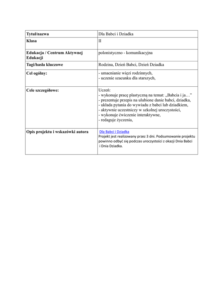 Tytuł/nazwa Dla Babci i Dziadka Klasa II Edukacja / Centrum Aktywnej Edukacji polonistyczno - komunikacyjna Tagi/hasła kluczowe Rodzina, Dzień Babci, Dzień Dziadka Cel ogólny: - umacnianie więzi rodzinnych, - uczenie szacunku dla starszych, Cele szczegółowe: Uczeń: - wykonuje pracę plastyczną na temat: „Babcia i ja…” - prezentuje przepis na ulubione danie babci, dziadka, - układa pytania do wywiadu z babci lub dziadkiem, - aktywnie uczestniczy w szkolnej uroczystości, - wykonuje ćwiczenie interaktywne, - redaguje życzenia, Opis projektu i wskazówki autora Dla Babci i Dziadka Projekt jest realizowany przez 3 dni. Podsumowanie projektu powinno odbyd się podczas uroczystości z okazji Dnia Babci i Dnia Dziadka.