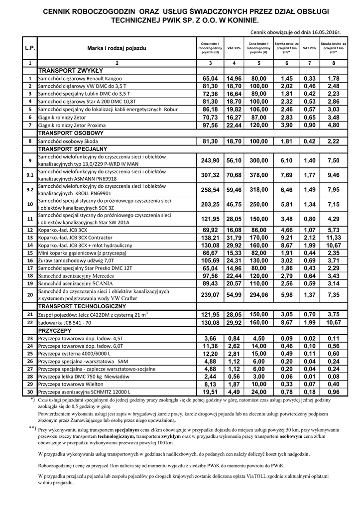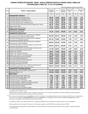 CENNIK ROBOCZOGODZIN ORAZ USŁUG ŚWIADCZONYCH PRZEZ DZIAŁ OBSŁUGI TECHNICZNEJ PWIK SP. Z O.O. W KONINIE. Cennik obowiązuje od dnia 16.05.2016r. L.P. Marka i rodzaj pojazdu Cena netto 1 roboczogodziny pojazdu (zł) VAT 23% Cena brutto 1 roboczogodziny pojazdu (zł) Stawka netto za przejazd 1 km (zł)** VAT 23% Stawka brutto za przejazd 1 km (zł)** 1 2 3 4 5 6 7 8 65,04 81,30 72,36 81,30 86,18 70,73 97,56 14,96 18,70 16,64 18,70 19,82 16,27 22,44 80,00 100,00 89,00 100,00 106,00 87,00 120,00 1,45 2,02 1,81 2,32 2,46 2,83 3,90 0,33 0,46 0,42 0,53 0,57 0,65 0,90 1,78 2,48 2,23 2,86 3,03 3,48 4,80 81,30 18,70 100,00 1,81 0,42 2,22 243,90 56,10 300,00 6,10 1,40 7,50 307,32 70,68 378,00 7,69 1,77 9,46 258,54 59,46 318,00 6,46 1,49 7,95 203,25 46,75 250,00 5,81 1,34 7,15 121,95 28,05 150,00 3,48 0,80 4,29 69,92 138,21 130,08 66,67 105,69 65,04 97,56 89,43 16,08 31,79 29,92 15,33 24,31 14,96 22,44 20,57 86,00 170,00 160,00 82,00 130,00 80,00 120,00 110,00 4,66 9,21 8,67 1,91 3,02 1,86 2,79 2,56 1,07 2,12 1,99 0,44 0,69 0,43 0,64 0,59 5,73 11,33 10,67 2,35 3,71 2,29 3,43 3,14 239,07 54,99 294,06 5,98 1,37 7,35 TRANSPORT ZWYKŁY 1 2 3 4 5 6 7 8 9 9.1 9.2 10 11 12 13 14 15 16 17 18 19 20 Samochód ciężarowy Renault Kangoo Samochód ciężarowy VW DMC do 3,5 T Samochód specjalny Lublin DMC do 3,5 T Samochod ciężarowy Star A 200 DMC 10,8T Samochód specjalny do lokalizacji kabli energetycznych Robur Ciągnik rolniczy Zetor Ciągnik rolniczy Zetor Proxima TRANSPORT OSOBOWY Samochód osobowy Skoda TRANSPORT SPECJALNY Samochód wielofunkcyjny do czyszczenia sieci i obiektów kanalizacyjnych typ 13,0/229 P-WRD IV MAN Samochód wielofunkcyjny do czyszczenia sieci i obiektów kanalizacyjnych ASMANN PN69918 Samochód wielofunkcyjny do czyszczenia sieci i obiektów kanalizacyjnych KROLL PN69901 Samochód specjalistyczny do próżniowego czyszczenia sieci i obiektów kanalizacyjnych SCK 3Z Samochód specjalistyczny do próżniowego czyszczenia sieci i obiektów kanalizacyjnych Star SW 201A Koparko.-ład. JCB 3CX Koparko.-ład. JCB 3CX Contractor Koparko.-ład. JCB 3CX + młot hydrauliczny Mini koparka gąsienicowa (z przyczepą) Żuraw samochodowy udżwig 7,0T Samochód specjalny Star Presko DMC 12T Samochód asenizacyjny Mercedes Samochód asenizacyjny SCANIA Samochód do czyszczenia sieci i obiektów kanalizacyjnych z systemem podgrzewania wody VW Crafter TRANSPORT TECHNOLOGICZNY 21 Zespół pojazdów: Jelcz C422DM z cysterną 21 m3 3,05 0,70 3,75 121,95 28,05 150,00 22 Ładowarka JCB 541 - 70 8,67 1,99 10,67 130,08 29,92 160,00 PRZYCZEPY 23 Przyczepa towarowa dop. ładow. 4,5T 4,50 0,09 0,02 0,11 3,66 0,84 24 Przyczepa towarowa dop. ładow. 6,0T 14,00 0,46 0,10 0,56 11,38 2,62 25 Przyczepa cysterna 4000/6000 L 15,00 0,49 0,11 0,60 12,20 2,81 26 Przyczepa specjalna -warsztatowa SAM 6,00 0,20 0,04 0,24 4,88 1,12 27 Przyczepa specjalna - zaplecze warsztatowo-socjalne 6,00 0,20 0,04 0,24 4,88 1,12 28 Przyczepa lekka DMC 750 kg Niewiadów 3,00 0,06 0,01 0,08 2,44 0,56 29 Przyczepa towarowa Wielton 10,00 0,33 0,07 0,40 8,13 1,87 30 Przyczepa asenizacyjna SCHMITZ 12000 L 24,00 0,78 0,18 0,96 19,51 4,49 *) Czas usługi pojazdami specjalnymi do jednej godziny pracy zaokrągla się do pełnej godziny w górę, natomiast czas usługi powyżej jednej godziny zaokrągla się do 0,5 godziny w górę. Potwierdzeniem wykonania usługi jest zapis w brygadowej karcie pracy, karcie drogowej pojazdu lub na zleceniu usługi potwierdzony podpisem złożonym przez Zamawiającego lub osobę przez niego upoważnioną. **) Przy wykonywaniu usług transportem specjalnym cena zł/km obowiązuje w przypadku dojazdu do miejsca usługi powyżej 50 km, przy wykonywaniu przewozu rzeczy transportem technologicznym, transportem zwykłym oraz w przypadku wykonania pracy transportem osobowym cena zł/km obowiązuje w przypadku wykonywania przewozu powyżej 100 km W przypadku wykonywania usług transportowych w godzinach nadliczbowych, do podanych cen należy doliczyć koszt tych nadgodzin . Roboczogodzinę i cenę za przejazd 1km nalicza się od momentu wyjazdu z siedziby PWiK do momentu powrotu do PWiK. W przypadku przejazdu pojazdu lub zespołu pojazdów po drogach krajowych zostanie doliczona opłata ViaTOLL zgodnie z aktualnymi opłatami w dniu przejazdu. W przypadku przejazdu pojazdu lub zespołu pojazdów po autostradach zostanie doliczona opłata za przejazd zgodnie z aktualnymi opłatami w dniu przejazdu.