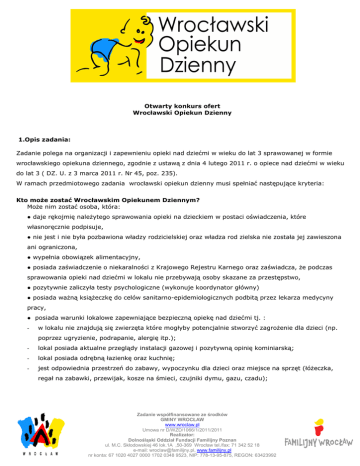 Otwarty konkurs ofert Wrocławski Opiekun Dzienny 1.Opis zadania: Zadanie polega na organizacji i zapewnieniu opieki nad dziećmi w wieku do lat 3 sprawowanej w formie wrocławskiego opiekuna dziennego, zgodnie z ustawą z dnia 4 lutego 2011 r. o opiece nad dziećmi w wieku do lat 3 ( DZ. U. z 3 marca 2011 r. Nr 45, poz. 235). W ramach przedmiotowego zadania wrocławski opiekun dzienny musi spełniać następujące kryteria: Kto moŜe zostać Wrocławskim Opiekunem Dziennym? MoŜe nim zostać osoba, która: ● daje rękojmię naleŜytego sprawowania opieki na dzieckiem w postaci oświadczenia, które własnoręcznie podpisuje, ● nie jest i nie była pozbawiona władzy rodzicielskiej oraz władza rod zielska nie została jej zawieszona ani ograniczona, ● wypełnia obowiązek alimentacyjny, ● posiada zaświadczenie o niekaralności z Krajowego Rejestru Karnego oraz zaświadcza, Ŝe podczas sprawowania opieki nad dziećmi w lokalu nie przebywają osoby skazane za przestępstwo, ● pozytywnie zaliczyła testy psychologiczne (wykonuje koordynator główny) ● posiada waŜną ksiąŜeczkę do celów sanitarno-epidemiologicznych podbitą przez lekarza medycyny pracy, ● posiada warunki lokalowe zapewniające bezpieczną opiekę nad dziećmi tj. : - w lokalu nie znajdują się zwierzęta które mogłyby potencjalnie stworzyć zagroŜenie dla dzieci (np. poprzez ugryzienie, podrapanie, alergię itp.); - lokal posiada aktualne przeglądy instalacji gazowej i pozytywną opinię kominiarską; - lokal posiada odrębną łazienkę oraz kuchnię; - jest odpowiednia przestrzeń do zabawy, wypoczynku dla dzieci oraz miejsce na sprzęt (łóŜeczka, regał na zabawki, przewijak, kosze na śmieci, czujniki dymu, gazu, czadu); Zadanie współfinansowane ze środków GMINY WROCŁAW www.wroclaw.pl Umowa nr D/WZD/1066/1/2011/2011 Realizator: Dolnośląski Oddział Fundacji Familijny Poznan ul. M.C. Skłodowskiej 46 lok.1A ,50-369 Wrocław tel./fax: 71 342 52 18 e-mail: [email protected], www.familijny.pl nr konta: 67 1020 4027 0000 1702 0348 9523, NIP: 778-13-95-875, REGON: 63423992 UWAGA : Opiekun musi posiadać tytuł prawny do lokalu, w którym będzie sprawował opiekę np. : akt własności, umowa najmu, umowa uŜyczenia itp. W jednym lokalu moŜe sprawować opiekę kilku opiekunów. ● w przypadku sprawowania opieki nad więcej niŜ 3 dzieci w wieku od 1 roku, opiekun musi posiadać pomoc w postaci drugiej osoby – wolontariusza; ● zaliczenie 160 godzinnego lub 40 godzinnego szkolenia uzupełniające dla osób , które posiadają kwalifikacje : pielęgniarki, połoŜnej, opiekunki dziecięcej, nauczyciela edukacji przedszkolnej lub pedagoga opiekuńczo-wychowawczego) UWAGA : Ze szkolenia zwolnione są osoby, które pracowały z dziećmi w wieku do lat 3 przez okres przynajmniej 12 miesięcy bezpośrednio przed podjęciem pracy jako Wrocławski Opiekun Dzienny (okres zatrudnienia musi być potwierdzony świadectwem pracy lub w przypadku umowy wolontariackiej – umową i oświadczeniem od pracodawcy). 2. Termin rekrutacji Wrocławskich Opiekunów Dziennych: Od 26.10.2011 do 18.11.2011 3. W ramach umowy Wrocławski Opiekun Dzienny ma zagwarantowane: 1. umowę zlecenie, 2. praca przez 11 miesięcy w roku – lipiec lub sierpień miesiącem wolnym od pracy, 3. ubezpieczenie OC, 4. 4 zł brutto za godzinę za 1 dziecko, UWAGA : Maksymalnie dziećmi moŜna opiekować się 10 godzin dziennie, wynagrodzenie jest wypłacane na podstawie listy obecności dziecka u dziennego opiekuna podpisywanej przez rodzica, 5. szkolenia uzupełniające, 6. wyposaŜenie w podstawowy sprzęt pielęgnacyjno – edukacyjny (łóŜeczka turystyczne, regał na pomoce dydaktyczne, przewijak, mata do zabawy, kosz na pieluchy, apteczkę, gaśnicę itp.) 7. pomoc w rekrutacji dzieci tj. : działania informacyjno – promocyjne : internet, media, tablice ogłoszeń; 8. wsparcie techniczne, metodyczne oraz organizacyjne. UWAGA : Wrocławski Opiekun Dzienny jest osobą publiczną – imię i nazwisko opiekuna będzie zamieszczone na stronie BIP; Zadanie współfinansowane ze środków GMINY WROCŁAW www.wroclaw.pl Umowa nr D/WZD/1066/1/2011/2011 Realizator: Dolnośląski Oddział Fundacji Familijny Poznan ul. M.C. Skłodowskiej 46 lok.1A ,50-369 Wrocław tel./fax: 71 342 52 18 e-mail: [email protected], www.familijny.pl nr konta: 67 1020 4027 0000 1702 0348 9523, NIP: 778-13-95-875, REGON: 63423992 Zakres obowiązków dziennych opiekunów: 1. Zapewnienie dziecku opieki w warunkach bytowych zbliŜonych do warunków domowych 2. Zagwarantowanie dziecku właściwej opieki pielęgnacyjnej, wychowawczej oraz edukacyjnej, z uwzględnieniem indywidualnych potrzeb dziecka 3. Prowadzenie zajęć opiekuńczo- wychowawczych i edukacyjnych, uwzględniając rozwój psychomotoryczny, emocjonalny i społeczny dziecka, właściwych do wieku dziecka 4. Zapewnienie dzieciom odpowiednich warunków do zabawy oraz do odpoczynku 5. Zapewnienie całodziennej opieki, do 10 godzin/ dzień Gdzie się zgłosić?: 1. Formularz zgłoszenia naleŜy pobrać ze strony internetowej www.familijny.pl lub ze strony BIP-u ( tutaj do pobrania ) i odesłać go na adres: [email protected] wraz z CV i listem motywacyjnym lub 2. Zgłosić się do biura projektu pod adresem: ul. M.C. Skłodowskiej 46/1a we Wrocławiu , po wcześniejszym kontakcie telefonicznym Więcej informacji: Koordynator główny zadania: Pani Aldona Muszyńska 501 670 108 Specjaliści ds. organizacji prac dziennych opiekunów: Pani Katarzyna Paikert 501 981 316 Pan Samuel Nowak 501 981 308 Godziny pracy biura: 08:00-16:00 WIĘCEJ INFORMACJI NA STRONIE INTERNETOWEJ: www.familijny.pl Zadanie współfinansowane ze środków GMINY WROCŁAW www.wroclaw.pl Umowa nr D/WZD/1066/1/2011/2011 Realizator: Dolnośląski Oddział Fundacji Familijny Poznan ul. M.C. Skłodowskiej 46 lok.1A ,50-369 Wrocław tel./fax: 71 342 52 18 e-mail: [email protected], www.familijny.pl nr konta: 67 1020 4027 0000 1702 0348 9523