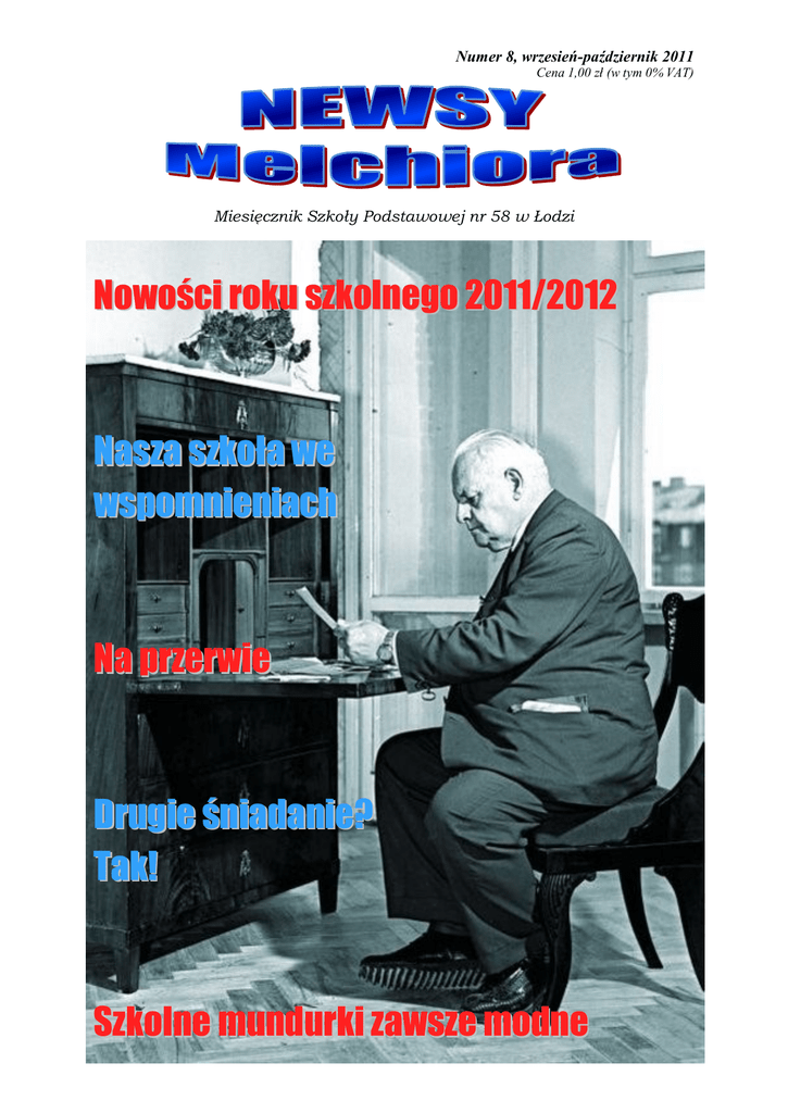 Numer 8, wrzesień-październik 2011 Cena 1,00 zł (w tym 0% VAT) Miesięcznik Szkoły Podstawowej nr 58 w Łodzi Nowości roku szkolnego 2011/2012 Nasza szkoła we wspomnieniach Na przerwie Drugie śniadanie? Ta k ! Szkolne mundurki zawsze modne Artykuły miesiąca …………….……….............. 2 Rozmowy miesiąca …………………………...... 8 Zwierzę miesiąca ........................................... 12 Moda ............................................................... 13 Sport ............................................................... 15 Nasz przewodnik turystyczny ...................... 17 Muzyka ........................................................... 18 Gwiazda miesiąca ……………………..…… 20 Filmy ........................................................... 22 Książka miesiąca ………………...………… 23 Ogłoszenia …………….........………………. 24 Dowcipy ...................................................... 24 Rozrywka .................................................... 25 W następnym numerze …………..……...... 25 Drodzy Czytelnicy! Od rozpoczęcia roku szkolnego minął już ponad miesiąc, ale ponieważ jest to pierwszy numer w roku 2011/2012, wszystkim uczniom naszej szkoły składamy życzenia wielu sukcesów w nauce, rozwoju własnych umiejętności i zdolności oraz jak najlepszych relacji z rówieśnikami i nauczycielami. A nauczycielom i pozostałym pracownikom szkoły z okazji zbliżającego się Dnia Edukacji Narodowej redakcja „Newsów Melchiora” życzy duuużo radości z wykonywanej pracy, sukcesów zawodowych i samych wzorowych uczniów! Redakcja Redaktor naczelny Nasz nowy e-mail: Alicja Bończak [email protected] Zastępca redaktora naczelnego Kinga Federowicz Zespół redakcyjny: Maja Czarnecka, Janek Kowalski, Ania Zeler, Małgosia Szaciłowska, Weronika Możdżeń, Sandra Sammo, Agnieszka Olejnik, Julia Orłowska, Wiktoria Maciejewska Współpracują: Patryk Wiktorski, Robert Estkowski, Natalia Marat, Klaudia Gross Opieka P. Donata Michałus 1 NEWSY Melchiora, wrzesień-październik 2011 r. We wrześniowym numerze wiele miejsca w Newsach Melchiora poświecimy naszej szkole, ponieważ obchodzi ona w tym roku 50-lecie istnienia, a także patronowi szkoły i szkolnej gazetki – Melchiorowi Wańkowiczowi. Jednak na początek wspomnienia z wakacji… Moja Chorwacja Skaliste wysepki z czerwonymi dachami domów, krystalicznieczysty i ciepły Adriatyk, góry schodzące do turkusowego morza, wspaniała kuchnia, różnorodnośd, gościnnośd i wiele innych atrakcji przyciąga coraz więcej turystów do Chorwacji. Tutejsze wybrzeże uznawane jest za najpiękniejsze w Europie. Chorwacja to jeden z najcieplejszych i najbardziej słonecznych krajów Europy. Wzdłuż linii brzegowej znajduje się 1185 malowniczych wysepek. Największe, takie jak Brad, Hvar, Kordula, Pag czy Krk, cieszą się co roku dużą popularnością wśród turystów. Prawie nigdzie nie znajdziecie morza, tak czystego jak chorwackie. Chorwacja to miejsce oszałamiających darów natury, niezatłoczone plaże, najczęściej kamieniste oraz błękitne i ciepłe morze, zachwycające krystalicznie czystą wodą. Urocze zatoki, przylądki i wyspy stwarzają warunki do rozkosznych kąpieli, zaś urodę wybrzeża, wysp i zatoczek podkreśla bujna roślinnośd śródziemnomorska. Iglaste i bukowe lasy żyją w symbiozie z gajami oliwnymi i winnicami, a migdałowce i figowce, pinie, drzewa cyprysowe i palmy nadają wybrzeżu niepowtarzalny charakter. 2 NEWSY Melchiora, wrzesień-październik 2011 r. Wspaniałe zabytki zapewniły Chorwacji miejsce w kulturze europejskiej. Nie sposób wyliczyd wszystkiego, co na to zasługuje. Miasto–pomnik Dubrownik, Split z Pałacem Dioklecjana, Bazylikę Eufrazego w Poredu, średniowiecznie centrum Trogiru, budynek teatru w Hvarze. To t r z e b a z o b a c z y d ! Przygotowała: Maja Czarnecka Nowości roku szkolnego 2011/12 W tym roku szkolnym odeszła od nas ukochana wicedyrektor, Pani Krystyna Kawczyńska, a na jej miejsce Pani Dyrektor Elżbieta Dyl wyznaczyła dotychczasowego pedagoga szkoły Panią Beatę Rutkowską. Nowym pedagogiem natomiast została Pani Aleksandra Zawada. W szkole pojawił się także nowy, choć znany nauczyciel wychowania fizycznego – Pani Magdalena Ryznar, a w świetlicy szkolnej pracować będzie Pani Karina Mosbah. Wszystkim nauczycielom rozpoczynającym pracę na nowych stanowiskach redakcja Newsów Melchiora życzy samych sukcesów, wiele satysfakcji i spełnienia zawodowego. Szkoła w liczbach A oto kilka danych statystycznych dotyczących naszej szkoły w roku szkolnym 2011/2012: 300 – łączna liczba uczniów naszej szkoły, 139 – dziewczynek, 161 – chłopców, 148 – dzieci uczących się w klasach I-III, 152 – młodzieży uczęszczającej do klas IV-VI. Nauczyciele DYREKTOR SZKOŁY: Elżbieta Dyl WICEDYREKTOR SZKOŁY: Beata Rutkowska 3 NEWSY Melchiora, wrzesień-październik 2011 r. EDUKACJA WCZESNOSZKOLNA: Małgorzata Misiarczyk, Lidia Gula, Anna Hasińska, Emilia Janusik, Mirosława Bariasz, Izabela Pańczyk JĘZYK POLSKI: Maryla Kałach, Donata Michałus HISTORIA: Donata Michałus, Joanna Sojecka JĘZYK ANGIELSKI: Agnieszka Koźba, Joanna Sojecka MATEMATYKA: Elżbieta Dyl, Alicja Brzozowska, Gabriela Choińska PRZYRODA: Ewa Studnicka MUZYKA, PLASTYKA: Anna Sztekmiler TECHNIKA: Gabriela Choińska INFORMATYKA: Danuta Kowalewska RELIGIA: Helena Surma, Mirosław Milczarek WYCHOWANIE DO ŻYCIA W RODZINIE: Izabela Pańczyk WYCHOWANIE FIZYCZNE: Magdalena Ryznar, Radosław Kamiński PEDAGOG: Aleksandra Zawada NAUCZYCIEL BIBLIOTEKARZ: Zdzisława Omelczuk ŚWIETLICA SZKOLNA: Karina Mosbah Pozostali pracownicy szkoły PANI SEKRETARKA: Marzena Wójcicka PANI REFERENT: Ramona Kołodziejczyk PANIE KUCHARKI: Bożena Sikora, Małgorzata Kirchof PANOWIE KONSERWATORZY: Dariusz Sikora, Tomasz Budrych PANIE WOŹNE: Bogumiła Gaszewska, Halina Włodarczyk, J