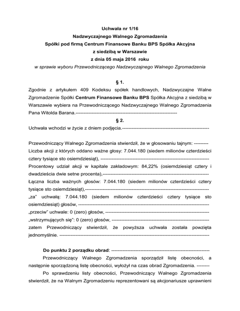 Uchwała nr 1/16 Nadzwyczajnego Walnego Zgromadzenia Spółki pod firmą Centrum Finansowe Banku BPS Spółka Akcyjna z siedzibą w Warszawie z dnia 05 maja 2016 roku w sprawie wyboru Przewodniczącego Nadzwyczajnego Walnego Zgromadzenia § 1. Zgodnie z artykułem 409 Kodeksu spółek handlowych, Nadzwyczajne Walne Zgromadzenie Spółki Centrum Finansowe Banku BPS Spółka Akcyjna z siedzibą w Warszawie wybiera na Przewodniczącego Nadzwyczajnego Walnego Zgromadzenia Pana Witolda Barana.--------------------------------------------------------------§ 2. Uchwała wchodzi w życie z dniem podjęcia.------------------------------------------------------ Przewodniczący Walnego Zgromadzenia stwierdził, że w głosowaniu tajnym: --------Liczba akcji z których oddano ważne głosy: 7.044.180 (siedem milionów czterdzieści cztery tysiące sto osiemdziesiąt), -------------------------------------------------------------------Procentowy udział akcji w kapitale zakładowym: 84,22% (osiemdziesiąt cztery i dwadzieścia dwie setne procenta),-----------------------------------------------------------------Łączna liczba ważnych głosów: 7.044.180 (siedem milionów czterdzieści cztery tysiące sto osiemdziesiąt),----------------------------------------------------------------------------„za” uchwałą: 7.044.180 (siedem milionów czterdzieści cztery tysiące sto osiemdziesiąt) głosów, ---------------------------------------------------------------------------------„przeciw” uchwale: 0 (zero) głosów, ----------------------------------------------------------------„wstrzymujących się”: 0 (zero) głosów, ------------------------------------------------------------zatem Przewodniczący stwierdził, że powyższa uchwała została powzięta jednomyślnie. --------------------------------------------------------------------------------------------- Do punktu 2 porządku obrad: ------------------------------------------------------------Przewodniczący Walnego Zgromadzenia sporządził listę obecności, a następnie sporządzoną listę obecności, wyłożył na czas obrad Zgromadzenia. -------Po sprawdzeniu listy obecności, Przewodniczący Walnego Zgromadzenia stwierdził, że na Walnym Zgromadzeniu reprezentowani są akcjonariusze uprawnieni łącznie z 7.044.180 (siedem milionów czterdzieści cztery tysiące sto osiemdziesiąt) akcji dających łącznie 7.044.180 (siedem milionów czterdzieści cztery tysiące sto osiemdziesiąt) głosów, co potwierdza załączona do niniejszego aktu notarialnego lista obecności.-------------------------------------------------------------------------Wobec powyższego Przewodniczący Walnego Zgromadzenia stwierdził, że Nadzwyczajne Walne Zgromadzenie jest zdolne do powzięcia uchwał. ------------------ Do punktu 4 porządku obrad: ------------------------------------------------------------ Uchwała nr 2/16 Nadzwyczajnego Walnego Zgromadzenia Spółki pod firmą Centrum Finansowe Banku BPS Spółka Akcyjna z siedzibą w Warszawie z dnia 05 maja 2016 roku w sprawie wyboru Komisji Skrutacyjnej § 1. Nadzwyczajne Walne Zgromadzenie powołuje Komisję Skrutacyjną w następującym składzie: ---------------------------------------------------------------------------------------------------1. Aneta Korzeniecka,----------------------------------------------------------------------------------2. Miłosz Borowiecki.-----------------------------------------------------------------------------------§ 2. Uchwała wchodzi w życie z dniem podjęcia.------------------------------------------------------ Przewodniczący Walnego Zgromadzenia stwierdził, że w głosowaniu tajnym: --------Liczba akcji z których oddano ważne głosy: 7.044.180 (siedem milionów czterdzieści cztery tysiące sto osiemdziesiąt), -------------------------------------------------------------------Procentowy udział akcji w kapitale zakładowym: 84,22% (osiemdziesiąt cztery i dwadzieścia dwie setne procenta),-----------------------------------------------------------------Łączna liczba ważnych głosów: 7.044.180 (siedem milionów czterdzieści cztery tysiące sto osiemdziesiąt),----------------------------------------------------------------------------„za” uchwałą: 7.044.180 (siedem milionów czterdzieści cztery tysiące sto osiemdziesiąt) głosów, ---------------------------------------------------------------------------------„przeciw” uchwale: 0 (zero) głosów, ----------------------------------------------------------------- „wstrzymujących się”: 0 (zero) głosów, ------------------------------------------------------------zatem Przewodniczący stwierdził, że powyższa uchwała została powzięta jednomyślnie. --------------------------------------------------------------------------------------------- Do punktu 5 porządku obrad: ------------------------------------------------------------ Uchwała nr 3/16 Nadzwyczajnego Walnego Zgromadzenia Spółki pod firmą Centrum Finansowe Banku BPS Spółka Akcyjna z siedzibą w Warszawie z dnia 05 maja 2016 roku w sprawie przyjęcia porządku obrad § 1. Nadzwyczajne Walne Zgromadzenie postanawia przyjąć porządek obrad ogłoszony na stronie internetowej Spółki i opublikowany raportem bieżącym EBI nr 7/2016 w dniu 06 kwietnia 2016 roku.---------------------------------------------------------------------------§ 2. Uchwała wchodzi w życie z dniem podjęcia.----------------------------------------------- Przewodniczący Walnego Zgromadzenia stwierdził, że w głosowaniu jawnym: -------Liczba akcji z których oddano ważne głosy: 7.044.180 (siedem milionów czterdzieści cztery tysiące sto osiemdziesiąt), -------------------------------------------------------------------Procentowy udział akcji w kapitale zakładowym: 84,22% (osiemdziesiąt cztery i dwadzieścia dwie setne procenta),-----------------------------------------------------------------Łączna liczba ważnych głosów