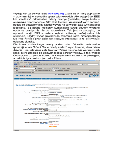 Wydaje się, że serwer IEEE www.ieee.org działa już w miarę poprawnie – przynajmniej w przypadku spraw członkowskich. Aby wstąpić do IEEE lub przedłużyć członkostwo należy założyć (posiadać) swoje konto – username pisany obecnie WIELKIMI literami i password warto zapisać, będzie on potrzebny przy każdej wizycie na serwerze IEEE wymagającej logowania. Są pewne momenty wymagające uwagi bowiem wybrane opcje są praktycznie nie do poprawienia. Tak jest na początku, po wybraniu opcji JOIN – należy wybrać aplikację profesjonalną lub studencką. Błędny wybór prowadzi do założenia konta profesjonalnego lub studenckiego (inny zbiór koniecznych informacji), a to determinuje opłacaną składkę. Dla konta studenckiego należy podać m.in. Education Information (poniżej), a tam School Name należy znaleźć wyszukiwarką, która działa dziwnie – na ustawione pole Country=Poland nie znajduje warszawskich szkół, które znajduje po ustawieniu pola School=Warsaw, a tam w polu Country jest oczywiście Poland. W danych szkół też jest totalny bałagan, a na liście tych polskich jest coś z Pilzna. W przypadku aplikacji profesjonalnej też podaje się informacje o wykształceniu. Aby uniknąć zaszeregowania do Afiliate Members należy wybierać opcję programu akredytowanego. Wszelkie poprawki danych można również wprowadzać wybierając zakładkę My Account. Korzystnie jest wypełniać pole Recruiting IEEE Member’s Name & Number – wiąże się to z premią w składce dla tego członka na następny rok. Jeżeli ktoś nie ma kogo wpisać w to pole – proszę wykorzystać dane skarbnika – będzie to premia dla Polskiej Sekcji. Po zakończeniu zakładania konta w przypadku członka-studenta pojawi się poniższy ekran: a w przypadku członka-profesjonalisty poniższy: Jak widać składka podstawowa dla studenta to 25$, a dla profesjonalisty 142$ w roku 2009. Należy teraz nacisnąć klawisz View Cart / Proceed to Checkout. W przypadku studenta pojawia się ekran: Na dole z lewej strony jest możliwość dodawania Societies i czasopism, czy też dokonania darowizny na rzecz IEEE. Można zarówno dodawać jak i usuwać elementy z koszyka. Po zakończeniu ustalania subskrypcji należy nacisnąć Checkout. W przypadku profesjonalisty pojawia się ekran: Na dole z lewej strony jest możliwość dodawania do subskrypcji Societies i czasopism, czy też dokonania darowizny na rzecz IEEE. Można zarówno dodawać jak i usuwać elementy z koszyka. Można wystąpić o zniżkę dla bezrobotnych, emerytowanych lub o niskich dochodach. UWAGA: z wybranej zniżki nie sposób już się wycofać. Można też uzyskać zniżkę za przynależność do innych organizacji – SEP nie działa. Po zakończeniu ustalania subskrypcji należy nacisnąć Checkout. Po naciśnięciu Checkout jest możliwość zapłacenia kartą online lub wydrukowania faktury. Płacący za pośrednictwem PS IEEE powinni przejść do wydrukowania faktury, i taką jak poniżej, najlepiej w postaci PDF dostarczać do skarbnika. W przypadku realizowania opłat grupowo, szczególnie w przypadku nowych członków studenckich bardzo pomocna jest tabelka (Word, Excell) jak niżej, w postaci elektronicznej. 80616161 KLIN Bartlomiej 25,00 80616467 NITSCHE Marek 25,00 80614675 WAJNERT Dawid 25,00 Przypominam, że dla nowych członków działających Student Branches Polska Sekcja funduje połowę dwóch pierwszych składek podstawowych (12.5$ w roku 2009). . Aby skorzystać z tej możliwości trzeba opłacić kwotę składki pomniejszoną o 12.50$ za pośrednictwem PS IEEE. W przypadku pytań i wątpliwości proszę kontaktować się ze skarbnikiem: Andrzej Miękina (Andrzej Miekina, IEEE Member # 40353224) Instytut Radioelektroniki Gmach Elektroniki PW, p.439 ul.Nowowiejska 15/19 00-665 Warszawa tel. (22) 234-7346 [email protected]