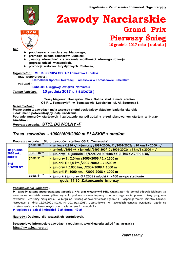 Regulamin - Zaproszenie- Komunikat Organizacyjny Zawody Narciarskie Grand Prix Pierwszy Śnieg 10 grudnia 2017 roku ( sobota ) 1999 Cel : ► popularyzacja narciarstwa biegowego, ► promocja miasta Tomaszów Lubelski, ► ,,walory zdrowotne’’ - stworzenie możliwości zdrowego rozwoju poprzez udział w zawodach, ► promocja walorów turystycznych Roztocza, Organizator : MULKS GRUPA OSCAR Tomaszów Lubelski przy współpracy z : Ośrodkiem Sportu i Rekreacji Tomasovia w Tomaszowie Lubelskim patronat : Lubelski Okręgowy Związek Narciarski Termin i miejsce: 10 grudnia 2017 r. ( sobota ) Trasy biegowe: Uroczyska Siwa Dolina start i meta stadion OSiR ,, Tomasovia’’ w Tomaszowie Lubelskim ul. Al. Sportowa 8 Uczestnictwo : Prawo startu w zawodach mają wszyscy chętni posiadający aktualne badania lekarskie i dokument potwierdzający datę urodzenia. Pobranie numerów startowych i zgłoszenie na pół godziny przed planowanym startem w biurze zawodów . Program zawodów: STYL DOWOLNY -F Trasa zawodów - 1000/1500/2000 m PŁASKIE + stadion Program zawodów: Biuro zawodów stadion OSiR ,,Tomasovia” 00 godz. 10 - seniorzy /1996 +/ + juniorzy /1997-2000/, C /2001-2002/ : 10 km/5 x 2000 m/ 10 grudnia 2016 roku sobota - seniorki /1996 +/ + juniorki /1997-200/ ,C /2001-2002/ : 4 km/2 x 2000 m / godz. 10 40 godz. 11 00 godz. 11 15 Styl DOWOLNY - juniorzy D, juniorki D /rocz. 2003-2004 / : 3,0 km / 2 x 1 500 m/ juniorzy E : 2,0 km /2005/2006 / 1 x 1500 m juniorki E : 2,0 km /2005-2006/ 1 x 1500 m juniorzy F :1000 km, /2007-2008 / 1000 m juniorki F : 1000 km, /2007-2008 / 1000 m juniorki i juniorzy G / 2009 i młodsi / - 400 m – po stadionie godz. 11.30 Zakończenie imprezy Postanowienia końcowe : ► zawody zostaną przeprowadzone zgodnie z NRS oraz wytycznymi PZN. Organizator nie ponosi odpowiedzialności za ewentualne zaistniałe nieszczęśliwe wypadki podczas trwania imprezy oraz zastrzega sobie prawo zmiany programu zawodów. Uczestnicy biorą udział w biegu na własną odpowiedzialność zgodnie z Rozporządzeniem Ministra Edukacji Narodowej z dnia 12.09.2001 (Dz.U. Nr 101 poz.1095). Uczestnictwo w zawodach oznacza wyrażenie zgody na przetwarzanie danych osobowych oraz użycie wizerunku zawodnika. ► wpisowe : dzieci i młodzież 3 zł, dorośli 10 zł Nagrody : Dyplomy dla wszystkich startujących. Szczegółowe informacje o zawodach / regulamin, wyniki-galeria zdjęć / na stronach : http://www.lozn.org.pl Zapraszamy