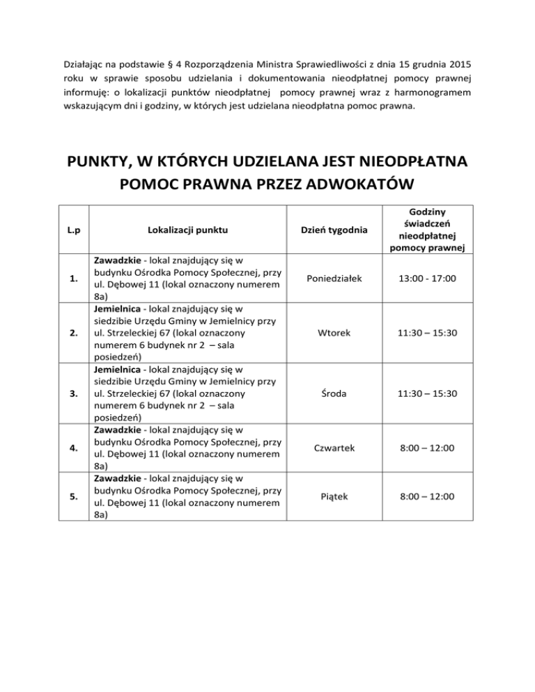 Działając na podstawie § 4 Rozporządzenia Ministra Sprawiedliwości z dnia 15 grudnia 2015 roku w sprawie sposobu udzielania i dokumentowania nieodpłatnej pomocy prawnej informuję: o lokalizacji punktów nieodpłatnej pomocy prawnej wraz z harmonogramem wskazującym dni i godziny, w których jest udzielana nieodpłatna pomoc prawna. PUNKTY, W KTÓRYCH UDZIELANA JEST NIEODPŁATNA POMOC PRAWNA PRZEZ ADWOKATÓW L.p 1. 2. 3. 4. 5. Lokalizacji punktu Zawadzkie - lokal znajdujący się w budynku Ośrodka Pomocy Społecznej, przy ul. Dębowej 11 (lokal oznaczony numerem 8a) Jemielnica - lokal znajdujący się w siedzibie Urzędu Gminy w Jemielnicy przy ul. Strzeleckiej 67 (lokal oznaczony numerem 6 budynek nr 2 – sala posiedzeń) Jemielnica - lokal znajdujący się w siedzibie Urzędu Gminy w Jemielnicy przy ul. Strzeleckiej 67 (lokal oznaczony numerem 6 budynek nr 2 – sala posiedzeń) Zawadzkie - lokal znajdujący się w budynku Ośrodka Pomocy Społecznej, przy ul. Dębowej 11 (lokal oznaczony numerem 8a) Zawadzkie - lokal znajdujący się w budynku Ośrodka Pomocy Społecznej, przy ul. Dębowej 11 (lokal oznaczony numerem 8a) Dzień tygodnia Godziny świadczeń nieodpłatnej pomocy prawnej Poniedziałek 13:00 - 17:00 Wtorek 11:30 – 15:30 Środa 11:30 – 15:30 Czwartek 8:00 – 12:00 Piątek 8:00 – 12:00 PUNKTY, W KTÓRYCH UDZIELANA JEST NIEODPŁATNA POMOC PRAWNA PRZEZ RADCÓW PRAWNYCH L.p 1. 2. 3. 4. 5. Lokalizacji punktu Strzelce Opolskie- budynek Starostwa Powiatowego w Strzelcach Opolskich, ul. Jordanowska 2 – pokój nr 7 parter Strzelce Opolskie- budynek Starostwa Powiatowego w Strzelcach Opolskich, ul. Jordanowska 2 – pokój nr 7 parter Strzelce Opolskie- budynek Starostwa Powiatowego w Strzelcach Opolskich, ul. Jordanowska 2 – pokój nr 7 parter Strzelce Opolskie- budynek Starostwa Powiatowego w Strzelcach Opolskich, ul. Jordanowska 2 – pokój nr 7 parter Strzelce Opolskie- budynek Starostwa Powiatowego w Strzelcach Opolskich, ul. Jordanowska 2 – pokój nr 7 parter Dzień tygodnia Godziny świadczeń nieodpłatnej pomocy prawnej Poniedziałek 9:00 – 13:00 14:00 – 18:00 Wtorek 9:00 – 13:00 Środa --------- Czwartek 14:00 – 18:00 Piątek 14:00 – 18:00