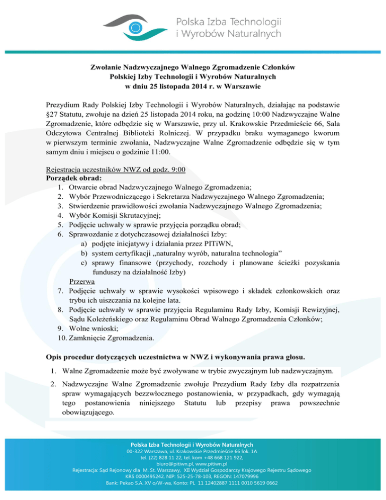 Zwołanie Nadzwyczajnego Walnego Zgromadzenie Członków Polskiej Izby Technologii i Wyrobów Naturalnych w dniu 25 listopada 2014 r. w Warszawie Prezydium Rady Polskiej Izby Technologii i Wyrobów Naturalnych, działając na podstawie §27 Statutu, zwołuje na dzień 25 listopada 2014 roku, na godzinę 10:00 Nadzwyczajne Walne Zgromadzenie, które odbędzie się w Warszawie, przy ul. Krakowskie Przedmieście 66, Sala Odczytowa Centralnej Biblioteki Rolniczej. W przypadku braku wymaganego kworum w pierwszym terminie zwołania, Nadzwyczajne Walne Zgromadzenie odbędzie się w tym samym dniu i miejscu o godzinie 11:00. Rejestracja uczestników NWZ od godz. 9:00 Porządek obrad: 1. Otwarcie obrad Nadzwyczajnego Walnego Zgromadzenia; 2. Wybór Przewodniczącego i Sekretarza Nadzwyczajnego Walnego Zgromadzenia; 3. Stwierdzenie prawidłowości zwołania Nadzwyczajnego Walnego Zgromadzenia; 4. Wybór Komisji Skrutacyjnej; 5. Podjęcie uchwały w sprawie przyjęcia porządku obrad; 6. Sprawozdanie z dotychczasowej działalności Izby: a) podjęte inicjatywy i działania przez PITiWN, b) system certyfikacji „naturalny wyrób, naturalna technologia” c) sprawy finansowe (przychody, rozchody i planowane ścieżki pozyskania funduszy na działalność Izby) Przerwa 7. Podjęcie uchwały w sprawie wysokości wpisowego i składek członkowskich oraz trybu ich uiszczania na kolejne lata. 8. Podjęcie uchwały w sprawie przyjęcia Regulaminu Rady Izby, Komisji Rewizyjnej, Sądu Koleżeńskiego oraz Regulaminu Obrad Walnego Zgromadzenia Członków; 9. Wolne wnioski; 10. Zamknięcie Zgromadzenia. Opis procedur dotyczących uczestnictwa w NWZ i wykonywania prawa głosu. 1. Walne Zgromadzenie może być zwoływane w trybie zwyczajnym lub nadzwyczajnym. 2. Nadzwyczajne Walne Zgromadzenie zwołuje Prezydium Rady Izby dla rozpatrzenia spraw wymagających bezzwłocznego postanowienia, w przypadkach, gdy wymagają tego postanowienia niniejszego Statutu lub przepisy prawa powszechnie obowiązującego. Polska Izba Technologii i Wyrobów Naturalnych 00-322 Warszawa, ul. Krakowskie Przedmieście 66 lok. 1A tel. (22) 828 11 22, tel. kom +48 668 121 922, [email protected], www.pitiwn.pl Rejestracja: Sąd Rejonowy dla M. St. Warszawy, XII Wydział Gospodarczy Krajowego Rejestru Sądowego KRS 0000495242, NIP: 525-25-78-103, REGON: 147079996 Bank: Pekao S.A. XV o/W-wa, Konto: PL 11 12402887 1111 0010 5619 0662 3. Nadzwyczajne Walne Zgromadzenie zwołuje Prezydium Rady Izby z własnej inicjatywy, na wniosek Komisji Rewizyjnej, Rady Izby lub co najmniej 1/3 (jednej trzeciej) liczby członków zwyczajnych Izby, zgłoszony na piśmie z podaniem celów zwołania Nadzwyczajnego Walnego Zgromadzenia. Jeżeli Prezydium Rady Izby nie zwoła Nadzwyczajnego Walnego Zgromadzenia w terminie 30 dni roboczych od dnia zgłoszenia odpowiedniego wniosku, Nadzwyczajne Walne Zgromadzenie zwołuje Komisja Rewizyjna. 4. Na Walne Zgromadzenie mogą być zaproszone także osoby trzecie, w szczególności doradcy i eksperci. Osobom takim przysługuje jedynie głos doradczy. 5. Jeżeli ustawa, niniejszy Statut lub Regulamin Walnego Zgromadzenia nie stanowią inaczej, członkowie Izby mogą uczestniczyć w Walnym Zgromadzeniu oraz wykonywać prawo głosu przez pełnomocników. 6. Pełnomocnictwo powinno być udzielone na piśmie pod rygorem nieważności, złożone w oryginale najpóźniej w dniu obrad Walnego Zgromadzenia i dołączone do księgi protokołów. Pełnomocnikiem nie może być osoba delegowana do pełnienia funkcji w Radzie Izby ani pracownik Izby. 7. Z zastrzeżeniem postanowień niniejszego Statutu, uchwały Walnego Zgromadzenia zapadają bezwzględną większością głosów (oznaczającą więcej niż połowę głosów oddanych). 8. Z zastrzeżeniem postanowień niniejszego Statutu, do ważności uchwały Walnego Zgromadzenia wymagana jest obecność co najmniej połowy ogólnej liczby członków zwyczajnych Izby w pierwszym terminie zwołania Walnego Zgromadzenia. W przypadku braku wymaganego kworum w pierwszym terminie zwołania, Walne Zgromadzenie odbywa się w drugim terminie w tym samym dniu określonym w zawiadomieniu o zwołaniu Walnego Zgromadzenia, a jego uchwały we wszystkich sprawach objętych porządkiem obrad będą ważne bez względu na liczbę obecnych członków zwyczajnych Izby. 9. Każdy członek zwyczajny Izby dysponuje na Walnym Zgromadzeniu jednym głosem. 10. Przez glosy rozumie się: głosy "za", "przeciw" lub "wstrzymujące się" oddane podczas głosowania w sposób zgodny ze Statutem Izby. Członek Izby nie może ani osobiście (w tym przez Przedstawiciela, o którym mowa w §22 Statutu) ani przez pełnomocnika, ani jako pełnomocnik innego podmiotu głosować przy powzięciu uchwał dotyczących jego odpowiedzialności wobec Izby z jakiegokolwiek tytułu, w tym udzielenia absolutorium, zwolnienia z zobowiązania wobec Izby oraz sporu między nim a Izbą. Polska Izba Technologii i Wyrobów Naturalnych 00-322 Warszawa, ul. Krakowskie Przedmieście 66 lok. 1A tel. (22) 828 11 22, tel. kom +48 668 121 922, [email protected], www.pitiwn.pl Rejestracja: Sąd Rejonowy dla M. St. Warszawy, XII Wydział Gospodarczy Krajowego Rejestru Sądowego KRS 0000495242, NIP: 525-25-78-103, REGON: 147079996 Bank: Pekao S.A. XV o/W-wa, Konto: PL 11 12402887 1111 0010 5619 0662