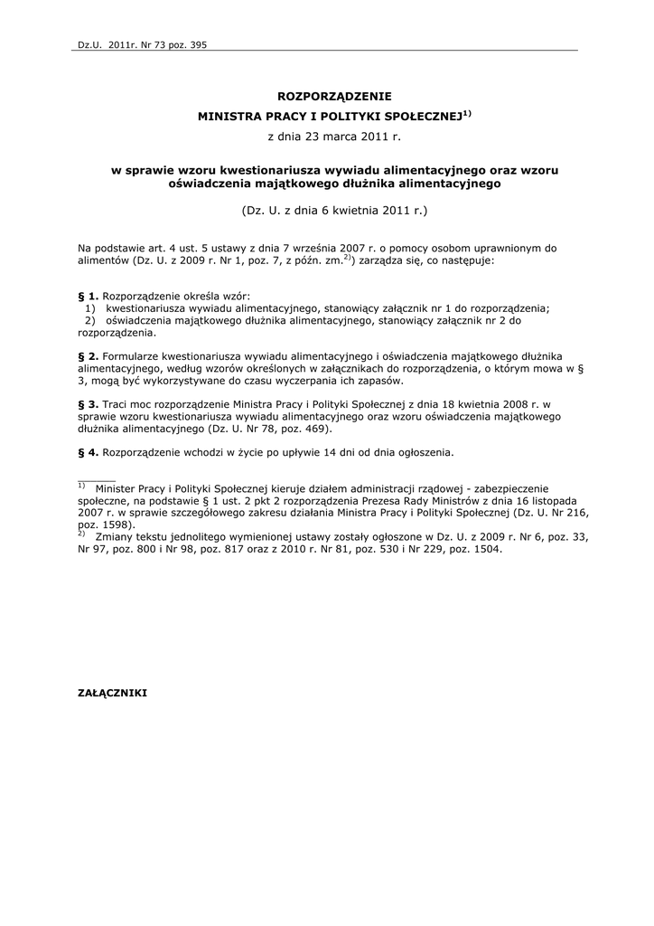 Dz.U. 2011r. Nr 73 poz. 395 ROZPORZĄDZENIE MINISTRA PRACY I POLITYKI SPOŁECZNEJ1) z dnia 23 marca 2011 r. w sprawie wzoru kwestionariusza wywiadu alimentacyjnego oraz wzoru oświadczenia majątkowego dłużnika alimentacyjnego (Dz. U. z dnia 6 kwietnia 2011 r.) Na podstawie art. 4 ust. 5 ustawy z dnia 7 września 2007 r. o pomocy osobom uprawnionym do alimentów (Dz. U. z 2009 r. Nr 1, poz. 7, z późn. zm.2)) zarządza się, co następuje: § 1. Rozporządzenie określa wzór: 1) kwestionariusza wywiadu alimentacyjnego, stanowiący załącznik nr 1 do rozporządzenia; 2) oświadczenia majątkowego dłużnika alimentacyjnego, stanowiący załącznik nr 2 do rozporządzenia. § 2. Formularze kwestionariusza wywiadu alimentacyjnego i oświadczenia majątkowego dłużnika alimentacyjnego, według wzorów określonych w załącznikach do rozporządzenia, o którym mowa w § 3, mogą być wykorzystywane do czasu wyczerpania ich zapasów. § 3. Traci moc rozporządzenie Ministra Pracy i Polityki Społecznej z dnia 18 kwietnia 2008 r. w sprawie wzoru kwestionariusza wywiadu alimentacyjnego oraz wzoru oświadczenia majątkowego dłużnika alimentacyjnego (Dz. U. Nr 78, poz. 469). § 4. Rozporządzenie wchodzi w życie po upływie 14 dni od dnia ogłoszenia. ______ 1) Minister Pracy i Polityki Społecznej kieruje działem administracji rządowej - zabezpieczenie społeczne, na podstawie § 1 ust. 2 pkt 2 rozporządzenia Prezesa Rady Ministrów z dnia 16 listopada 2007 r. w sprawie szczegółowego zakresu działania Ministra Pracy i Polityki Społecznej (Dz. U. Nr 216, poz. 1598). 2) Zmiany tekstu jednolitego wymienionej ustawy zostały ogłoszone w Dz. U. z 2009 r. Nr 6, poz. 33, Nr 97, poz. 800 i Nr 98, poz. 817 oraz z 2010 r. Nr 81, poz. 530 i Nr 229, poz. 1504. ZAŁĄCZNIKI Dz.U. 2011r. Nr 73 poz. 395 ZAŁĄCZNIK Nr 1 WZÓR (pieczęć organu właściwego dłużnika alimentacyjnego) ............................................................. nr ewidencyjny sprawy KWESTIONARIUSZ WYWIADU ALIMENTACYJNEGO Część I. Ogólne informacje o dłużniku alimentacyjnym 1. Imię/imiona 2. Nazwisko 3. Nr PESEL, a w przypadku braku – seria i nr paszportu lub innego dokumentu potwierdzającego tożsamość 4. Numer NIP 5. Nazwisko rodowe 6. Imiona rodziców i nazwisko rodowe matki 7. Data i miejsce urodzenia 8. Płeć 10. Stan cywilny 9. Obywatelstwo 11. Miejsce zamieszkania 12. Miejsce pobytu czasowego trwającego ponad 2 miesiące 13. Wykształcenie 14. Zawód wyuczony 15. Zawód wykonywany 16. Dodatkowe kwalifikacje 17. Seria i numer prawa jazdy Część II. Informacje o sytuacji rodzinnej dłużnika alimentacyjnego*) Lp. Imię i nazwisko osoby pozostającej na utrzymaniu dłużnika alimentacyjnego Data urodzenia Stan cywilny Relacja rodzinna (kim jest osoba pozostająca na utrzymaniu w stosunku do dłużnika alimentacyjnego) 1 2 3 4 5 6 7 *) Dotyczy wszystkich osób pozostających na utrzymaniu dłużnika alimentacyjnego. Dz.U. 2011r. Nr 73 poz. 395 Dz.U. 2011r. Nr 73 poz. 395 Część III. Informacje o sytuacji dochodowej i zawodowej dłużnika alimentacyjnego 1. Wysokość zasądzonych alimentów w stosunku do osoby uprawnionej/osób uprawnionych: 2. Przeciętny miesięczny dochód z ostatnich 3 miesięcy poprzedzających miesiąc przeprowadzenia wywiadu – podać źródło/a dochodu i wysokość: Imię i nazwisko uprawnionego Źródło dochodu Wysokość alimentów 1. 1. 2. 2. 3. 3. 4. 4. 5. 5. 6. 6. 7. 7. Suma Suma Kwota 3. Informacja na temat korzystania ze świadczeń pieniężnych z pomocy społecznej lub innej jednostki organizacyjnej albo pobierania emerytury lub renty (rodzaj i wysokość świadczenia): Świadczenie 1. 2. 3. 4. 5. 6. 7. 8. Suma Kwota Dz.U. 2011r. Nr 73 poz. 395 4. Informacja o aktualnym zatrudnieniu**): – 5. Informacja o miejscach poprzedniego zatrudnienia (adres pracodawcy): rodzaj (podstawa) zatrudnienia i adres pracodawcy ............................................................................. ............................................................................. ............................................................................. – bezrobotny – poszukujący pracy – bezrobotny niezarejestrowany – rolnik 6. Informacja na temat prowadzonej działalności gospodarczej: firma, adres, NIP, REGON, numer Krajowego Rejestru Sądowego: **) Niepotrzebne skreślić. Część IV. Informacje o stanie zdrowia dłużnika alimentacyjnego 1. Niepełnosprawność .............................................................................................................................................. .................................... (rodzaj i stopień niepełnosprawności, termin ważności orzeczenia) 2. Inne problemy zdrowotne .............................................................................................................................................. .................................... .............................................................................................................................................. .................................... .............................................................................................................................................. .................................... .............................................................................................................................................. .................................... Część V. Przyczyny niełożenia na utrzymanie osoby uprawnionej do świadczenia alimentacyjnego .............................................................................................................................................. .................................... .............................................................................................................................................. .................................... Dz.U. 2011r. Nr 73 poz. 395 ....................................