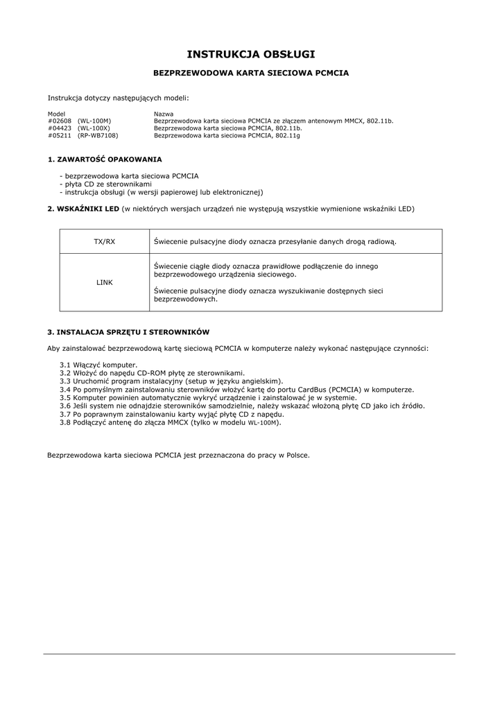 INSTRUKCJA OBSŁUGI BEZPRZEWODOWA KARTA SIECIOWA PCMCIA Instrukcja dotyczy następujących modeli: Model #02608 #04423 #05211 (WL-100M) (WL-100X) (RP-WB7108) Nazwa Bezprzewodowa karta sieciowa PCMCIA ze złączem antenowym MMCX, 802.11b. Bezprzewodowa karta sieciowa PCMCIA, 802.11b. Bezprzewodowa karta sieciowa PCMCIA, 802.11g 1. ZAWARTOŚĆ OPAKOWANIA - bezprzewodowa karta sieciowa PCMCIA - płyta CD ze sterownikami - instrukcja obsługi (w wersji papierowej lub elektronicznej) 2. WSKAŹNIKI LED (w niektórych wersjach urządzeń nie występują wszystkie wymienione wskaźniki LED) TX/RX Świecenie pulsacyjne diody oznacza przesyłanie danych drogą radiową. Świecenie ciągłe diody oznacza prawidłowe podłączenie do innego bezprzewodowego urządzenia sieciowego. LINK Świecenie pulsacyjne diody oznacza wyszukiwanie dostępnych sieci bezprzewodowych. 3. INSTALACJA SPRZĘTU I STEROWNIKÓW Aby zainstalować bezprzewodową kartę sieciową PCMCIA w komputerze należy wykonać następujące czynności: 3.1 3.2 3.3 3.4 3.5 3.6 3.7 3.8 Włączyć komputer. Włożyć do napędu CD-ROM płytę ze sterownikami. Uruchomić program instalacyjny (setup w języku angielskim). Po pomyślnym zainstalowaniu sterowników włożyć kartę do portu CardBus (PCMCIA) w komputerze. Komputer powinien automatycznie wykryć urządzenie i zainstalować je w systemie. Jeśli system nie odnajdzie sterowników samodzielnie, należy wskazać włożoną płytę CD jako ich źródło. Po poprawnym zainstalowaniu karty wyjąć płytę CD z napędu. Podłączyć antenę do złącza MMCX (tylko w modelu WL-100M). Bezprzewodowa karta sieciowa PCMCIA jest przeznaczona do pracy w Polsce. #02608 (WL-100M) Bezprzewodowa karta sieciowa PCMCIA ze złączem antenowym MMCX. - Interfejs: PCMCIA Typ II Standard: IEEE 802.11b Protokoły sieciowe: TCP/IP, IPX/SPX i NetBEUI Modulacja: CCK@11/5.5Mbps, DQPSK@2Mbps and DBPSK@1Mbps Prędkość transmisji: 1 / 2 / 5.5 / 11 Mbit/s Zasięg: wewnątrz 30m ~ 120m, na zewnątrz 140m ~ 400m Sterowniki: Windows 95/98/2000/ME/XP Certyfikaty: FCC Part 15 Class B & CE #04423 (WL-100X) Bezprzewodowa karta sieciowa PCMCIA. - Interfejs: PCMCIA Typ II Standard: IEEE 802.11b Protokoły sieciowe: TCP/IP, IPX/SPX i NetBEUI Ilość kanałów: 14 Modulacja: CCK@11/5.5Mbps, DQPSK@2Mbps and DBPSK@1Mbps Prędkość transmisji: 1 / 2 / 5.5 / 11 Mbit/s Zasięg: wewnątrz 30m ~ 120m, na zewnątrz 140m ~ 400m Sterowniki: Windows 95/98/2000/ME Certyfikaty: FCC Part 15 Class B & CE #05211 (RP-WB7108) Bezprzewodowa karta sieciowa PCMCIA. - zgodność ze standardami 802.11b i 802.11g duża prędkość transmisji do 54 Mbps wsparcie dla 64/128-bit WEP, WPA i AES wysoka przepustowość sterowniki dla Windows 98SE/ME/2k/XP zaawansowane bezpieczeństwo sieci dzięki 802.1x złącze: CardBus 32-bit antena wbudowana