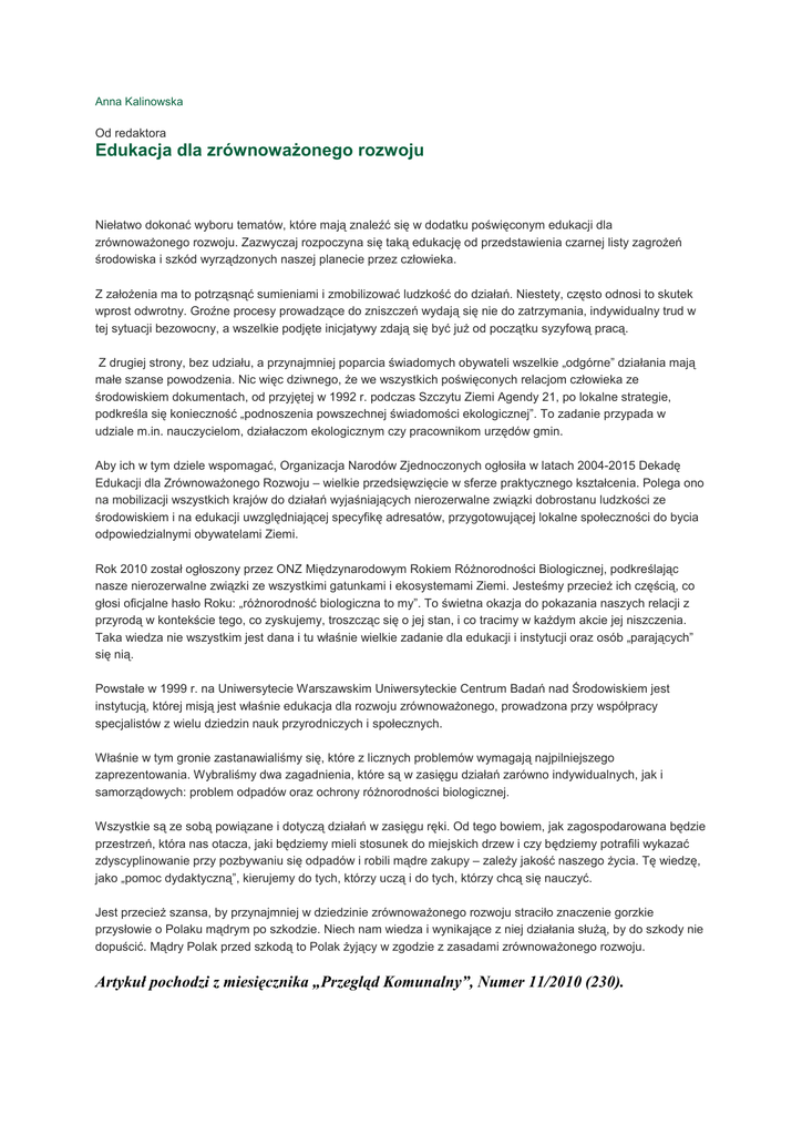Anna Kalinowska Od redaktora Edukacja dla zrównowaŜonego rozwoju Niełatwo dokonać wyboru tematów, które mają znaleźć się w dodatku poświęconym edukacji dla zrównowaŜonego rozwoju. Zazwyczaj rozpoczyna się taką edukację od przedstawienia czarnej listy zagroŜeń środowiska i szkód wyrządzonych naszej planecie przez człowieka. Z załoŜenia ma to potrząsnąć sumieniami i zmobilizować ludzkość do działań. Niestety, często odnosi to skutek wprost odwrotny. Groźne procesy prowadzące do zniszczeń wydają się nie do zatrzymania, indywidualny trud w tej sytuacji bezowocny, a wszelkie podjęte inicjatywy zdają się być juŜ od początku syzyfową pracą. Z drugiej strony, bez udziału, a przynajmniej poparcia świadomych obywateli wszelkie „odgórne” działania mają małe szanse powodzenia. Nic więc dziwnego, Ŝe we wszystkich poświęconych relacjom człowieka ze środowiskiem dokumentach, od przyjętej w 1992 r. podczas Szczytu Ziemi Agendy 21, po lokalne strategie, podkreśla się konieczność „podnoszenia powszechnej świadomości ekologicznej”. To zadanie przypada w udziale m.in. nauczycielom, działaczom ekologicznym czy pracownikom urzędów gmin. Aby ich w tym dziele wspomagać, Organizacja Narodów Zjednoczonych ogłosiła w latach 2004-2015 Dekadę Edukacji dla ZrównowaŜonego Rozwoju – wielkie przedsięwzięcie w sferze praktycznego kształcenia. Polega ono na mobilizacji wszystkich krajów do działań wyjaśniających nierozerwalne związki dobrostanu ludzkości ze środowiskiem i na edukacji uwzględniającej specyfikę adresatów, przygotowującej lokalne społeczności do bycia odpowiedzialnymi obywatelami Ziemi. Rok 2010 został ogłoszony przez ONZ Międzynarodowym Rokiem RóŜnorodności Biologicznej, podkreślając nasze nierozerwalne związki ze wszystkimi gatunkami i ekosystemami Ziemi. Jesteśmy przecieŜ ich częścią, co głosi oficjalne hasło Roku: „róŜnorodność biologiczna to my”. To świetna okazja do pokazania naszych relacji z przyrodą w kontekście tego, co zyskujemy, troszcząc się o jej stan, i co tracimy w kaŜdym akcie jej niszczenia. Taka wiedza nie wszystkim jest dana i tu właśnie wielkie zadanie dla edukacji i instytucji oraz osób „parających” się nią. Powstałe w 1999 r. na Uniwersytecie Warszawskim Uniwersyteckie Centrum Badań nad Środowiskiem jest instytucją, której misją jest właśnie edukacja dla rozwoju zrównowaŜonego, prowadzona przy współpracy specjalistów z wielu dziedzin nauk przyrodniczych i społecznych. Właśnie w tym gronie zastanawialiśmy się, które z licznych problemów wymagają najpilniejszego zaprezentowania. Wybraliśmy dwa zagadnienia, które są w zasięgu działań zarówno indywidualnych, jak i samorządowych: problem odpadów oraz ochrony róŜnorodności biologicznej. Wszystkie są ze sobą powiązane i dotyczą działań w zasięgu ręki. Od tego bowiem, jak zagospodarowana będzie przestrzeń, która nas otacza, jaki będziemy mieli stosunek do miejskich drzew i czy będziemy potrafili wykazać zdyscyplinowanie przy pozbywaniu się odpadów i robili mądre zakupy – zaleŜy jakość naszego Ŝycia. Tę wiedzę, jako „pomoc dydaktyczną”, kierujemy do tych, którzy uczą i do tych, którzy chcą się nauczyć. Jest przecieŜ szansa, by przynajmniej w dziedzinie zrównowaŜonego rozwoju straciło znaczenie gorzkie przysłowie o Polaku mądrym po szkodzie. Niech nam wiedza i wynikające z niej działania słuŜą, by do szkody nie dopuścić. Mądry Polak przed szkodą to Polak Ŝyjący w zgodzie z zasadami zrównowaŜonego rozwoju. Artykuł pochodzi z miesięcznika „Przegląd Komunalny”, Numer 11/2010 (230).