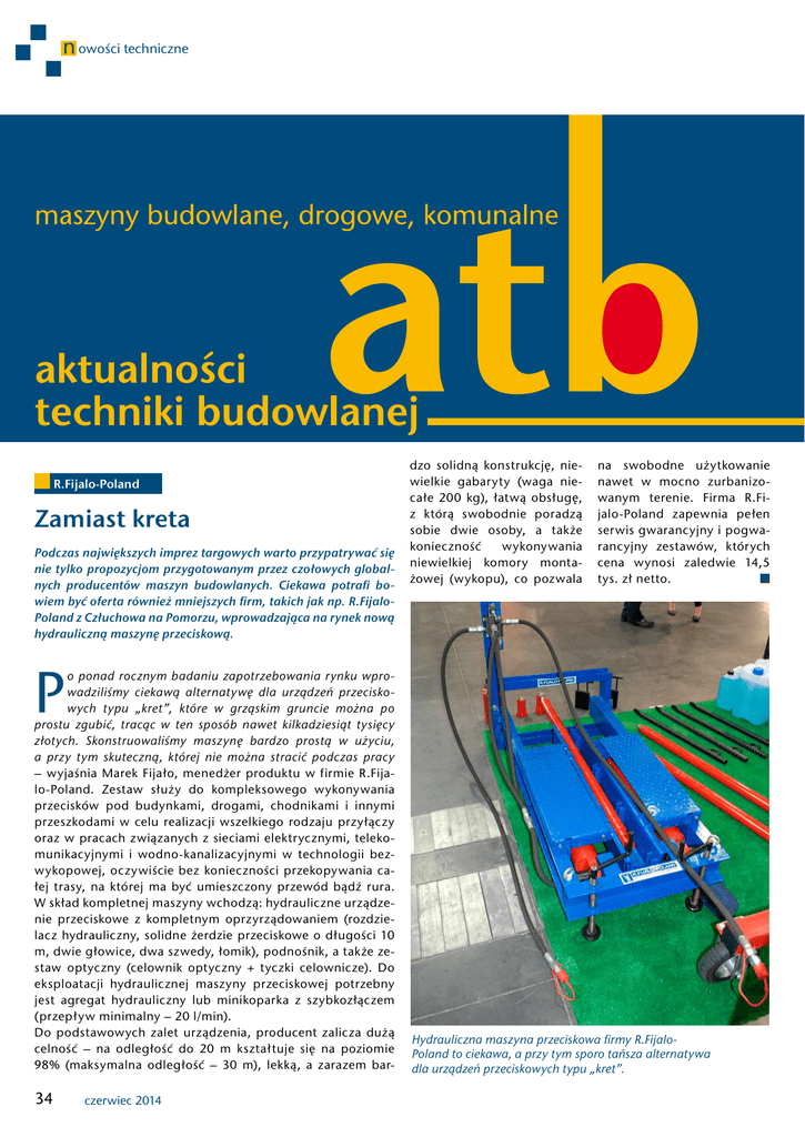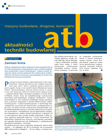 n owości techniczne R.Fijalo-Poland Zamiast kreta Podczas największych imprez targowych warto przypatrywać się nie tylko propozycjom przygotowanym przez czołowych globalnych producentów maszyn budowlanych. Ciekawa potrafi bowiem być oferta również mniejszych firm, takich jak np. R.FijaloPoland z Człuchowa na Pomorzu, wprowadzająca na rynek nową hydrauliczną maszynę przeciskową. dzo solidną konstrukcję, niewielkie gabaryty (waga niecałe 200 kg), łatwą obsługę, z którą swobodnie poradzą sobie dwie osoby, a także konieczność wykonywania niewielkiej komory montażowej (wykopu), co pozwala na swobodne użytkowanie nawet w mocno zurbanizowanym terenie. Firma R.Fijalo-Poland zapewnia pełen serwis gwarancyjny i pogwarancyjny zestawów, których cena wynosi zaledwie 14,5 tys. zł netto. P o ponad rocznym badaniu zapotrzebowania rynku wprowadziliśmy ciekawą alternatywę dla urządzeń przeciskowych typu „kret”, które w grząskim gruncie można po prostu zgubić, tracąc w ten sposób nawet kilkadziesiąt tysięcy złotych. Skonstruowaliśmy maszynę bardzo prostą w użyciu, a przy tym skuteczną, której nie można stracić podczas pracy – wyjaśnia Marek Fijało, menedżer produktu w firmie R.Fijalo-Poland. Zestaw służy do kompleksowego wykonywania przecisków pod budynkami, drogami, chodnikami i innymi przeszkodami w celu realizacji wszelkiego rodzaju przyłączy oraz w pracach związanych z sieciami elektrycznymi, telekomunikacyjnymi i wodno-kanalizacyjnymi w technologii bezwykopowej, oczywiście bez konieczności przekopywania całej trasy, na której ma być umieszczony przewód bądź rura. W skład kompletnej maszyny wchodzą: hydrauliczne urządzenie przeciskowe z kompletnym oprzyrządowaniem (rozdzielacz hydrauliczny, solidne żerdzie przeciskowe o długości 10 m, dwie głowice, dwa szwedy, łomik), podnośnik, a także zestaw optyczny (celownik optyczny + tyczki celownicze). Do eksploatacji hydraulicznej maszyny przeciskowej potrzebny jest agregat hydrauliczny lub minikoparka z szybkozłączem (przepływ minimalny – 20 l/min). Do podstawowych zalet urządzenia, producent zalicza dużą celność – na odległość do 20 m kształtuje się na poziomie 98% (maksymalna odległość – 30 m), lekką, a zarazem bar- 34 czerwiec 2014 Hydrauliczna maszyna przeciskowa firmy R.FijaloPoland to ciekawa, a przy tym sporo tańsza alternatywa dla urządzeń przeciskowych typu „kret”.