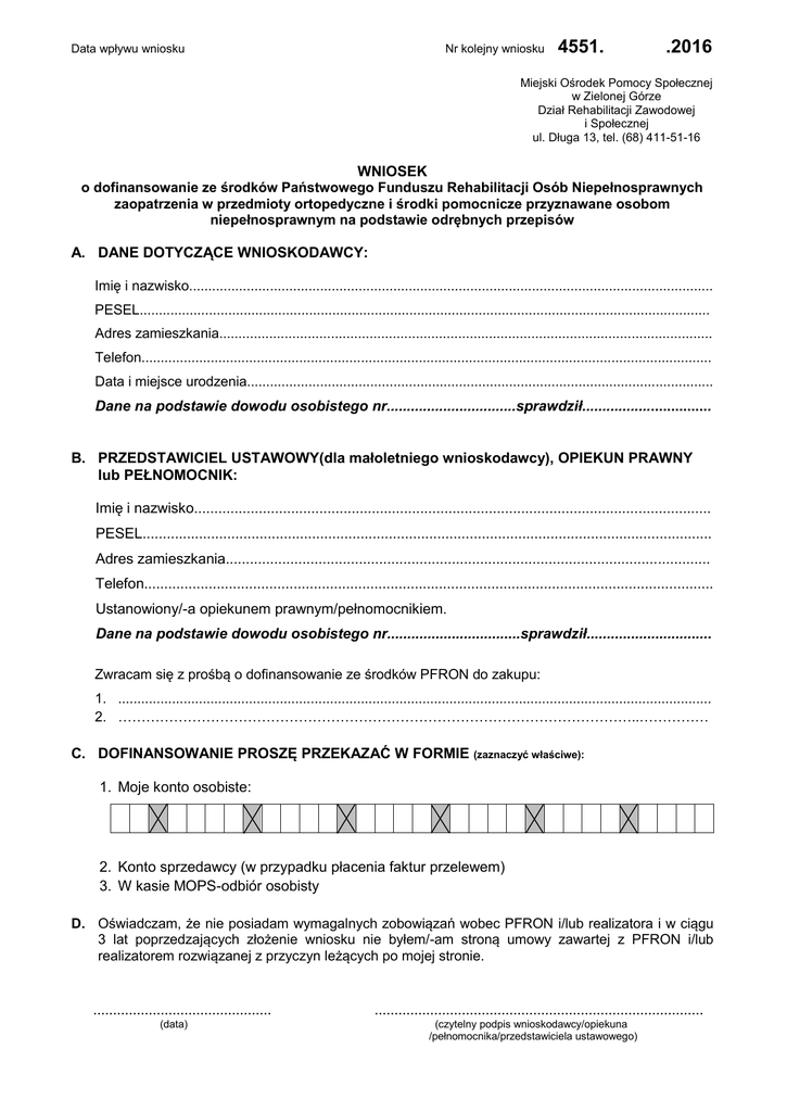 Data wpływu wniosku Nr kolejny wniosku 4551. .2016 Miejski Ośrodek Pomocy Społecznej w Zielonej Górze Dział Rehabilitacji Zawodowej i Społecznej ul. Długa 13, tel. (68) 411-51-16 WNIOSEK o dofinansowanie ze środków Państwowego Funduszu Rehabilitacji Osób Niepełnosprawnych zaopatrzenia w przedmioty ortopedyczne i środki pomocnicze przyznawane osobom niepełnosprawnym na podstawie odrębnych przepisów A. DANE DOTYCZĄCE WNIOSKODAWCY: Imię i nazwisko........................................................................................................................................ PESEL.................................................................................................................................................... Adres zamieszkania................................................................................................................................ Telefon.................................................................................................................................................... Data i miejsce urodzenia......................................................................................................................... Dane na podstawie dowodu osobistego nr................................sprawdził................................ B. PRZEDSTAWICIEL USTAWOWY(dla małoletniego wnioskodawcy), OPIEKUN PRAWNY lub PEŁNOMOCNIK: Imię i nazwisko................................................................................................................................ PESEL............................................................................................................................................. Adres zamieszkania........................................................................................................................ Telefon............................................................................................................................................. Ustanowiony/-a opiekunem prawnym/pełnomocnikiem. Dane na podstawie dowodu osobistego nr.................................sprawdził............................... Zwracam się z prośbą o dofinansowanie ze środków PFRON do zakupu: 1. .......................................................................................................................................................... 2. …………………………………………………………………………………………………..…………… C. DOFINANSOWANIE PROSZĘ PRZEKAZAĆ W FORMIE (zaznaczyć właściwe): 1. Moje konto osobiste: 2. Konto sprzedawcy (w przypadku płacenia faktur przelewem) 3. W kasie MOPS-odbiór osobisty D. Oświadczam, że nie posiadam wymagalnych zobowiązań wobec PFRON i/lub realizatora i w ciągu 3 lat poprzedzających złożenie wniosku nie byłem/-am stroną umowy zawartej z PFRON i/lub realizatorem rozwiązanej z przyczyn leżących po mojej stronie. ............................................. (data) ................................................................................... (czytelny podpis wnioskodawcy/opiekuna /pełnomocnika/przedstawiciela ustawowego) E. OŚWIADCZENIE WNIOSKODAWCY O DOCHODACH: Ja, niżej podpisany/-a, pouczony/-a o odpowiedzialności karnej zgodnie z art. 297 § 1 Kodeksu Karnego, stosownie do art. 75 § 2 KPA oświadczam, że przeciętny miesięczny dochód* na jednego członka rodziny wynosi.......................................................zł (słownie:.......................................................................................................................................................) Liczba osób we wspólnym gospodarstwie domowym wynosi .............. ............................................. (data) .................................................................................... (czytelny podpis wnioskodawcy/opiekuna /pełnomocnika/przedstawiciela ustawowego) F. OŚWIADCZENIE O WYRAŻENIU ZGODY NA PRZETWARZANIE DANYCH OSOBOWYCH: (Podanie danych i wyrażenie zgody jest dobrowolne, jednak ich niepodanie i brak zgody na ich przetwarzanie skutkować będzie brakiem możliwości dofinansowania do zaopatrzenia w sprzęt ortopedyczny i środki pomocnicze) Oświadczam, że wyrażam zgodę na przetwarzanie moich danych osobowych oraz danych mojego dziecka/podopiecznego (jeśli dotyczy) przez Realizatora zadań tj. Miejski Ośrodek Pomocy Społecznej w Zielonej Górze, ul. Długa 13 (administrator danych) zgodnie z ustawą z dnia 29 sierpnia 1997 r. o ochronie danych osobowych (Dz. U. z 2014 poz. 1662, 1182) dla celów związanych z udzieleniem dofinansowania do zaopatrzenia w przedmioty ort. i środki pomocnicze ze środków PFRON oraz dla wypełnienia prawnie usprawiedliwionych celów administratora danych. Zostałam/-em poinformowana/-y o prawie dostępu do treści swoich danych oraz ich poprawiania, aktualizacji, uzupełniania i usuwania. ............................................. (data) .................................................................................... (czytelny podpis wnioskodawcy/opiekuna /pełnomocnika/przedstawiciela ustawowego) ________________________________________________________________________________________________ *Uwaga! Przeciętny miesięczny dochód – średni miesięczny dochód w rozumieniu przepisów o świadczeniach rodzinnych pomniejszony o obciążenie zaliczką na podatek dochodowy od osób fizycznych, składkę z tytułu ubezpieczeń: emerytalnego, rentowego i chorobowego, określoną w przepisach o systemie ubezpieczeń społecznych oraz o kwotę alimentów świadczonych przez osoby pozostające we wspólnym gospodarstwie domowym na rzecz innych osób, podzielony przez liczbę osób pozostających we wspólnym gospodarstwie domowym, obliczony za kwartał poprzedzający miesiąc, w którym składany jest wniosek. Przy ustalaniu dochodu w rodzinie Wnioskodawcy, nie uwzględnia się zasiłków pielęgnacyjnych. Wnioskodaw