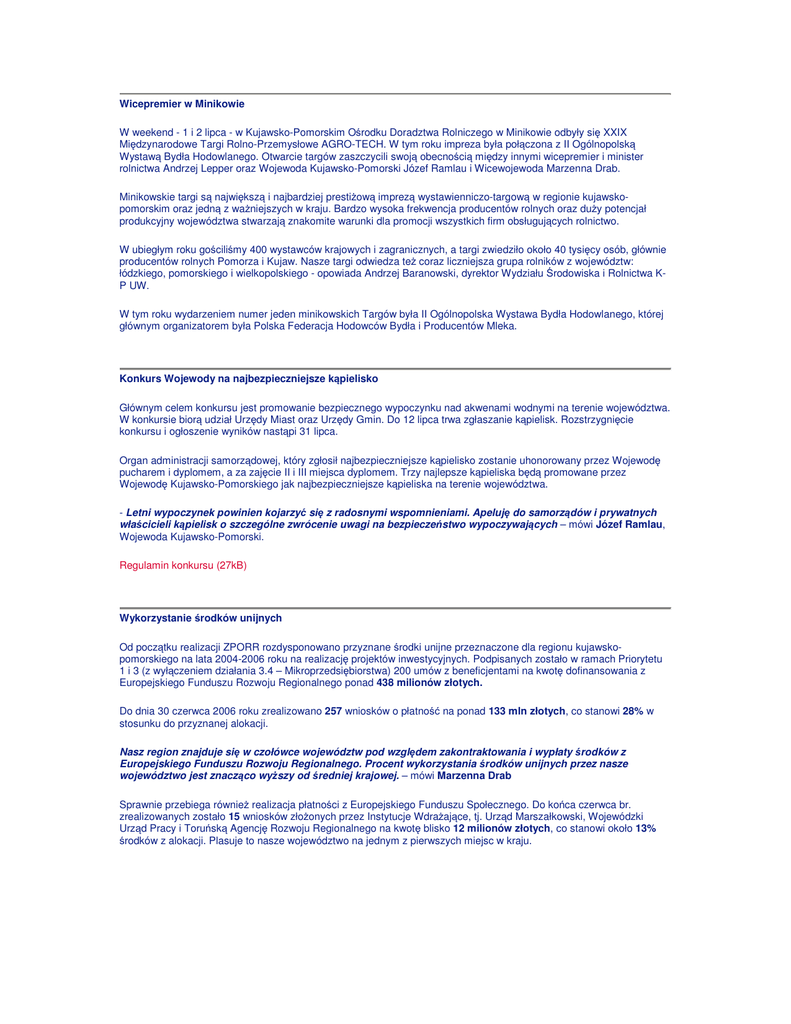 Wicepremier w Minikowie W weekend - 1 i 2 lipca - w Kujawsko-Pomorskim Ośrodku Doradztwa Rolniczego w Minikowie odbyły się XXIX Międzynarodowe Targi Rolno-Przemysłowe AGRO-TECH. W tym roku impreza była połączona z II Ogólnopolską Wystawą Bydła Hodowlanego. Otwarcie targów zaszczycili swoją obecnością między innymi wicepremier i minister rolnictwa Andrzej Lepper oraz Wojewoda Kujawsko-Pomorski Józef Ramlau i Wicewojewoda Marzenna Drab. Minikowskie targi są największą i najbardziej prestiżową imprezą wystawienniczo-targową w regionie kujawskopomorskim oraz jedną z ważniejszych w kraju. Bardzo wysoka frekwencja producentów rolnych oraz duży potencjał produkcyjny województwa stwarzają znakomite warunki dla promocji wszystkich firm obsługujących rolnictwo. W ubiegłym roku gościliśmy 400 wystawców krajowych i zagranicznych, a targi zwiedziło około 40 tysięcy osób, głównie producentów rolnych Pomorza i Kujaw. Nasze targi odwiedza też coraz liczniejsza grupa rolników z województw: łódzkiego, pomorskiego i wielkopolskiego - opowiada Andrzej Baranowski, dyrektor Wydziału Środowiska i Rolnictwa KP UW. W tym roku wydarzeniem numer jeden minikowskich Targów była II Ogólnopolska Wystawa Bydła Hodowlanego, której głównym organizatorem była Polska Federacja Hodowców Bydła i Producentów Mleka. Konkurs Wojewody na najbezpieczniejsze kąpielisko Głównym celem konkursu jest promowanie bezpiecznego wypoczynku nad akwenami wodnymi na terenie województwa. W konkursie biorą udział Urzędy Miast oraz Urzędy Gmin. Do 12 lipca trwa zgłaszanie kąpielisk. Rozstrzygnięcie konkursu i ogłoszenie wyników nastąpi 31 lipca. Organ administracji samorządowej, który zgłosił najbezpieczniejsze kąpielisko zostanie uhonorowany przez Wojewodę pucharem i dyplomem, a za zajęcie II i III miejsca dyplomem. Trzy najlepsze kąpieliska będą promowane przez Wojewodę Kujawsko-Pomorskiego jak najbezpieczniejsze kąpieliska na terenie województwa. - Letni wypoczynek powinien kojarzyć się z radosnymi wspomnieniami. Apeluję do samorządów i prywatnych właścicieli kąpielisk o szczególne zwrócenie uwagi na bezpieczeństwo wypoczywających – mówi Józef Ramlau, Wojewoda Kujawsko-Pomorski. Regulamin konkursu (27kB) Wykorzystanie środków unijnych Od początku realizacji ZPORR rozdysponowano przyznane środki unijne przeznaczone dla regionu kujawskopomorskiego na lata 2004-2006 roku na realizację projektów inwestycyjnych. Podpisanych zostało w ramach Priorytetu 1 i 3 (z wyłączeniem działania 3.4 – Mikroprzedsiębiorstwa) 200 umów z beneficjentami na kwotę dofinansowania z Europejskiego Funduszu Rozwoju Regionalnego ponad 438 milionów złotych. Do dnia 30 czerwca 2006 roku zrealizowano 257 wniosków o płatność na ponad 133 mln złotych, co stanowi 28% w stosunku do przyznanej alokacji. Nasz region znajduje się w czołówce województw pod względem zakontraktowania i wypłaty środków z Europejskiego Funduszu Rozwoju Regionalnego. Procent wykorzystania środków unijnych przez nasze województwo jest znacząco wyższy od średniej krajowej. – mówi Marzenna Drab Sprawnie przebiega również realizacja płatności z Europejskiego Funduszu Społecznego. Do końca czerwca br. zrealizowanych zostało 15 wniosków złożonych przez Instytucje Wdrażające, tj. Urząd Marszałkowski, Wojewódzki Urząd Pracy i Toruńską Agencję Rozwoju Regionalnego na kwotę blisko 12 milionów złotych, co stanowi około 13% środków z alokacji. Plasuje to nasze województwo na jednym z pierwszych miejsc w kraju. Utworzenie rezerwatu przyrody 28.06.2006 r. odbyło się posiedzenie Wojewódzkiej Rady Ochrony Przyrody na którym, tematami wiodącymi były: projektowane utworzenie rezerwatu przyrody “Uroczysko Koneck” oraz planowane powiększenie rezerwatów przyrody: “Cisów Staropolskich im. Leona Wyczółkowskiego w Wierzchlesie”, “Rogóźno Zamek”. Projektowany na terenie Nadleśnictwa Gniewkowo rezerwat przyrody “Uroczysko Koneck” jest cenny ze względu na znajdujące się na tym terenie rzadkie w skali niżu Polski i Europy leśne zbiorowiska roślinne. Należy do nich grąd subkontynentalny w odmianie kujawskiej z masowym udziałem barwinka pospolitego. Spośród innych cennych gatunków roślin notowanych w obrębie tego siedliska wymienić można: konwalię majową, lilię złotogłów, czerńca gronkowego, kalinę koralową i pierwiosnkę lekarską. Osobliwością projektowanego rezerwatu jest wilgotna dąbrowa świetlista z udziałem kosaćca syberyjskiego. Rezerwat przyrody “Cisy Staropolskie im. Leona Wyczółkowskiego w Wierzchlesie” został uznany zarządzeniem Ministerstwa Leśnictwa z dn. 18.06.1956 r. Planowane powiększenie rezerwatu i wyznaczenie otuliny ma umożliwić bardziej efektywną ochronę stanowiska cisa we Wierzchlesie, poprzez kontrolę gospodarki wodnej – zabiegów melioracyjnych na tym terenie. Rezerwat przyrody “Rogóźno Zamek”, na terenie Nadleśnictwa Jamy, został powołany zarządzeniem Ministra Leśnictwa i Przemysłu Drzewnego 1974 r. w celu zachowania i ochrony wielogatunkowego lasu liściastego o charakterze naturalnym z udziałem brekinii oraz wyjątkowo bogatym runem. Do rezerwatu została włączona także rzeka Gardęga, na odcinku wzdłuż objętych ochroną lasów. Planowane powiększenie ma na celu zabezpieczenie kolejnego fragmentu doliny rzeki Gardęgi, który ma podobne, równie cenne walory przyrodnicze jak obszar istniejącego rezerwatu przyrody. Obwodnica Kowala Pierwszy raz w oficjalnych dokumentach obwodnica Kowala pojawiła się już w 1979 roku. Mimo to trzeba było czekać do dzisiaj, by można było rozpocząć konkretne prace. Po podpisaniu przez Wojewodę Kujawsko-Pomorskiego Józefa Ramlaua decyzji pozwalającej na uruchomienie inwestycji nic już nie stoi na przeszkodzie, by społeczność Kowala i okolic mogła mieć nadzieję, że rychłe rozwiązanie problemów