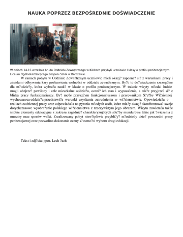 NAUKA POPRZEZ BEZPOŚREDNIE DOŚWIADCZENIE W dniach 14-15 września br. do Oddziału Zewnętrznego w Kikitach przybyli uczniowie I klasy o profilu penitencjarnym Liceum Ogólnokształcącego Zespołu Szkół w Barczewie. W ramach pobytu w Oddziale Zewn?trznym uczniowie mieli okazj? zapozna? si? z warunkami pracy i zasadami odbywania kary pozbawienia wolno?ci w oddziale zewn?trznym. By?o to do?wiadczenie szczególne dla m?odzie?y, która wybra?a nauk? w klasie o profilu penitencjarnym. W trakcie wizyty m?odzi ludzie mogli obejrze? pawilony i cele mieszkalne oddzia?u, oceni? ich stan i wyposa?enie, a tak?e przyjrze? si? z bliska pracy funkcjonariuszy. By? mo?e przysz?ym funkcjonariuszom i pracownikom S?u?by Wi?ziennej wychowawca oddzia?u przedstawi?a warunki uzyskania zatrudnienia w wi?ziennictwie. Opowiedzia?a o realiach codziennej pracy oraz odpowiada?a na pytania m?odych osób, które mia?y okazj? skonfrontowa? swoje dotychczasowe wyobra?enie polskiego wi?ziennictwa z rzeczywistym jego obrazem. Wizyta zawiera?a tak?e istotne elementy edukacyjne z zakresu zagadnie? charakteryzuj?cych s?u?by mundurowe takie jak ?wiczenia z musztry oraz sporów walki. Zrealizowany pobyt niew?tpliwie przybli?y? m?odzie?y dzie? powszedni pracy penitencjarnej oraz pozwolina dokonanie oceny s?uszno?ci wyboru drogi edukacji. Tekst i zdj?cia: ppor. Lech ?ach