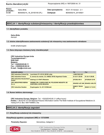 Rozporządzenie (WE) nr 1907/2006 Art. 31 Karta charakterystyki Nazwa produktu : nr.ref. Galva Brite Data sporządzenia: 05.01.15 Version : 2.1 BDS000214_18_20150105 (PL) Zastępuje: BDS000214_20130621 SEKCJA 1: Identyfikacja substancji/mieszaniny i identyfikacja przedsiębiorstwa 1.1. Identyfikator produktu Galva Brite Aerozol 1.2. Istotne zidentyfikowane zastosowania substancji lub mieszaniny oraz zastosowania odradzane środki antykorozyjne 1.3. Dane dotyczące dostawcy karty charakterystyki CRC Industries Europe bvba Touwslagerstraat 1 9240 Zele Belgium Tel.: +32(0)52/45.60.11 Fax.: +32(0)52/45.00.34 E-mail : [email protected] Jednostki zależne Tel CRC Industries Finland Oy Laurinkatu 57 A 23 B, 08100 Lohja +358/(19)32.921 CRC Industries France 6, avenue du marais, C.S. 90028, 95102 Argenteuil Cedex Fax 01.34.11.20.00 01.34.11.09.96 CRC Industries Deutschland Südring 9, D-76473 Iffezheim GmbH (07229) 303 0 (07229)30 32 66 CRC INDUSTRIES IBERIA S.L.U. GREMIO DEL CUERO-PARC.96, POLIGONO INDUSTR. DE HONTORIA, 40195 SEGOVIA 0034/921.427.546 0034/921.436.270 CRC Industries Sweden Kryptongatan 14, 431 53 Mölndal 0046/31 706 84 80 0046/31 27 39 91 1.4. Numer telefonu alarmowego CRC Industries Europe, Belgium: Tel.: +32(0)52/45.60.11 (office hours) Polska: + 48 42 63 14 724 National Poisons Information Centre The Nofer Institute of Occupational Medicine Ul. Teresy 8 P.O. Box 199 P-90950 L?dz SEKCJA 2: Identyfikacja zagrożeń 2.1. Klasyfikacja substancji lub mieszaniny Klasyfikacja zgodnie z przepisami (WE) nr 1272/2008 Parametry fizyczne: Aerozolowy, kategoria 1 CRC Industries Europe bvba Touwslagerstraat 1, 9240 Zele – Belgium Tel (+32) (0) 52 / 45 60 11 – Fax (+32) (0) 52 / 45 00 34 – www.crcind.com 1 / 13 Rozporządzenie (WE) nr 1907/2006 Art. 31 Karta charakterystyki Nazwa produktu : nr.ref. Galva Brite Data sporządzenia: 05.01.15 Version : 2.1 BDS000214_18_20150105 (PL) Zastępuje: BDS000214_20130621 Skrajnie łatwopalny aerozol. Pojemnik pod ciśnieniem: Ogrzanie grozi wybuchem. Nie sklasyfikowany Stwarzające zagrożenie dla środowiska wodnego, przewlekłe kategoria 3 Działa szkodliwie na organizmy wodne, powodując długotrwałe skutki. brak Zdrowie: Środowisko Naturalne : Inne zagrożenia : Klasyfikacja zgodnie z przepisami 67/548/EWG lub 1999/45/WE: SKRAJNIE ŁATWOPALNY Zdrowie: Parametry fizyczne: Środowisko Naturalne : Nie sklasyfikowany SKRAJNIE ŁATWOPALNY R52/53: Działa szkodliwie na organizmy wodne; może powodować długotrwałe niekorzystne zmiany w środowisku. 2.2. Elementy oznakowania Etykietowanie zgodnie z przepisami (WE) nr 1272/2008 Piktogram(y) zagrożeń: Zwroty hasłowe: Zwrot(y) wskazujące rodzaj zagrożenia: Zwrot(y) ostrzegawcze: Dodatkowe informacje dotyczące zagrożeń: Niebezpieczeństwo H222 : Skrajnie łatwopalny aerozol. H229 : Pojemnik pod ciśnieniem: Ogrzanie grozi wybuchem. H412 : Działa szkodliwie na organizmy wodne, powodując długotrwałe skutki. P102 : Chronić przed dziećmi. P210 : Przechowywać z dala od źródeł ciepła, gorących powierzchni, źródeł iskrzenia, otwartego ognia i innych źródeł zapłonu. Nie palić. P211 : Nie rozpylać nad otwartym ogniem lub innym źródłem zapłonu. P251 : Nie przekłuwać ani nie spalać, nawet po zużyciu. P410/412 : Chronić przed światłem słonecznym. Nie wystawiać na działanie temperatury przekraczającej 50°C/122°F. P501-2 : Zawartość/pojemniki muszą być przekazywane do odpowiedniego punktu zbiórki odpadów. brak 2.3. Inne zagrożenia brak SEKCJA 3: Skład/informacja o składnikach 3.1. Substancje Nie ma zastosowania. CRC Industries Europe bvba Touwslagerstraat 1, 9240 Zele – Belgium Tel (+32) (0) 52 / 45 60 11 – Fax (+32) (0) 52 / 45 00 34 – www.crcind.com 2 / 13 Rozporządzenie (WE) nr 1907/2006 Art. 31 Karta charakterystyki Nazwa produktu : nr.ref. Galva Brite Data sporządzenia: 05.01.15 Version : 2.1 BDS000214_18_20150105 (PL) Zastępuje: BDS000214_20130621 3.2. Mieszaniny niebezpieczny składnik CAS - nr EC-nr w/w % symbol zwroty R* Noty eter dimetylowy; metoksymetan; tlenek metylu 204115-10-6 065-8 50-75 F+ 12 A octan etylu; ester etylowy kwasu octowego 141-78-6 205500-4 5-10 F,Xi 11-36-66-67 B Benzyna lekka obrabiana wodorem (ropa naftowa) 64742-49- 2650 151-9 5-10 Xn 65 B,P Benzyna ciężka hydroodsiarczona (ropa naftowa); Niskowrząca frakcja naftowa obrabiana wodorem 64742-82- 2651 185-4 5-10 N 10-51/53-66-67 B,P glin, proszek niestabilizowany 7429-90-5 231072-3 1-5 F 11-15 A octan butylu; ester butylowy kwasu octowego 123-86-4 204658-1 1-5 Benzyna ciężka hydroodsiarczona (ropa naftowa); Niskowrząca frakcja naftowa obrabiana wodorem 64742-82- 2651 185-4 1-5 Xn 65 B,P 1,2,4-trimetylobenzen 95-63-6 202436-9 <1 Xn,N 10-20-36/37/3851/53 A mezytylen; 1,3,5-trimetylobenzen 108-67-8 203604-4 <1 Xi,N 10-37-51/53 A tlenek cynku 1314-13-2 215222-5 0.252.5 N 50/53 B oksym butan-2-onu;oksym ketonu etylowo-metylowego 96-29-7 202496-6 <0.1 Xn 21-40-41-43 B 10-66-67 Objaśnienie not A : substancja, której używanie jest ograniczone w ogólnym miejscu pracy B : substancja, której używanie jest ograniczone w miejscu pracy, jak ustalono w państwie P : nie klasyfikuje się jako rakotwórcza, mniej niż 0.1% w/w benzenu (Einecs-nr 200-753-7) niebezpieczny składnik Numer CAS - EC- w/w Klasa zagrożenia i kategoria rejestracyjny nr nr % Zwrot wskazujący rodzaj zagrożenia Noty eter dimetylowy; metoksymetan; tlenek metylu 01115211947212810-6 37 H220,H280 A 2045006575 8 Flam. Gas 1, Press. Gas 205500- 5-10 Flam. Liq. 2, Eye Irrit. 2, STOT SE 3 H225,H319,H336 4 octan etylu; ester etylowy kwasu octowego 14178-6 Benzyna lekka obrabiana wodorem (ropa naftowa) 26564742151- 5-10 Asp. Tox. 1 49-0 9 Benzyna ciężka hydroodsiarczona (ropa naftowa); Niskowrząca frakcja naftowa obrabiana wodorem Substancja ciekła łatwopalna, kategoria 2, Działanie toksyczne na narządy docelowe – narażenie 265jednorazowe STOT naraż. jednor., 64742185- 5-10 kategoria 3, Zagrożenie 