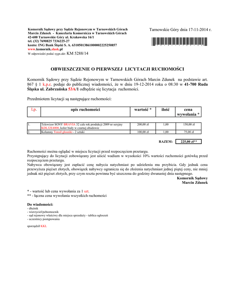 Tarnowskie Góry dnia 17-11-2014 r. Komornik Sądowy przy Sądzie Rejonowym w Tarnowskich Górach Marcin Zdunek - Kancelaria Komornicza w Tarnowskich Górach 42-600 Tarnowskie Góry ul. Krakowska 16/1 tel. (32) 7690825 7336225-27 konto: ING Bank Śląski S. A. 63105013861000002225250857 www.komornik.slask.pl W odpowiedzi podać sygn.akt: KM *7014111700195* 5288/14 OBWIESZCZENIE O PIERWSZEJ LICYTACJI RUCHOMOŚCI Komornik Sądowy przy Sądzie Rejonowym w Tarnowskich Górach Marcin Zdunek na podstawie art. 867 § 1 k.p.c. podaje do publicznej wiadomości, że w dniu 19-12-2014 roku o 08:30 w 41-700 Ruda Śląska ul. Zabrzańska 53A/1 odbędzie się licytacja ruchomości. Przedmiotem licytacji są następujące ruchomości: opis ruchomości l.p. 1. 2. Telewizor SONY BRAVIA 32 cale rok produkcji 2009 nr seryjny KDL32E4000, kolor biały w czarnej obudowie Kolumny Tonsil głosniki - 2 sztuki wartość * ilość cena wywołania * 200,00 zł 1,00 150,00 zł 100,00 zł 1,00 75,00 zł RAZEM: 225,00 zł** Ruchomości można oglądać w miejscu licytacji przed rozpoczęciem przetargu. Przystępujący do licytacji zobowiązany jest uiścić wadium w wysokości 10% wartości ruchomości gotówką przed rozpoczęciem przetargu. Nabywca obowiązany jest zapłacić cenę nabycia natychmiast po udzieleniu mu przybicia. Gdy jednak cena przewyższa pięćset złotych, obowiązek nabywcy ogranicza się do złożenia natychmiast jednej piątej ceny, nie mniej jednak niż pięćset złotych, przy czym reszta powinna być uiszczona do godziny dwunastej dnia następnego. Komornik Sądowy Marcin Zdunek * - wartość lub cena wywołania za 1 szt. ** - łączna cena wywołania wszystkich ruchomości Do wiadomości: - dłużnik - wierzyciel/pełnomocnik - sąd rejonowy właściwy dla miejsca sprzedaży - tablica ogłoszeń - uczestnicy postępowania sporządził KKL