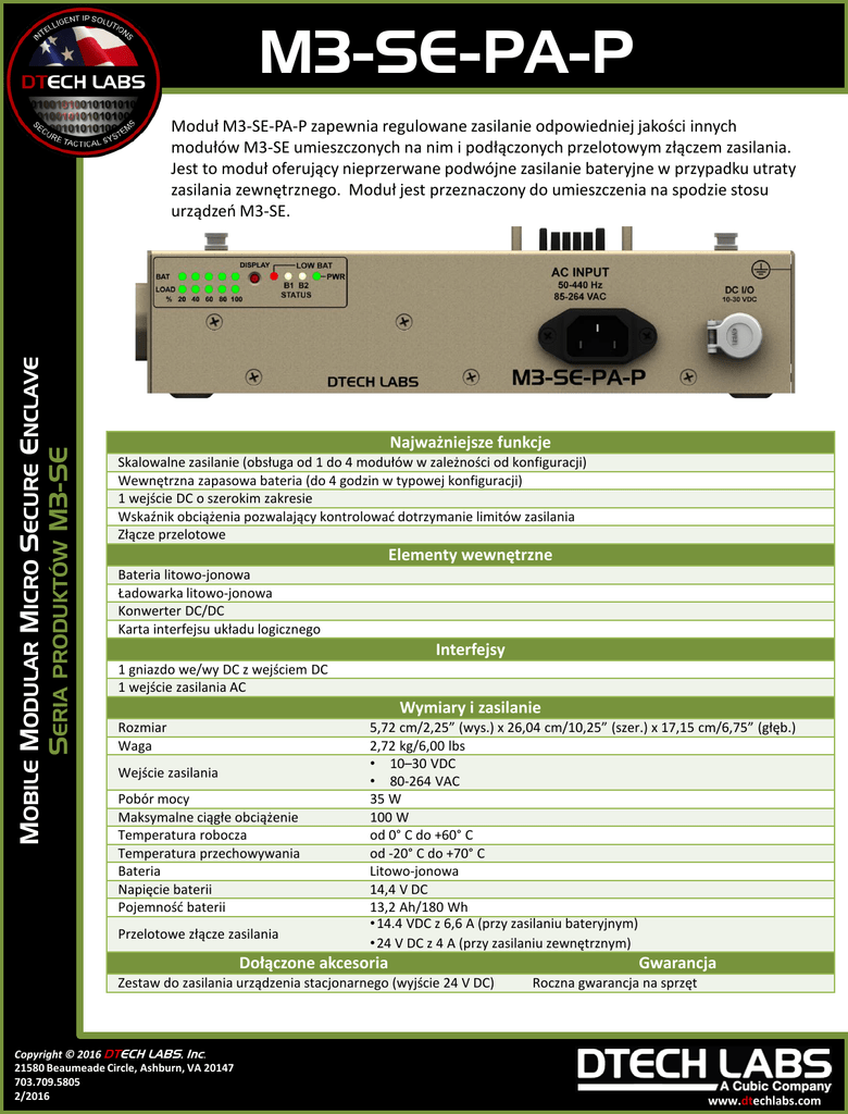 M3-SE-PA-P MOBILE MODULAR MICRO SECURE ENCLAVE SERIA PRODUKTÓW M3-SE Moduł M3-SE-PA-P zapewnia regulowane zasilanie odpowiedniej jakości innych modułów M3-SE umieszczonych na nim i podłączonych przelotowym złączem zasilania. Jest to moduł oferujący nieprzerwane podwójne zasilanie bateryjne w przypadku utraty zasilania zewnętrznego. Moduł jest przeznaczony do umieszczenia na spodzie stosu urządzeń M3-SE. Najważniejsze funkcje Skalowalne zasilanie (obsługa od 1 do 4 modułów w zależności od konfiguracji) Wewnętrzna zapasowa bateria (do 4 godzin w typowej konfiguracji) 1 wejście DC o szerokim zakresie Wskaźnik obciążenia pozwalający kontrolować dotrzymanie limitów zasilania Złącze przelotowe Bateria litowo-jonowa Ładowarka litowo-jonowa Konwerter DC/DC Karta interfejsu układu logicznego Elementy wewnętrzne Interfejsy 1 gniazdo we/wy DC z wejściem DC 1 wejście zasilania AC Rozmiar Waga Wejście zasilania Pobór mocy Maksymalne ciągłe obciążenie Temperatura robocza Temperatura przechowywania Bateria Napięcie baterii Pojemność baterii Przelotowe złącze zasilania Wymiary i zasilanie 5,72 cm/2,25” (wys.) x 26,04 cm/10,25” (szer.) x 17,15 cm/6,75” (głęb.) 2,72 kg/6,00 lbs • 10–30 VDC • 80-264 VAC 35 W 100 W od 0° C do +60° C od -20° C do +70° C Litowo-jonowa 14,4 V DC 13,2 Ah/180 Wh • 14.4 VDC z 6,6 A (przy zasilaniu bateryjnym) • 24 V DC z 4 A (przy zasilaniu zewnętrznym) Dołączone akcesoria Zestaw do zasilania urządzenia stacjonarnego (wyjście 24 V DC) Copyright © 2016 DTECH LABS, Inc. 21580 Beaumeade Circle, Ashburn, VA 20147 703.709.5805 2/2016 Gwarancja Roczna gwarancja na sprzęt www.dtechlabs.com
