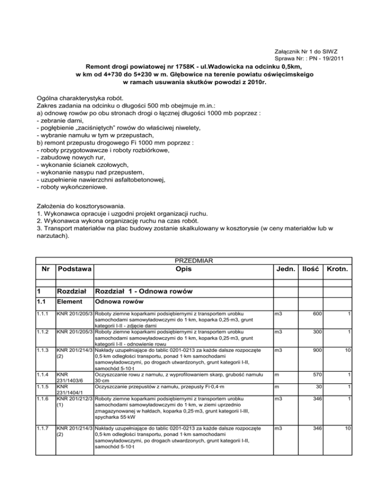 Załącznik Nr 1 do SIWZ Sprawa Nr: : PN - 19/2011 Remont drogi powiatowej nr 1758K - ul.Wadowicka na odcinku 0,5km, w km od 4+730 do 5+230 w m. Głębowice na terenie powiatu oświęcimskeigo w ramach usuwania skutków powodzi z 2010r. Ogólna charakterystyka robót. Zakres zadania na odcinku o długości 500 mb obejmuje m.in.: a) odnowę rowów po obu stronach drogi o łącznej długości 1000 mb poprzez : - zebranie darni, - pogłębienie „zaciśniętych” rowów do właściwej niwelety, - wybranie namułu w tym w przepustach, b) remont przepustu drogowego Fi 1000 mm poprzez : - roboty przygotowawcze i roboty rozbiórkowe, - zabudowę nowych rur, - wykonanie ścianek czołowych, - wykonanie nasypu nad przepustem, - uzupełnienie nawierzchni asfaltobetonowej, - roboty wykończeniowe. ZałoŜenia do kosztorysowania. 1. Wykonawca opracuje i uzgodni projekt organizacji ruchu. 2. Wykonawca wykona organizację ruchu na czas robót. 3. Transport materiałów na plac budowy zostanie skalkulowany w kosztorysie (w ceny materiałów lub w narzutach). PRZEDMIAR Nr Podstawa Opis 1 Rozdział Rozdział 1 - Odnowa rowów 1.1 Element Odnowa rowów 1.1.1 KNR 201/205/3 Roboty ziemne koparkami podsiębiernymi z transportem urobku samochodami samowyładowczymi do 1·km, koparka 0,25·m3, grunt kategorii I-II - zdjęcie darni KNR 201/205/3 Roboty ziemne koparkami podsiębiernymi z transportem urobku samochodami samowyładowczymi do 1·km, koparka 0,25·m3, grunt kategorii I-II - odnowienie rowu KNR 201/214/3 Nakłady uzupełniające do tablic 0201-0213 za kaŜde dalsze rozpoczęte (2) 0,5·km odległości transportu, ponad 1·km samochodami samowyładowczymi, po drogach utwardzonych, grunt kategorii I-II, samochód 5-10·t KNR Oczyszczanie rowu z namułu, z wyprofilowaniem skarp, grubość namułu 231/1403/6 30·cm KNR Oczyszczanie przepustów z namułu, przepusty Fi·0,4·m 231/1404/1 KNR 201/212/3 Roboty ziemne koparkami podsiębiernymi z transportem urobku (1) samochodami samowyładowczymi do 1·km, w ziemi uprzednio zmagazynowanej w hałdach, koparka 0,25·m3, grunt kategorii I-III, spycharka 55·kW 1.1.2 1.1.3 1.1.4 1.1.5 1.1.6 1.1.7 KNR 201/214/3 Nakłady uzupełniające do tablic 0201-0213 za kaŜde dalsze rozpoczęte (2) 0,5·km odległości transportu, ponad 1·km samochodami samowyładowczymi, po drogach utwardzonych, grunt kategorii I-II, samochód 5-10·t Jedn. Ilość Krotn. m3 600 1 m3 300 1 m3 900 10 m 570 1 m 30 1 m3 346 1 m3 346 10 2 Rozdział Rozdział 2 - Przepust 2.1 Element Roboty przygotowawcze 2.1.1 2.1.3 KNRW 510/323/1 KNRW 510/323/2 KNR 231/803/3 2.1.4 KNR 231/803/4 2.1.5 KNR 231/802/7 2.1.6 KNR 231/802/8 2.1.7 KNR 404/1103/1 2.1.8 KNR 404/1103/4 2.1.9 KNR 404/1103/5 2.1.10 KNR 201/217/4 Cięcie nawierzchni mechanicznie, masy mineralno-bitumiczne, grubość cięcia 5·cm Cięcie nawierzchni mechanicznie, masy mineralno-bitumiczne, dodatek za kaŜdy następny 1·cm grubości cięcia Rozebranie nawierzchni z mieszanek mineralno-bitumicznych, mechanicznie, grubość nawierzchni 3·cm Rozebranie nawierzchni z mieszanek mineralno-bitumicznych, mechanicznie, dodatek za kaŜdy dalszy 1·cm Rozebranie podbudowy, z kruszywa kamiennego mechanicznie, grubość podbudowy 15·cm Rozebranie podbudowy, z kruszywa kamiennego mechanicznie, dodatek za kaŜdy dalszy 1·cm grubości podbudowy Wywiezienie gruzu z terenu rozbiórki przy mechanicznym załadowaniu i wyładowaniu, załadowanie koparko-ładowarką samochodów samowyładowczych, przy obsłudze 3 samochodów na zmianę (R= 0,955, M= 1,000, S= 1,000) Wywiezienie gruzu z terenu rozbiórki przy mechanicznym załadowaniu i wyładowaniu, transport samochodem samowyładowczym na odległość 1 km (R= 0,955, M= 1,000, S= 1,000) Wywiezienie gruzu z terenu rozbiórki przy mechanicznym załadowaniu i wyładowaniu, nakłady uzupełniające na kaŜdy dalszy rozpoczęty 1·km ponad 1·km transportu (R= 0,955, M= 1,000, S= 1,000) Wykopy oraz przekopy wykonywane koparkami podsiębiernymi na odkład, koparka 0,25·m3, grunt kategorii III (R= 0,955, M= 1,000, S= 1,000) 2.1.11 2.1.2 2.1.12 2.1.13 m 10 1 m 10 7 m2 25 1 m2 25 9 m2 35 1 m2 35 20 m3 18 1 m3 18 1 m3 18 5 m3 210 1 KNR 201/317/2 Wykopy liniowe o ścianach pionowych pod fundamenty, rurociągi i kolektory m3 (1) w gruntach suchych z wydobyciem urobku łopatą lub wyciągiem ręcznym, głębokość do 1.5·m, kategoria gruntu III-IV, szerokość wykopu 0.8-1.5·m (R= 0,955, M= 1,000, S= 1,000) KNR 201/212/3 Roboty ziemne koparkami podsiębiernymi z transportem urobku m3 (1) samochodami samowyładowczymi do 1·km, w ziemi uprzednio zmagazynowanej w hałdach, koparka 0,25·m3, grunt kategorii I-III, spycharka 55·kW - odwóz nadmiaru gruntu (R= 0,955, M= 1,000, S= 1,000) KNR 201/214/4 Nakłady uzupełniające do tablic 0201-0213 za kaŜde dalsze rozpoczęte m3 (2) 0,5·km odległości transportu, ponad 1·km samochodami samowyładowczymi, po drogach utwardzonych, grunt kategorii III-IV, samochód 5-10·t (R= 0,955, M= 1,000, S= 1,000) 15 1 50 1 50 10 m 15 2 m3 15 1 m3 15 1 m3 15 5 m3 3 2 m3 10 1 2.2 Element 2.2.1 m 15 1 2.2.8 KNR 231/816/3 ANALOGIA Rozebranie przepustów rurowych, rury betonowe Fi·60·cm analogia dla rur fi 1000mm (krot.=2) KNR Wywiezienie gruzu z terenu rozbiórki przy mechanicznym załadowaniu i 404/1103/1 wyładowaniu, załadowanie koparko-ładowarką samochodów samowyładowczych, przy obsłudze 3 samochodów na zmianę (R= 0,955, M= 1,000, S= 1,000) KNR Wywiezienie gruzu z terenu rozbiórki przy mechanicznym załadowaniu i 404/1103/4 wyładowaniu, transport samochodem samowyładowczym na odległość 1 km (R= 0,955, M= 1,000, S= 1,000) KNR Wywiezienie gruzu z terenu rozbiórki przy mechanicznym załadowaniu i 404/1103/5 wyładowaniu, nakłady uzupełniające na kaŜdy dalszy rozpoczęty 1·km ponad 1·km transportu (R= 0,955, M= 1,000, S= 1,000) KNR 218/609/1 Układanie mieszanki betonowej ręczne w konstrukcjach, ławy fundamentowe, bloki oporowe KNR 201/610/6 DrenaŜe - podsypk