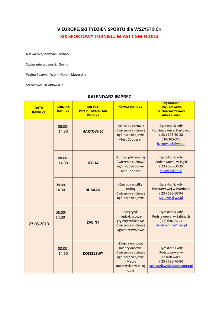 V EUROPEJSKI TYDZIEŃ SPORTU dla WSZYSTKICH XIX SPORTOWY TURNIEJU MIAST I GMIN 2013 Nazwa miejscowości: Rybno Status miejscowości: Gmina Województwo: Warmińsko – Mazurskie Starostwo: Działdowskie KALENDARZ IMPREZ DATA IMPREZY GODZINA IMPREZY 08.0014.30 08.0014.30 08.0014.30 MIEJSCE PRZEPROWADZENIA IMPREZY 08.0014.30 OrganizatorImię i nazwisko Telefon komórkowy Adres e- mail HARTOWIEC -Marsz po zdrowie -Ćwiczenia ruchowe ogólnorozwojowe -Test Coopera- Dyrektor Szkoły Podstawowej w Hartowcu ( 23 ) 696-60-28 510-265-373 [email protected] JEGLIA -Turniej piłki nożnej -Ćwiczenia ruchowe ogólnorozwojowe -Test Coopera- Dyrektor Szkoły Podstawowej w Jeglii ( 23 ) 696-60-35 [email protected] RUMIAN -Zawody w piłkę nożną -Ćwiczenia ruchowe ogólnorozwojowe Dyrektor Szkoły Podstawowej w Rumianie ( 23 ) 696-60-94 [email protected] ŻABINY -Rozgrywki międzyklasowegry zręcznościowe -Ćwiczenia ruchowe Ogólnorozwojowe Dyrektor Szkoły Podstawowej w Żabinach ( 23) 696-76-11 [email protected] 08.0014.30 27.05.2013 NAZWA IMPREZY KOSZELEWY -Zajęcia ruchowe międzyklasowe -Ćwiczenia ruchowe ogólnorozwojowe - Mecze towarzyskie w piłkę nożną. Dyrektor Szkoły Podstawowej w Koszelewach ( 23 ) 696-76-84 [email protected] 08.0014.30 08.0014.30 08.0014.30 19.0020.30 Zespół Szkół w Rybnie SZKOŁA PODSTAWOWA RYBNO PRZEDSZKOLE w RYBNIE OSiR w RYBNIE -Ćwiczenia ruchowe ogólnorozwojowe - Dzień Europejski konkurencje sportowe, taniec, Dyrektor Zespołu Szkół w Rybnie ( 23 ) 696-61-02 510-265-425 [email protected] -Zajęcia ruchowe w terenie, -Zajęcia terenowe w lesie, -Marszobieg -Ćwiczenia ruchowe ogólnorozwojowe Dyrektor Szkoły Podstawowej w Rybnie ( 23 ) 696-60-02 510265435 [email protected] - Ćwiczenia poranne -Dzień Dziecka na plaży ( zabawy na urządzeniach dmuchanych i trampolinie) - Ćwiczenia ruchowe ogólnorozwojowe Dyrektor Przedszkola w Rybnie ( 23) 696-60-94 510-265-414 [email protected] -zajęcia fitness dla kobiet - mecz piłki siatkowej Aleksandra Gniazdowska 510-265-418 Andrzej Wiergowski 510-265-418 [email protected] - turniej piłki Dyrektor Szkoły Podstawowej w Jeglii ( 23 ) 696-60-35 [email protected] JEGLIA 08.0014.30 siatkowej - Ćwiczenia ruchowe ogólnorozwojowe RUMIAN 08.0014.30 08.0014.30 - zabawy na urządzeniach dmuchanych i trampolinie na plaży nad jeziorem Zarybinek ŻABINY -Wycieczka do lasu - wycieczka Dyrektor Szkoły Podstawowej w Rumianie ( 23 ) 696-60-94 [email protected] Dyrektor Szkoły Podstawowej w Żabinach 28.05.2013 rowerowa -mecz towarzyski w piłce nożnej - Ćwiczenia ruchowe ogólnorozwojowe ( 23) 696-76-11 [email protected] -mecze towarzyskie Dyrektor Szkoły Podstawowej w Koszelewach ( 23 ) 696-76-84 [email protected] 08.0014.30 KOSZELEWY 08.0014.30 Zespół Szkół w Rybnie -Ćwiczenia ruchowe Ogólnorozwojowe -Test Coopera- Dyrektor Zespołu Szkół w Rybnie ( 23 ) 696-61-02 510-265-425 [email protected] 08.0014.30 SZKOŁA PODSTAWOWA RYBNO -mecz siatkówki chłopcy klasy IVb i Vb -taniec i ćwiczenia przy muzyce, - Ćwiczenia ruchowe ogólnorozwojowe -Test Coopera- Dyrektor Szkoły Podstawowej w Rybnie ( 23 ) 696-60-02 510265435 [email protected] 08.0014.30 PRZEDSZKOLE w RYBNIE -ćwiczenia poranne -ćwiczenia ruchowe Dyrektor Przedszkola w Rybnie ( 23) 696-60-94 510-265-414 [email protected] w piłce nożnej z SP Żabiny - Ćwiczenia ruchowe ogólnorozwojowe -Test Coopera- na świeżym powietrzu -zabawy taneczne, ruchowe włączenie do zabawy rodziców 19.0020.00 OSiR w RYBNIE -zajęcia fitness dla kobiet Hanna Bem 510-265-418 [email protected] 08.0014.30 HARTOWIEC - wycieczka rowerowa po Welskim Parku Krajobrazowym - Ćwiczenia ruchowe ogólnorozwojowe Dyrektor Szkoły Podstawowej w Hartowcu ( 23 ) 696-60-28 510-265-373 [email protected] 08.0014.30 JEGLIA 08.0014.30 RUMIAN 29.05.2013 08.0014.30 ŻABINY - zabawy na urządzeniach dmuchanych i trampolinie na plaży nad jeziorem Zarybinek -Rozgrywki w piłkę siatkową i koszykówkę - Ćwiczenia ruchowe ogólnorozwojowe -Test Coopera- -Test Cooperabadanie wydolności fizycznej uczniów klas VI -Marszobieg kl. IVVI - Ćwiczenia ruchowe ogólnorozwojowe Dyrektor Szkoły Podstawowej w Jeglii ( 23 ) 696-60-35 [email protected] Dyrektor Szkoły Podstawowej w Rumianie ( 23 ) 696-60-94 [email protected] Dyrektor Szkoły Podstawowej w Żabinach ( 23) 696-76-11 [email protected] 08.0014.30 KOSZELEWY - Dzień Dziecka- gry, zabawy, wycieczki rowerowe rozgrywki klasowe w różnych konkurencjach sportowych - Ćwiczenia ogólnorozwojowe Dyrektor Szkoły Podstawowej w Koszelewach ( 23 ) 696-76-84 [email protected] 08.0014.30 Zespół Szkół w Rybnie -Ćwiczenia ruchowe ogólnorozwojowe Dyrektor Zespołu Szkół w Rybnie ( 23 ) 696-61-02 510-265-425 [email protected] 08.0014.30 SZKOŁA PODSTAWOWA RYBNO -„Europejski Dzień sportu z rodzicami”, wspólny piknik, - Ćwiczenia ruchowe ogólnorozwojowe Dyrektor Szkoły Podstawowej w Rybnie ( 23 ) 696-60-02 510265435 [email protected] - Dla uczniów uczestniczących w zajęciach korekcyjnokompensacyjnych – ognisko i konkurencje sportowe 08.0014.30 PRZEDSZKOLE w RYBNIE -Ćwiczenia poranne -ćwiczenia ruchowe na świeżym powietrzu z wykorzystaniem sprzętu rehabilitacyjnego -rodzinny turniej sportowy Dyrektor Przedszkola w Rybnie ( 23) 696-60-94 510-265-414 [email protected] 14.0018.30 ŻABINY - festyn rekreacyjno sportowy w Żabinach Dyrektor Szkoły Podstawowej w Żabinach ( 23) 696-76-11 [email protected] 09.0014.00 RUMIAN - Wycieczka rowerowa do Jelenia - Wycieczka rowerowa trasa Dębień – Truszczyny z rodzicami do gospodarstwa agroturystycznego p. Riedel , zawody wędkarskie 13.0020.30 Zespół Szkół w Rybnie -Festyn rodzinny z okazji Dnia Dziecka 30.05.2013 31.05.2013 01.06.2013 Dyrektor Szkoły Podstawowej w Rumianie ( 23 ) 696-60-94 [email protected] GBP w Rybnie ZS w Rybnie Dyrektor Zespołu Szkół w Rybnie ( 23 ) 696-61-02 510-265-425 [email protected] OSiR Rybno 510-265-418 [email protected]