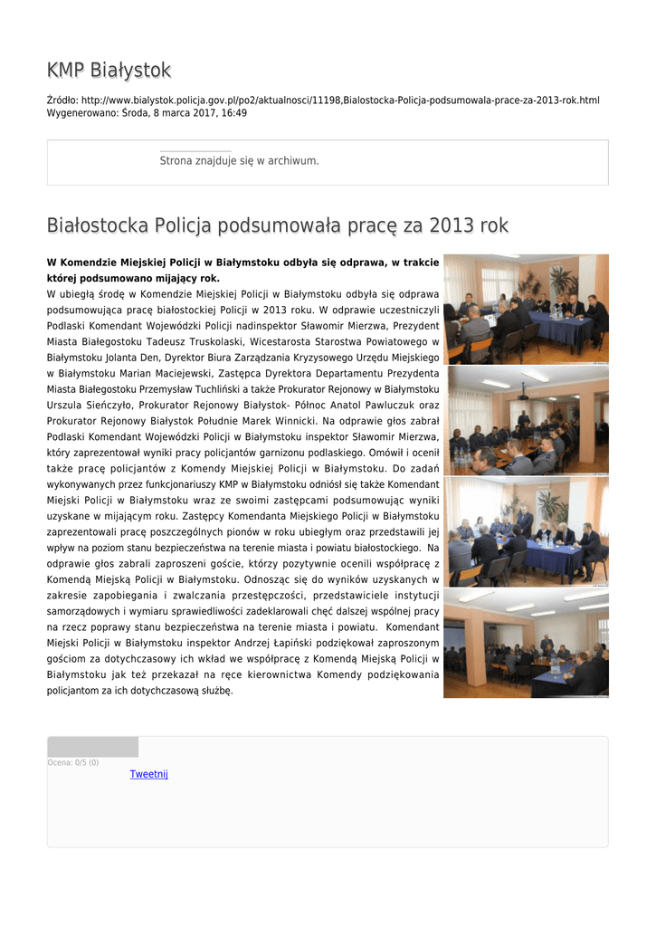 KMP Białystok Źródło: http://www.bialystok.policja.gov.pl/po2/aktualnosci/11198,Bialostocka-Policja-podsumowala-prace-za-2013-rok.html Wygenerowano: Środa, 8 marca 2017, 16:49 Strona znajduje się w archiwum. Białostocka Policja podsumowała pracę za 2013 rok W Komendzie Miejskiej Policji w Białymstoku odbyła się odprawa, w trakcie której podsumowano mijający rok. W ubiegłą środę w Komendzie Miejskiej Policji w Białymstoku odbyła się odprawa podsumowująca pracę białostockiej Policji w 2013 roku. W odprawie uczestniczyli Podlaski Komendant Wojewódzki Policji nadinspektor Sławomir Mierzwa, Prezydent Miasta Białegostoku Tadeusz Truskolaski, Wicestarosta Starostwa Powiatowego w Białymstoku Jolanta Den, Dyrektor Biura Zarządzania Kryzysowego Urzędu Miejskiego w Białymstoku Marian Maciejewski, Zastępca Dyrektora Departamentu Prezydenta Miasta Białegostoku Przemysław Tuchliński a także Prokurator Rejonowy w Białymstoku Urszula Sieńczyło, Prokurator Rejonowy Białystok- Północ Anatol Pawluczuk oraz Prokurator Rejonowy Białystok Południe Marek Winnicki. Na odprawie głos zabrał Podlaski Komendant Wojewódzki Policji w Białymstoku inspektor Sławomir Mierzwa, który zaprezentował wyniki pracy policjantów garnizonu podlaskiego. Omówił i ocenił także pracę policjantów z Komendy Miejskiej Policji w Białymstoku. Do zadań wykonywanych przez funkcjonariuszy KMP w Białymstoku odniósł się także Komendant Miejski Policji w Białymstoku wraz ze swoimi zastępcami podsumowując wyniki uzyskane w mijającym roku. Zastępcy Komendanta Miejskiego Policji w Białymstoku zaprezentowali pracę poszczególnych pionów w roku ubiegłym oraz przedstawili jej wpływ na poziom stanu bezpieczeństwa na terenie miasta i powiatu białostockiego. Na odprawie głos zabrali zaproszeni goście, którzy pozytywnie ocenili współpracę z Komendą Miejską Policji w Białymstoku. Odnosząc się do wyników uzyskanych w zakresie zapobiegania i zwalczania przestępczości, przedstawiciele instytucji samorządowych i wymiaru sprawiedliwości zadeklarowali chęć dalszej wspólnej pracy na rzecz poprawy stanu bezpieczeństwa na terenie miasta i powiatu. Komendant Miejski Policji w Białymstoku inspektor Andrzej Łapiński podziękował zaproszonym gościom za dotychczasowy ich wkład we współpracę z Komendą Miejską Policji w Białymstoku jak też przekazał na ręce kierownictwa Komendy podziękowania policjantom za ich dotychczasową służbę. Ocena: 0/5 (0) Tweetnij