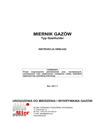 MIERNIK GAZÓW Typ GasHunter INSTRUKCJA OBSŁUGI !!!UWAGA!!! Przed rozpoczęciem jakichkolwiek prac montażowych, serwisowych oraz użytkowania urządzenia należy dokładnie zapoznać się z poniższą instrukcją. Rev. GH.1.7 SPIS TREŚCI OSTRZEŻENIA I ŚRODKI OSTROŻNOŚCI .......................................................................... 3 PRZEZNACZENIE MIERNIKA .............................................................................................. 6 OGÓLNA CHARAKTERYSTYKA .......................................................................................... 6 ROZPAKOWANIE PRZYRZĄDU .......................................................................................... 6 OBSŁUGA MIERNIKA ........................................................................................................... 7 Włączanie i wyłączanie miernika ........................................................................................ 7 Tryb pomiarowy ................................................................................................................. 8 Podstawowe funkcje miernika ............................................................................................ 8 Wyświetlanie wartości chwilowych ................................................................................. 8 Automatyczne zerowanie wskazań (autozerowanie) ...................................................... 9 Wskaźnik naładowania baterii zasilającej ....................................................................... 9 Podświetlenie wyświetlacza ........................................................................................... 9 Sygnalizacja przekroczeń progów alarmowych (alarmów) .............................................. 9 Wyświetlanie temperatury otoczenia .............................................................................10 Wyświetlanie daty, czasu oraz czasu pracy miernika ....................................................10 Wyświetlanie wartości maksymalnych ...........................................................................10 Wyświetlanie wartości minimalnych ...............................................................................11 Wyświetlanie wartości średnich ważonych ....................................................................11 Pamięć wartości cząstkowych oraz pamięć zdarzeń .....................................................11 Zaawansowane funkcje miernika ......................................................................................11 Ustawianie wartości progów alarmowych ......................................................................12 Ustawianie zegara .........................................................................................................13 Ustawienia opcji pamięci wewnętrznej...........................................................................14 Zmiana hasła użytkownika ............................................................................................15 Automatyczne zerowanie wskazań (autozerowanie) .....................................................16 Kalibracja miernika ........................................................................................................16 Konfiguracja miernika – wybór języka (dostępne od wersji oprogramowania GH.3.0) ...17 Współpraca z przystawką do pomiarów przepływowych ...................................................17 Współpraca z komputerem ...............................................................................................18 ZALECENIA EKSPLOATACYJNE ........................................................................................18 Ładowanie akumulatorów zasilających .............................................................................18 Czyszczenie przyrządu .....................................................................................................19 Okresowe przeglądy kalibracyjne i serwisowe ..................................................................19 PODSTAWOWE PARAMETRY TECHNICZNE ....................................................................19 SPECYFIKACJA CZUJNIKÓW POMIAROWYCH ................................................................20 CZUŁOŚCI WZGLĘDNE CZUJNIKA KATALITYCZNEGO ...................................................20 CZUŁOŚCI WZGLĘDNE CZUJNIKÓW ELEKTROCHEMICZNYCH.....................................21 NAJWYŻSZE DOPUSZCZALNE STĘŻENIA I GRANICE WYBUCHOWOŚCI W POWIETRZU WYBRANYCH GAZÓW I PAR .......................................................................24 TYPOWE USTERKI I SPOSOBY ICH USUWANIA ..............................................................26 WYKAZ CZĘŚĆI ZAMIENNYCH I OPCJONALNYCH ..........................................................27 2 OSTRZEŻENIA I ŚRODKI OSTROŻNOŚCI Niewłaściwe wykonywanie niektórych procedur lub wykonywanie ich w niewłaściwych warunkach może wpływać na pracę urządzenia. W celu zapewnienia pełnego bezpieczeństwa i odpowiednich parametrów miernika proszę dokładnie przeczytać i zapoznać się z poniższymi procedurami i ostrzeżeniami. Urządzenie powinno być obsługiwane i serwisowane wyłącznie przez wykwalifikowany personel. Przed rozpoczęciem użytkowania urządzenia należy bezwzględnie przeczytać i zapoznać się z poniższą instrukcją obsługi. Miernik należy użytkować zgodnie z przeznaczeniem, instrukcjami, zaleceniami i procedurami zawartymi w poniższej instrukcji, w przeciwnym razie urządzenie może działać nieprawidłowo. Urządzenie zawiera ogniwa akumulatorowe, które są integralną częścią miernika. Podczas złomowania miernika ogniwa akumulatorowe należy przekazać do utylizacji odpowiednim, wyspecjalizowanym firmom. Zabrania się samodzielnej naprawy miernika lub wymiany jego podzespołów, gdyż może to doprowadzić do zmniejszenia lub całkowitej utraty budowy przeciwwybuc