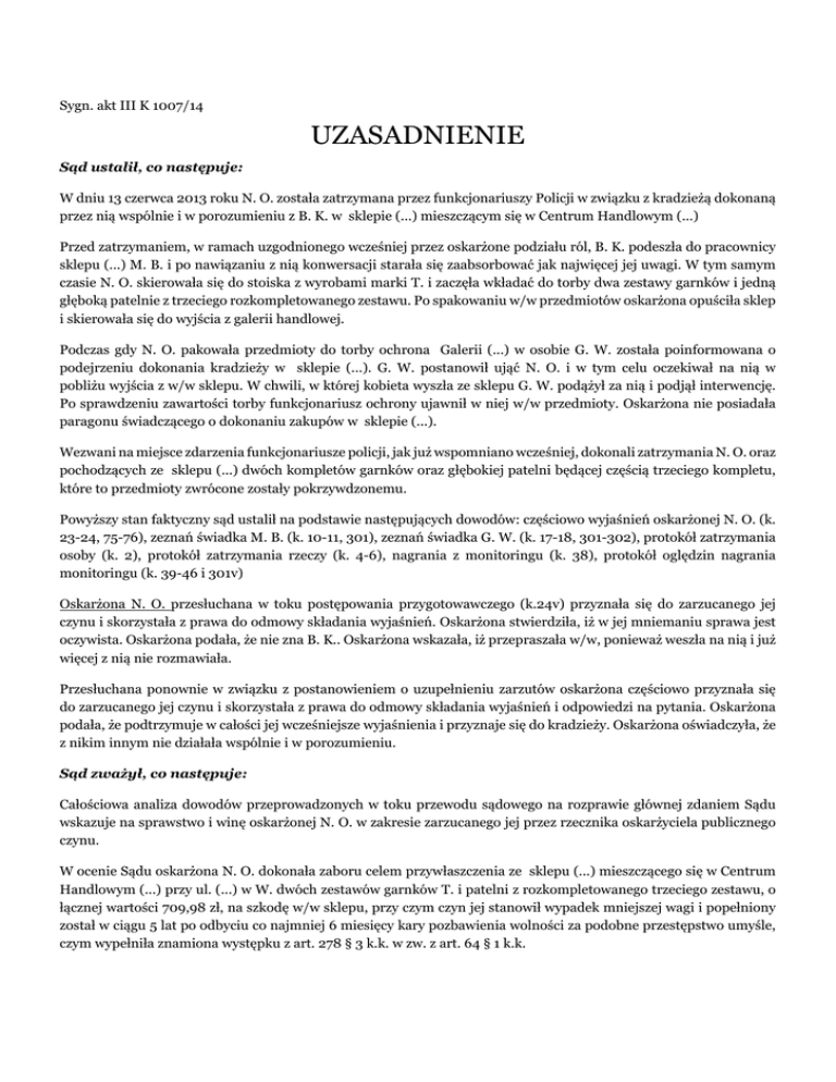 Sygn. akt III K 1007/14 UZASADNIENIE Sąd ustalił, co następuje: W dniu 13 czerwca 2013 roku N. O. została zatrzymana przez funkcjonariuszy Policji w związku z kradzieżą dokonaną przez nią wspólnie i w porozumieniu z B. K. w sklepie (...) mieszczącym się w Centrum Handlowym (...) Przed zatrzymaniem, w ramach uzgodnionego wcześniej przez oskarżone podziału ról, B. K. podeszła do pracownicy sklepu (...) M. B. i po nawiązaniu z nią konwersacji starała się zaabsorbować jak najwięcej jej uwagi. W tym samym czasie N. O. skierowała się do stoiska z wyrobami marki T. i zaczęła wkładać do torby dwa zestawy garnków i jedną głęboką patelnie z trzeciego rozkompletowanego zestawu. Po spakowaniu w/w przedmiotów oskarżona opuściła sklep i skierowała się do wyjścia z galerii handlowej. Podczas gdy N. O. pakowała przedmioty do torby ochrona Galerii (...) w osobie G. W. została poinformowana o podejrzeniu dokonania kradzieży w sklepie (...). G. W. postanowił ująć N. O. i w tym celu oczekiwał na nią w pobliżu wyjścia z w/w sklepu. W chwili, w której kobieta wyszła ze sklepu G. W. podążył za nią i podjął interwencję. Po sprawdzeniu zawartości torby funkcjonariusz ochrony ujawnił w niej w/w przedmioty. Oskarżona nie posiadała paragonu świadczącego o dokonaniu zakupów w sklepie (...). Wezwani na miejsce zdarzenia funkcjonariusze policji, jak już wspomniano wcześniej, dokonali zatrzymania N. O. oraz pochodzących ze sklepu (...) dwóch kompletów garnków oraz głębokiej patelni będącej częścią trzeciego kompletu, które to przedmioty zwrócone zostały pokrzywdzonemu. Powyższy stan faktyczny sąd ustalił na podstawie następujących dowodów: częściowo wyjaśnień oskarżonej N. O. (k. 23-24, 75-76), zeznań świadka M. B. (k. 10-11, 301), zeznań świadka G. W. (k. 17-18, 301-302), protokół zatrzymania osoby (k. 2), protokół zatrzymania rzeczy (k. 4-6), nagrania z monitoringu (k. 38), protokół oględzin nagrania monitoringu (k. 39-46 i 301v) Oskarżona N. O. przesłuchana w toku postępowania przygotowawczego (k.24v) przyznała się do zarzucanego jej czynu i skorzystała z prawa do odmowy składania wyjaśnień. Oskarżona stwierdziła, iż w jej mniemaniu sprawa jest oczywista. Oskarżona podała, że nie zna B. K.. Oskarżona wskazała, iż przepraszała w/w, ponieważ weszła na nią i już więcej z nią nie rozmawiała. Przesłuchana ponownie w związku z postanowieniem o uzupełnieniu zarzutów oskarżona częściowo przyznała się do zarzucanego jej czynu i skorzystała z prawa do odmowy składania wyjaśnień i odpowiedzi na pytania. Oskarżona podała, że podtrzymuje w całości jej wcześniejsze wyjaśnienia i przyznaje się do kradzieży. Oskarżona oświadczyła, że z nikim innym nie działała wspólnie i w porozumieniu. Sąd zważył, co następuje: Całościowa analiza dowodów przeprowadzonych w toku przewodu sądowego na rozprawie głównej zdaniem Sądu wskazuje na sprawstwo i winę oskarżonej N. O. w zakresie zarzucanego jej przez rzecznika oskarżyciela publicznego czynu. W ocenie Sądu oskarżona N. O. dokonała zaboru celem przywłaszczenia ze sklepu (...) mieszczącego się w Centrum Handlowym (...) przy ul. (...) w W. dwóch zestawów garnków T. i patelni z rozkompletowanego trzeciego zestawu, o łącznej wartości 709,98 zł, na szkodę w/w sklepu, przy czym czyn jej stanowił wypadek mniejszej wagi i popełniony został w ciągu 5 lat po odbyciu co najmniej 6 miesięcy kary pozbawienia wolności za podobne przestępstwo umyśle, czym wypełniła znamiona występku z art. 278 § 3 k.k. w zw. z art. 64 § 1 k.k. Sąd uznał przyznanie się oskarżonej O. do zarzucanego jej czynu za wiarygodne, albowiem koresponduje ono z zeznaniami G. W. oraz M. B.. Wyjaśnienia te korespondowały również z pozostałym materiałem dowodowym zebranym w sprawie w postaci protokołu zatrzymania rzeczy i dokonanych oględzin monitoringu (k.39-46 i 301v). Odnosząc się do twierdzeń oskarżonej, w których zaprzeczała sprawstwu B. K., Sąd uznał je za niewiarygodne. Sąd miał na uwadze, iż w praktyce procesowej nierzadko spotykana jest sytuacja, gdy jeden ze sprawców, usiłuje odciążyć drugiego i to właśnie, zdaniem Sądu, było przyczyną nieprawdziwej depozycji oskarżonej. W tym miejscu wskazać należy, iż z zeznań G. W. bezsprzecznie wynika, iż widział jak obydwie oskarżone rozmawiając ze sobą wchodziły do sklepu (...), a następnie weszły razem do sklepu (...). Zachowanie opisane przez świadka wskazuje, iż oskarżone miały z góry przyjęty plan działania, albowiem dopiero po wejściu do sklepu (...) oskarżone zaczęły udawać, że się nie znają. Ponadto w sklepie (...) kobiety uzyskały torbę na zakupy, do której N. O. spakowała później skradzione przedmioty. Obie oskarżone ponadto pochodzą z W. oraz znają się ze sobą o czym świadczy wydruk stron z portalu F., które zostały załączone do akt. Z uwagi na powyższe Sąd uznał za niewiarygodne słowa oskarżonej, w których stwierdziła, iż rozmawiając z B. K. ograniczyła się jedynie do jej przeproszenia, ponieważ wcześniej na nią weszła. Sąd miał na uwadze, że twierdzenia te sprzeczne są z zasadami doświadczenia życiowego i logicznego rozumowania, gdyż przeproszenie kogoś za swoje zachowanie jest krótszą formą wypowiedzi niż ta opisana przez świadka. Co więcej za przyjęciem sprawstwa B. K. przemawiają także zeznania M. B., która stwierdziła, iż odniosła wrażenie, że kobieta, która z nią rozmawiała robiła wszystko by odwrócić jej uwagę. Przyczyny, które legły u podstaw uznania za niewiarygodne części wyjaśnień N. O. zaważyły również na ocenie wyjaśnień współoskarżonej B. K., która stwierdziła, że nie zna drugiej współoskarżonej i nie uczestniczyła w jakiejkolwiek kradzieży. Oskarżona oświadczyła również, że w dniu, w którym doszło do przestępstwa przy