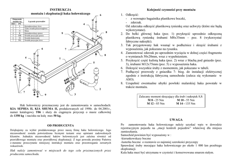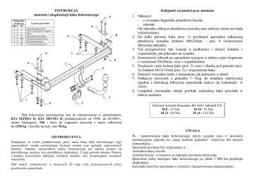 INSTRUKCJA montaŜu i eksploatacji haka holowniczego Oznaczenie zacisku wg ISO PN 1 L 2 + 3 31 4 R 5 58R 6 54 7 58L Kolejność czynności przy montaŜu 6 Łączenie przewodów 4 Kierunkowskazy lewe Tylne światła przeciwmgłowe Masa Kierunkowskazy prawe Światła pozycyjne prawe Światła hamowania Światła pozycyjne lewe 8 9 6 7 8 4 1 5 2 7 3 9 Hak holowniczy przeznaczony jest do zamontowania w samochodach: KIA SEPHIA II, KIA SHUMA II, produkowanych od 1998r. do 04.2001r., numer katalogowy T06 i słuŜy do ciągnięcia przyczep o masie całkowitej do 1350 kg i nacisku na kulę max 50 kg. 1. Odkręcić: - z wewnątrz bagaŜnika plastikowe boczki, - zderzak. Od zderzaka odkręcić plastikową rynienkę oraz uchwyty (które nie będą wykorzystane). 2. Do belki głównej haka (poz. 1) przykręcić uprzednio odkręconą plastikową rynienkę śrubami M8x35mm – poz. 8 (wykorzystać fabryczne nakrętki). 3. Tak przygotowany hak wsunąć w podłuŜnice i skręcić śrubami z wyposaŜenia, jak pokazano na rysunku. 4. Zamontować zderzak po uprzednim wycięciu w dolnej części fragmentu o wymiarach 50x20mm, wraz z wypełnieniem. 5. Przykręcić część kulistą haka (poz. 2) wraz z blachą pod gniazdo (poz. 3), śrubami M12x75mm (poz. 5) z wyposaŜenia haka. 6. Dokręcić wszystkie śruby z momentem, jak pokazano w tabeli. 7. Podłączyć przewody z gniazdka 7- bieg. do instalacji elektrycznej zgodnie z instrukcją fabryczną samochodu (zaleca się wykonanie w ASO). 8. Uzupełnić ewentualne ubytki powłoki malarskiej haka powstałe w trakcie montaŜu. Zalecany moment skręcający dla śrub i nakrętek 8,8: M 8 - 25 Nm M 10 - 55 Nm M 12 - 85 Nm M 14 - 135 Nm UWAGA OD PRODUCENTA Dziękujemy za wybór produkowanego przez naszą firmę haka holowniczego. Jego niezawodność została potwierdzona licznymi testami oraz opiniami zadowolonych klientów. JednakŜe niezawodność haków holowniczych jest zaleŜna równieŜ od prawidłowego montaŜu oraz prawidłowej eksploatacji. Z tego powodu prosimy Państwa o staranne przeczytanie niniejszej instrukcji montaŜu oraz przestrzeganie zawartych wskazówek. Hak naleŜy zamontować w miejscach do tego celu przeznaczonych przez producenta samochodu. Po zamontowaniu haka holowniczego naleŜy uzyskać wpis w dowodzie rejestracyjnym pojazdu na „stacji kontroli pojazdów” właściwej dla miejsca zamieszkania. Samochód powinien być wyposaŜony w : -kierunkowskazy boczne -lusterka boczne o rozstawie co najmniej szerokości przyczepy Sprawdzać śruby mocujące haka holowniczego po około 1 000 km przebiegu eksploatacji. Kula haka musi być utrzymana w czystości i konserwowana smarem stałym. PPUH AUTO-HAK S.J. WyposaŜenie haka: Produkcja Haków Holowniczych Henryk & Zbigniew Nejman 76-200 SŁUPSK ul. Słoneczna 16K tel/fax (059) 8-414-414; 8-414-413 email: [email protected] www. autohak.com.pl Hak holowniczy bez wyposaŜenia elektrycznego Klasa: A50-X Nr kat. T06 Przeznaczony do zamontowania w samochodzie: Producent: KIA Model: SEPHIA II Typ: 4drz. Model: SHUMA II Typ: 5drz. produkowanych od 1998r. do 04.2001r. KARTA GWARANCYJNA Dane techniczne: Wartość siły D: 7,6 kN maksymalna masa przyczepy: 1350 kg maksymalny nacisk na kulę: 50 kg Numer homologacji zgodnie z wytycznymi regulaminu EKG/ONZ 55.01: E20-55R-01 1402 Producent udziela gwarancji niniejszą kartą gwarancyjną na okres 24 miesięcy licząc od dnia zakupu haka holowniczego do samochodu: KIA SEPHIA II, 4 drz. KIA SHUMA II, 5 drz. produkowanych od 1998r. do 04.2001r. Data produkcji .............................. Data zakupu............................................. Zakres gwarancji obejmuje wyłącznie wady jakościowe wynikające z winy producenta. Gwarancja nie obejmuje natomiast uszkodzeń zawinionych przez nabywcę, wynikających z niewłaściwego montaŜu, uŜytkowania lub konserwacji, uszkodzeń mechanicznych, normalnego zuŜycia podczas eksploatacji itp. Gwarancja udzielona na zakupiony towar nie wyłącza, nie ogranicza ani nie zawiesza uprawnień kupującego wynikających z niezgodności towaru z umową. Reklamacje naleŜy zgłaszać w punkcie sprzedaŜy, składając jednocześnie kartę gwarancyjną. Usunięcie "wady" następuje po stwierdzeniu przez punkt sprzedaŜy wspólnie z producentem słuszności złoŜonej reklamacji. Reklamacja powinna być załatwiona w ciągu 14 dni od dnia uznania reklamacji. Karta gwarancyjna jest niewaŜna jeŜeli nie jest wypełniona i podpisana. Data zgłoszenia reklamacji: ................................................................... INFORMACJA WSTĘPNA Hak holowniczy jest skonstruowany zgodnie z zasadami bezpieczeństwa ruchu drogowego. Hak holowniczy jest elementem wpływającym na bezpieczeństwo jazdy i moŜe zostać zainstalowany wyłącznie przez personel wyspecjalizowany. Niedopuszczalne jest dokonywanie jakichkolwiek zmian w konstrukcji haka. Powoduje to wygaśniecie dopuszczenia do stosowania. W przypadku obecności masy izolacyjnej lub osłony podwozia w miejscu przylegania haka, naleŜy ją usunąć. Nieosłonięte miejsca karoserii oraz wywiercone otwory naleŜy pomalować farbą antykorozyjną. Informacjami wiąŜącymi odnośnie wartości obciąŜeń są dane podawane przez producenta samochodu, względnie wartości maksymalnej masy przyczepy oraz maksymalnego nacisku na kulę, przy czym wartości parametrów haka holowniczego nie mogą być przekroczone. Wzór do obliczania wartości siły D: Maks. masa przyczepy [kg] x Maks. masa samochodu [kg] Maks. masa przyczepy [kg] + Maks. masa samochodu [kg] X 9,81 = 1000 D [kN]